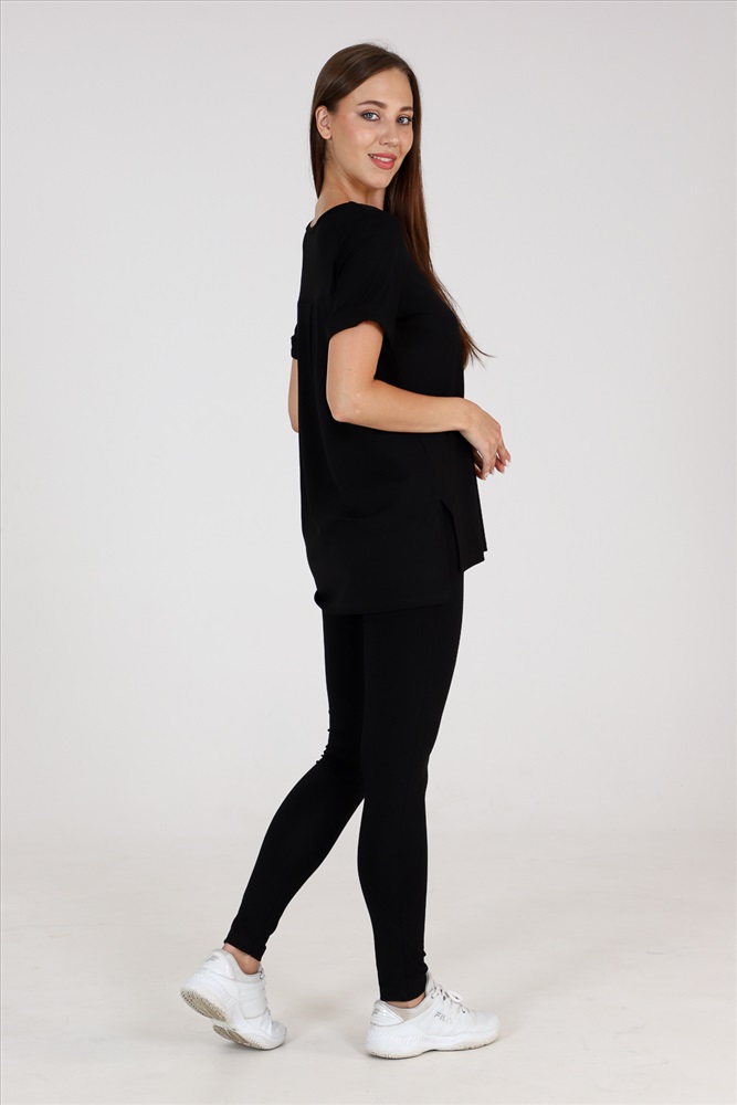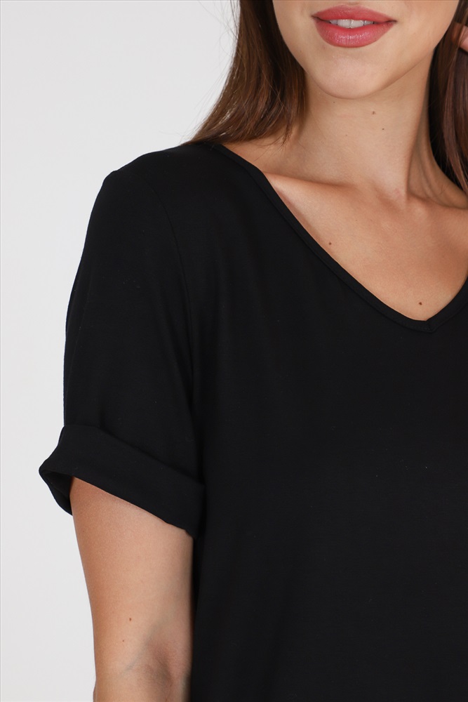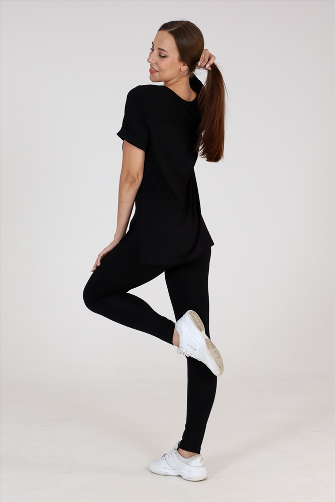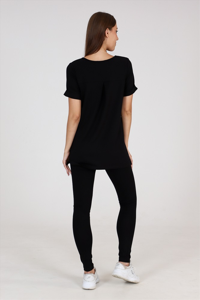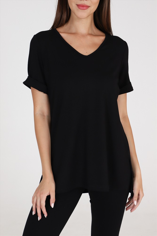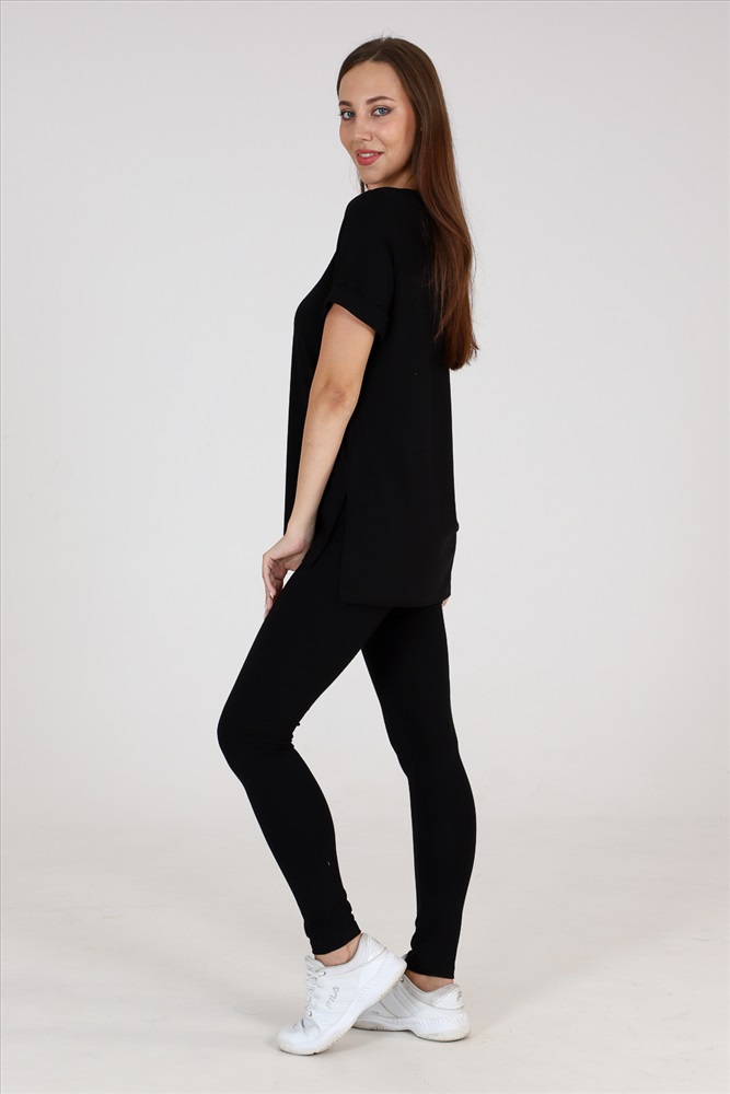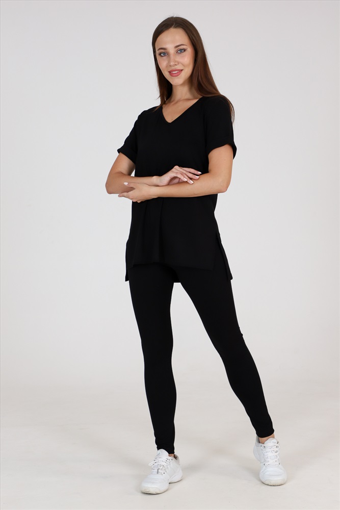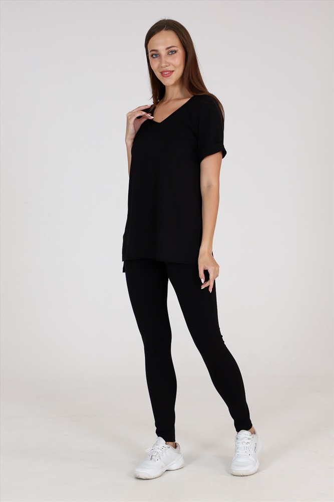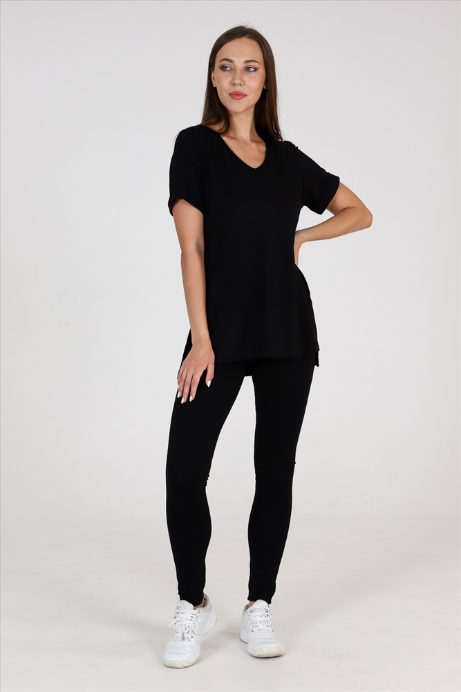 Застежка: без застежки Туника прямого силуэта, с V-образной горловиной, с разрезами в нижней части боковых швов. Спинка с кокеткой, удлиненная. Рукав втачной, короткий, с манжетом. Горловина обработана бейкой из основного полотна.