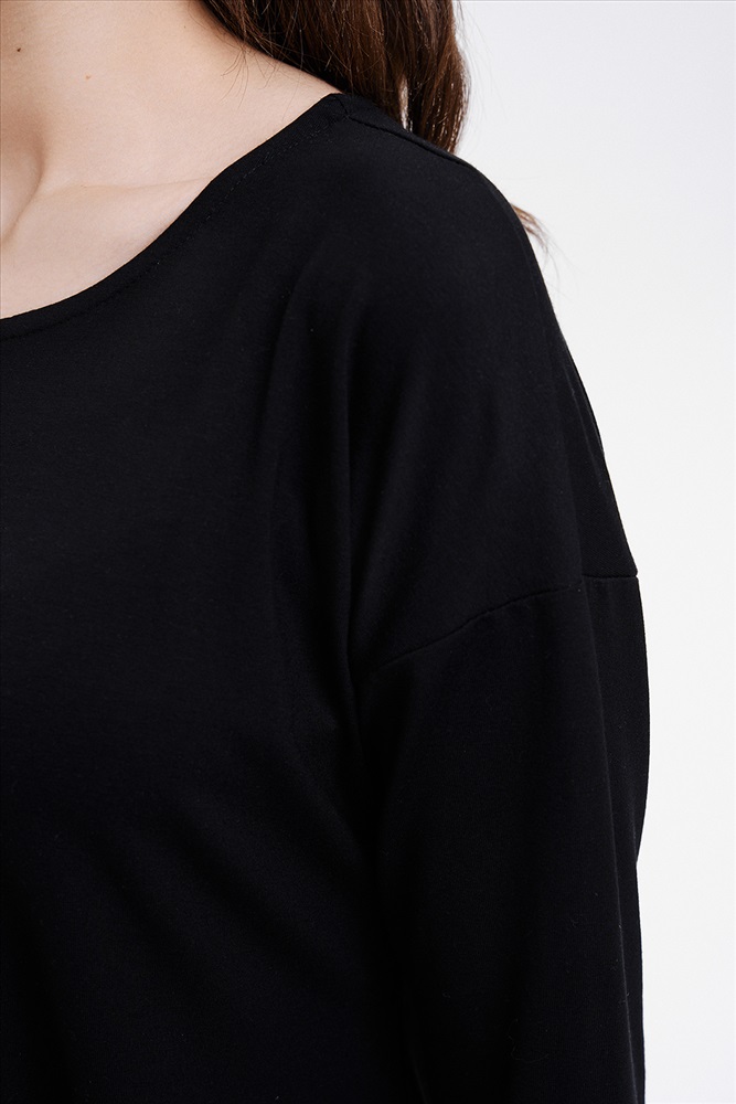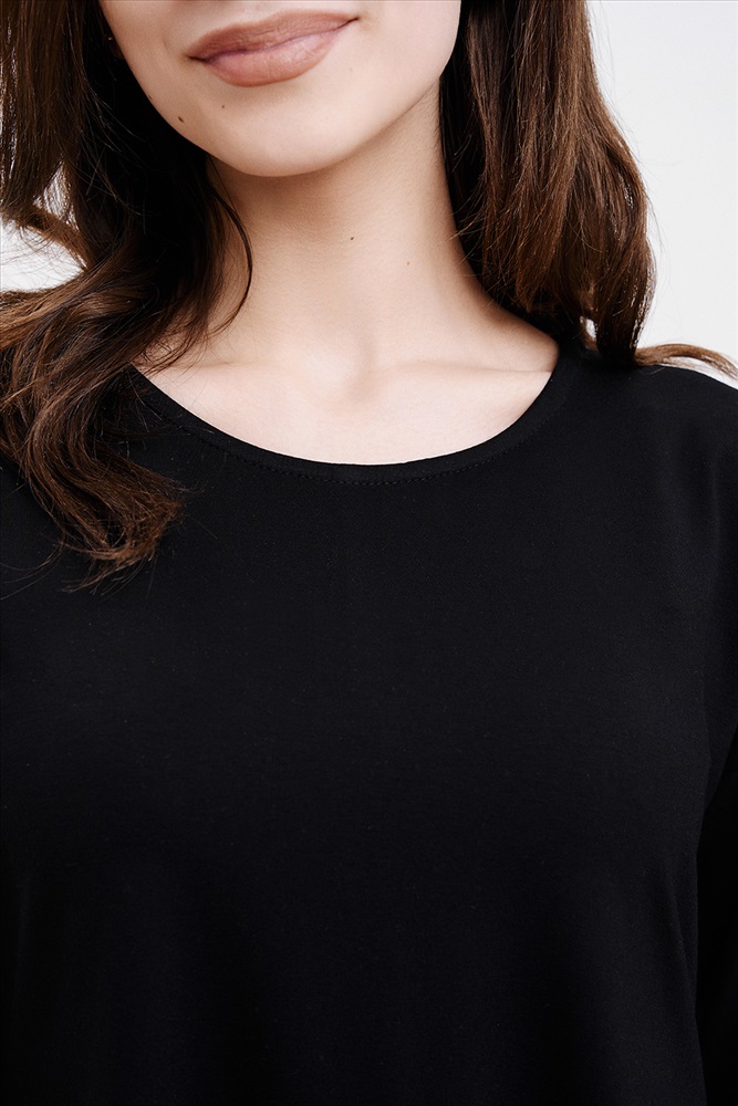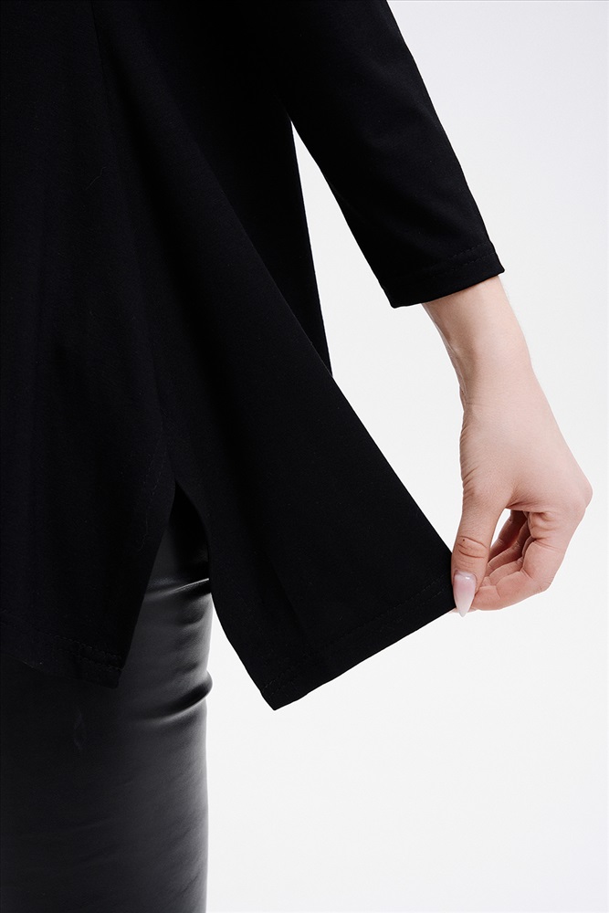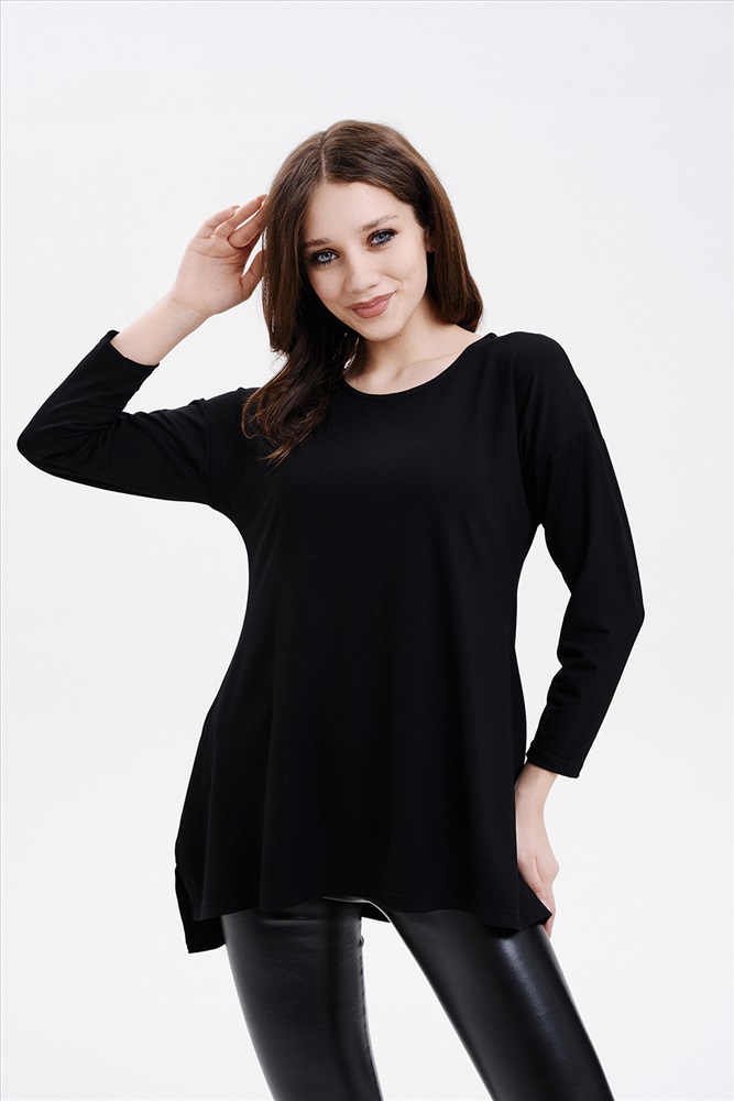 Застежка: без застежки Туника трапецивидного силуэта с расклешением от линии талии, с округлой горловиной, с фигурной линией низа, с разрезами в нижней части боковых швов. Спинка удлиненная. Рукав длинный. Горловина обработана бейкой из основного полотна.