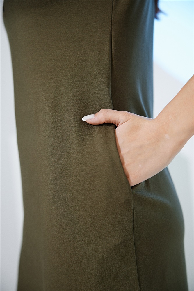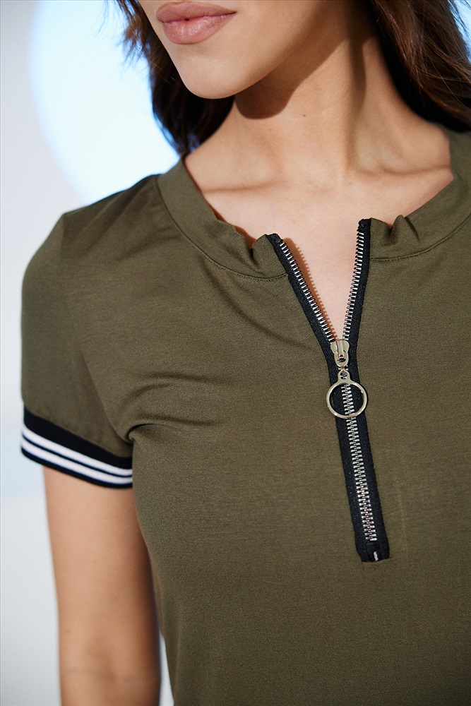 Застежка: молния Туника полуприлегающего силуэта, длиной выше колена, с округлой горловиной, с карманами в боковых швах. Рукав втачной, короткий, на манжете из эластичного полотна с контрастными полосками. В верхней части полочки расположена молния. В нижней части боковых швов обработаны разрезы. Горловина обработана обтачкой из основного полотна.