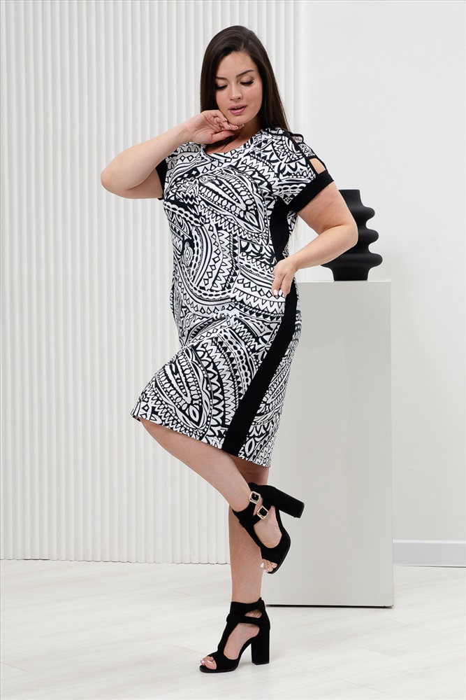 Застежка: без застежки Туника полуприлегающего силуэта, длинной ниже колена, с округлой горловиной, с боковыми карманами. Рукав реглан, короткий, на манжете из отделочного полотна. Вдоль рукава расположены фигурные элементы. Полочка с лампасами из отделочного полотна вдоль боковых швов. Горловина обработана обтачкой из основного полотна.