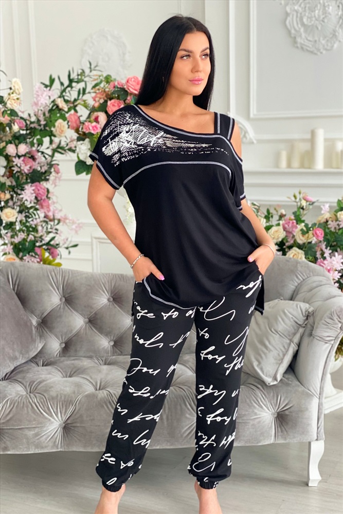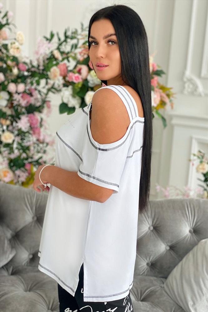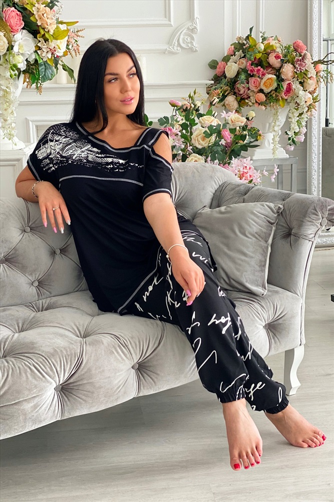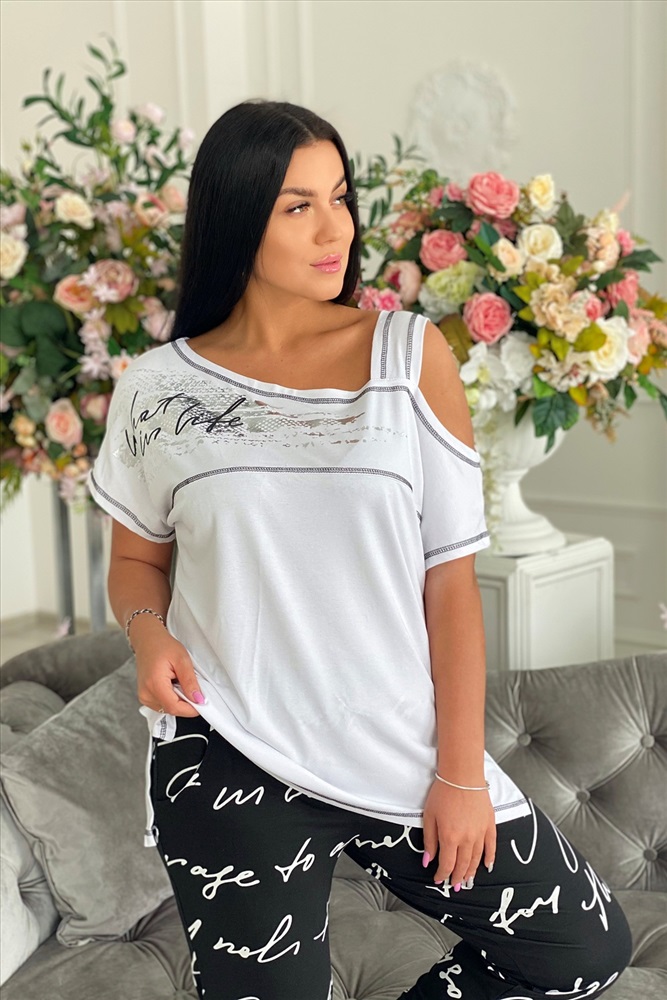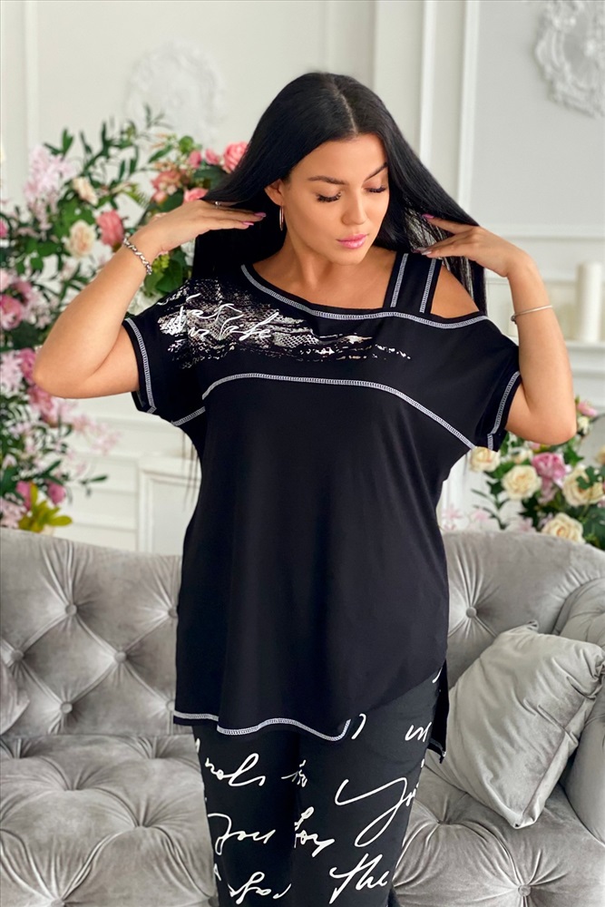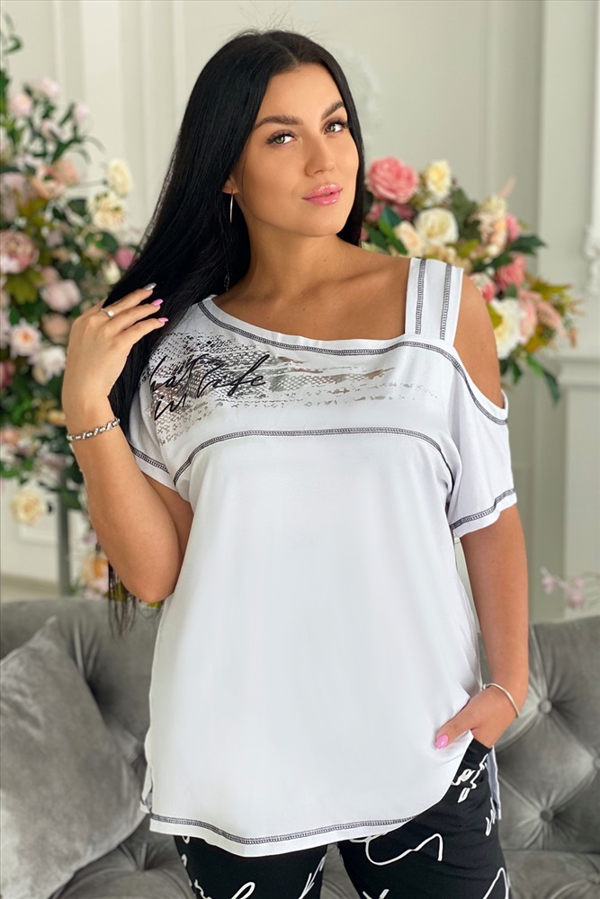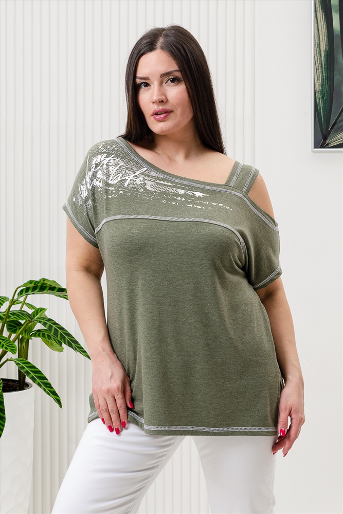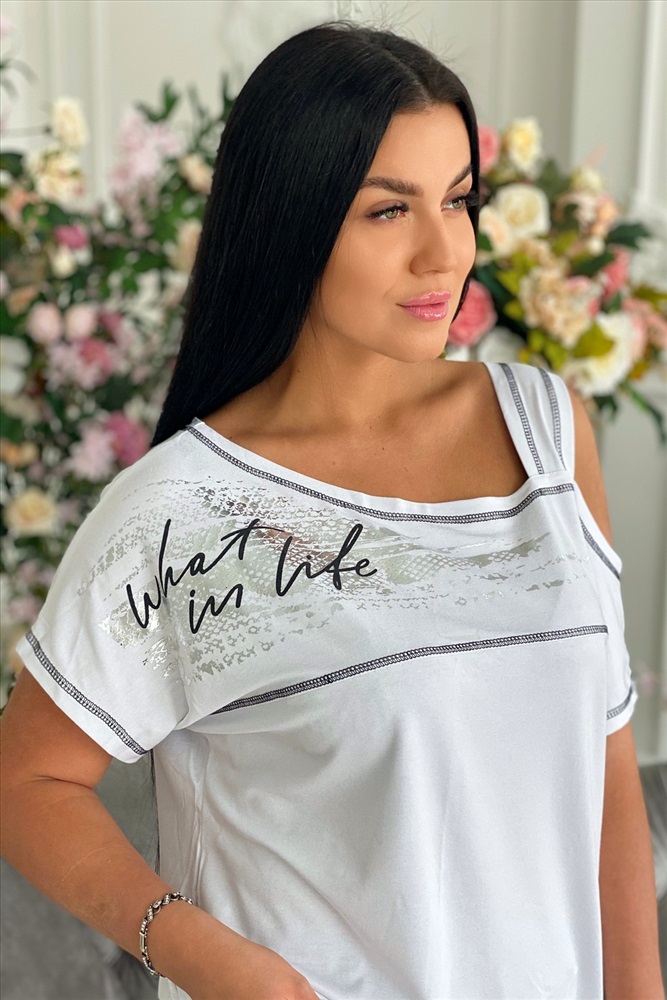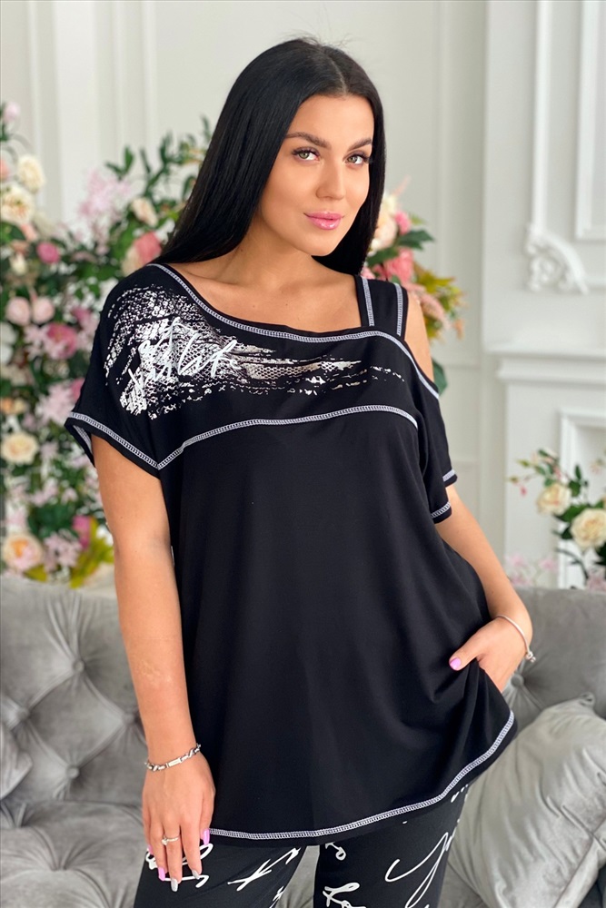 Застежка: без застежки Туника женская полуприлегающего силуэта. Рукав цельнокроенный короткий, с одной стороны бретель на плече, в боковых швах разрезы. В верхней части полочки модный принт.