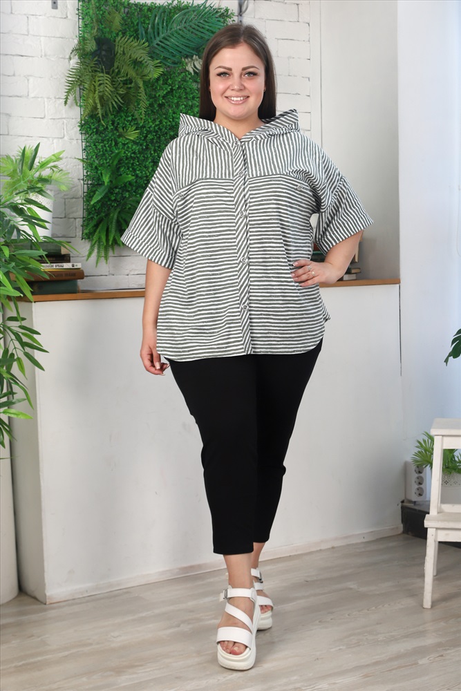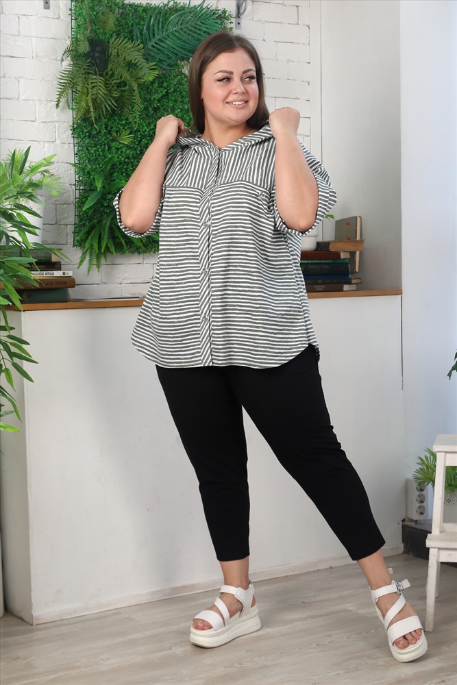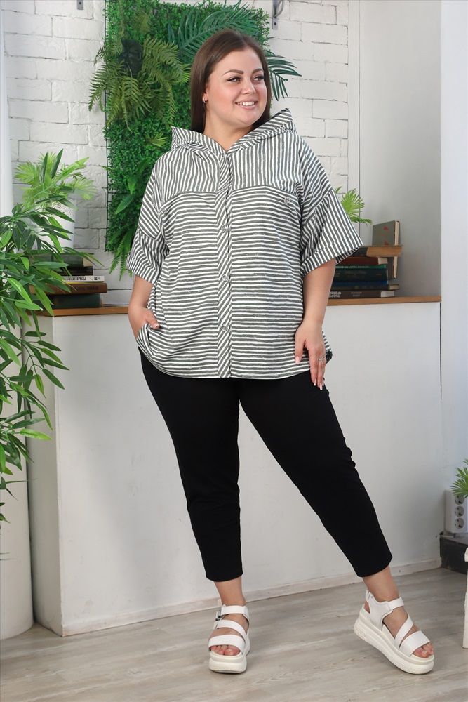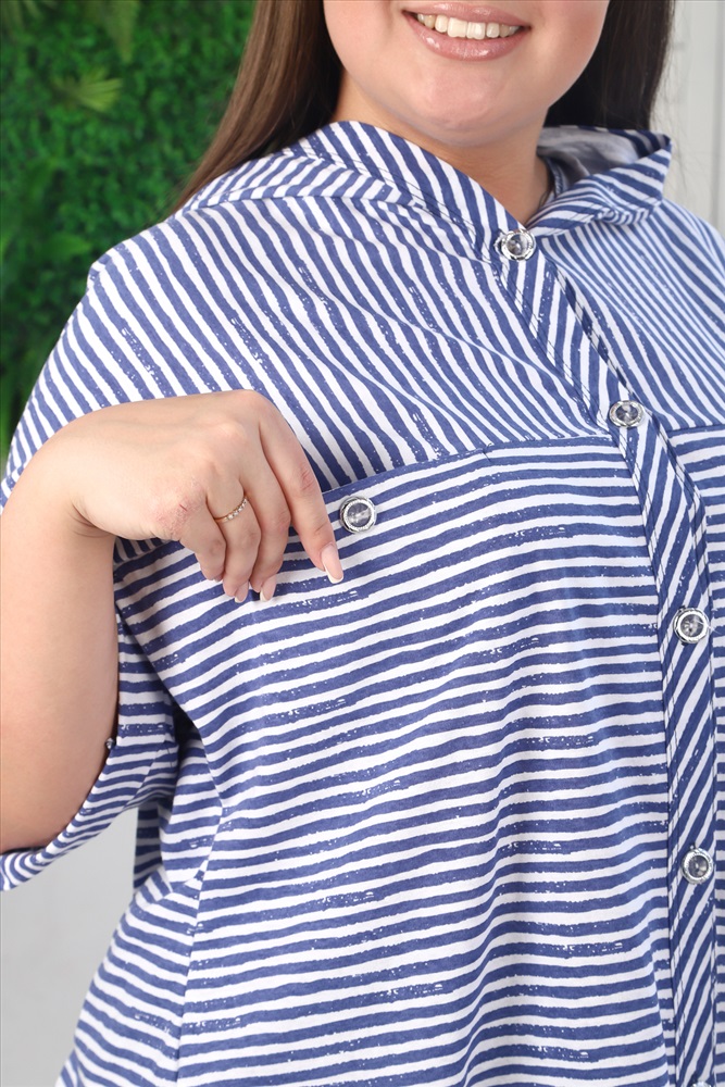 Застежка: пуговицы Туника женская, слегка расширенная к низу, с капюшоном. Застежка на петли пуговицы. Рукав со спущенной линией плеча, с цельнокроенной манжетой. На полочке и спинке кокетки. По линии притачивания кокетки полочки два внутренних кармана. Отлет капюшона и борт туники окантован широкой косой бейкой. Туника выполнена из актуальной ткани в полоску.