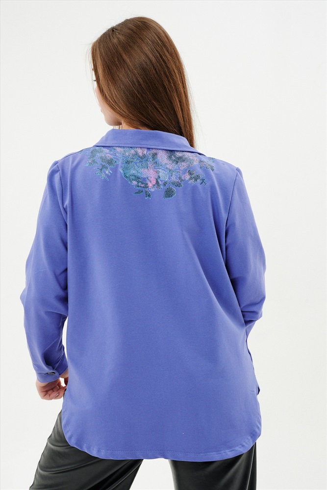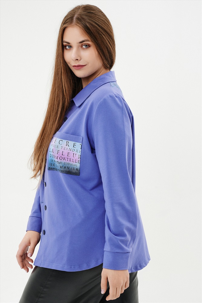 Застежка: пуговицы Туника женская прямого силуэта. Воротник отложной. Застежка на петли-пуговицы. Низ фигурный. Рукав втачной с манжетою. На левой части полочки нагрудный карман. Стилизованный принт в верхней части спинки, под воротником и на нагрудном кармане.