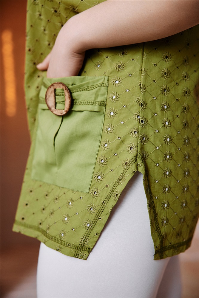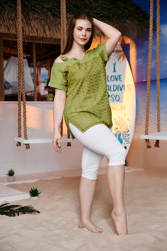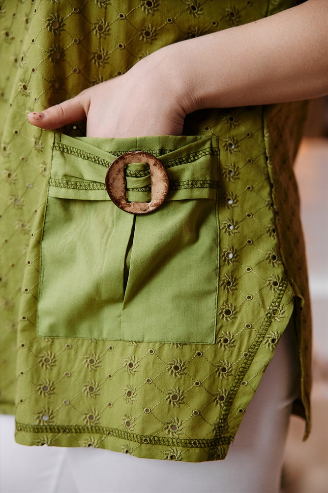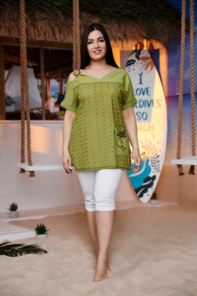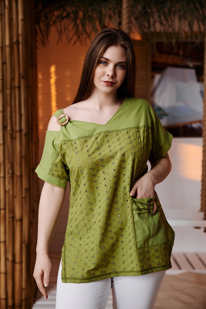 Застежка: без застежки Туника женская, полуприлегающего силуэта. Вырез асимметричный, с одной стороны бретель с кокосовой пуговицей. На полочке и спинке кокетка из отделочной ткани. Рукав цельнокроеный до локтя на манжете. На полочке накладной карман со складкой и декоративной пуговицей.