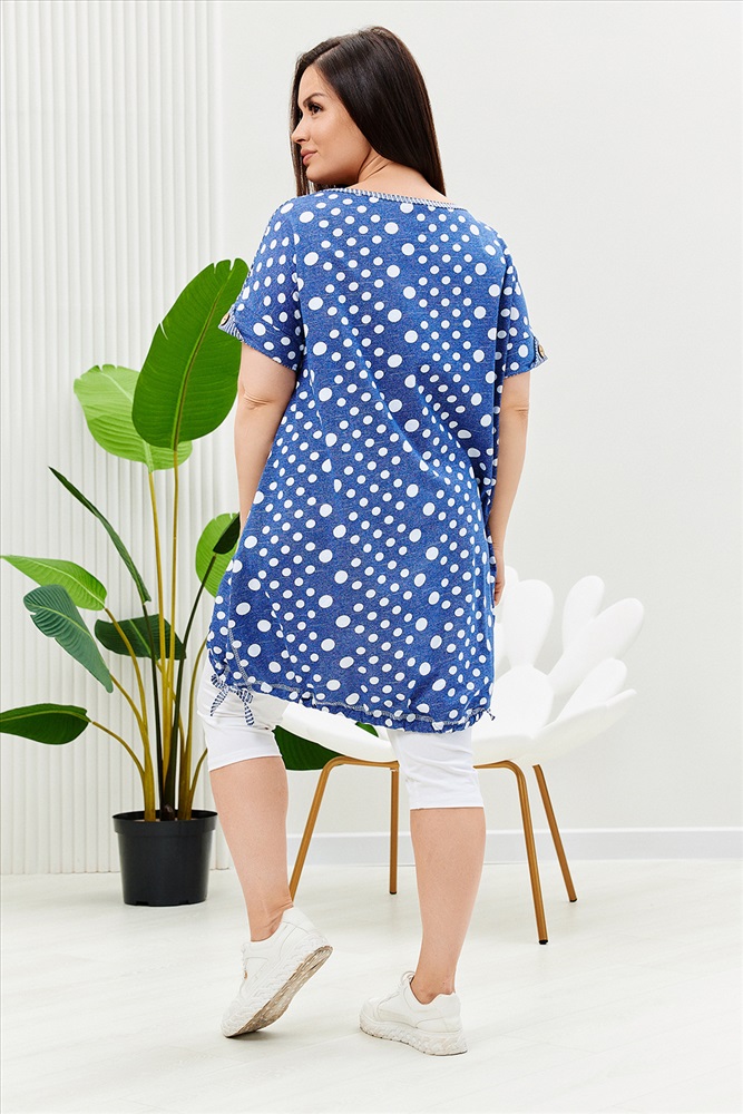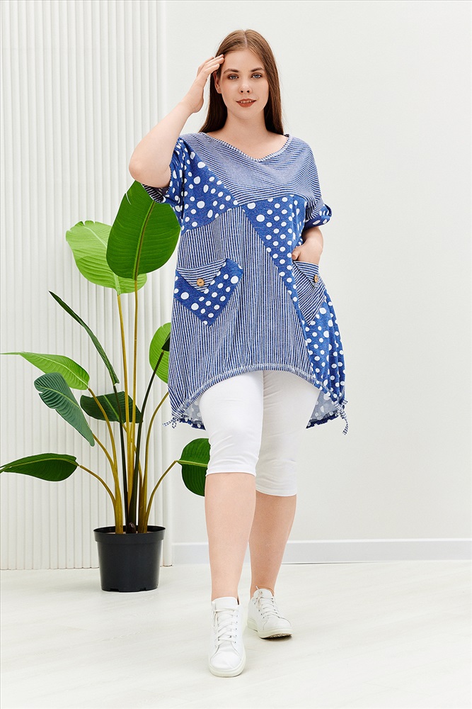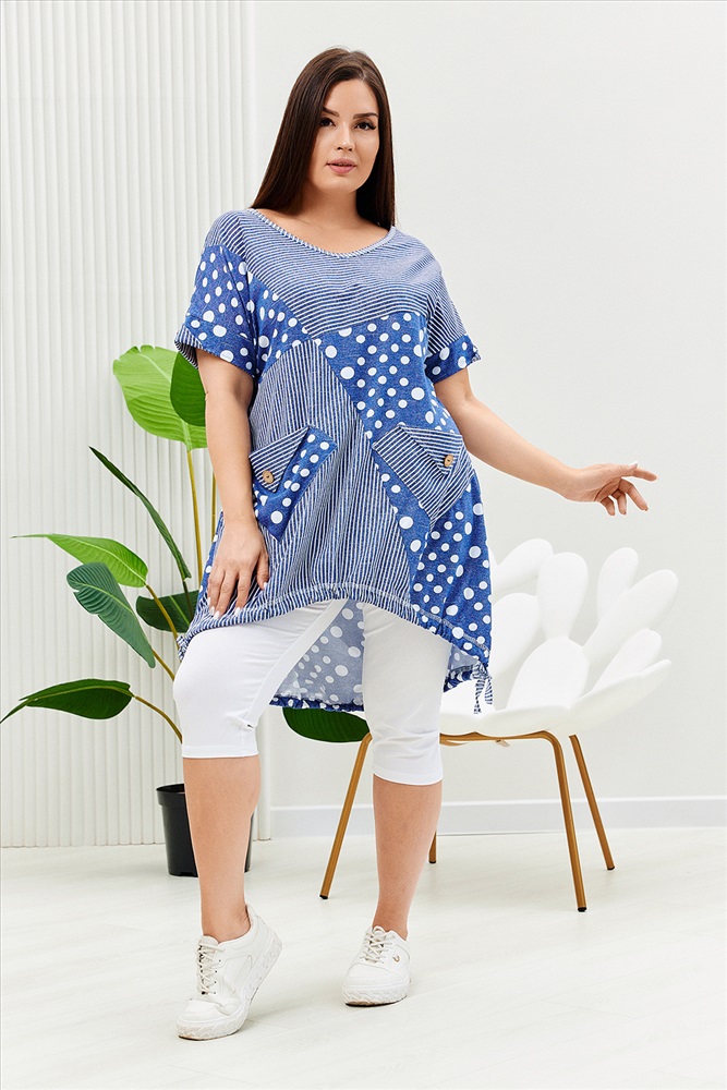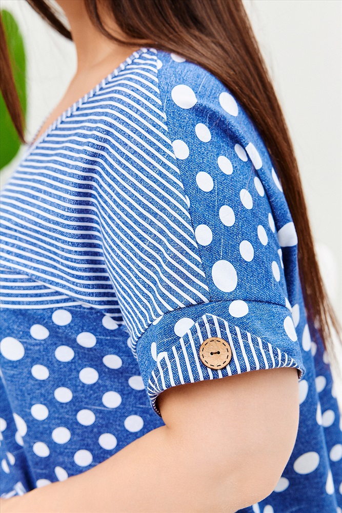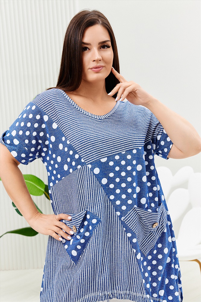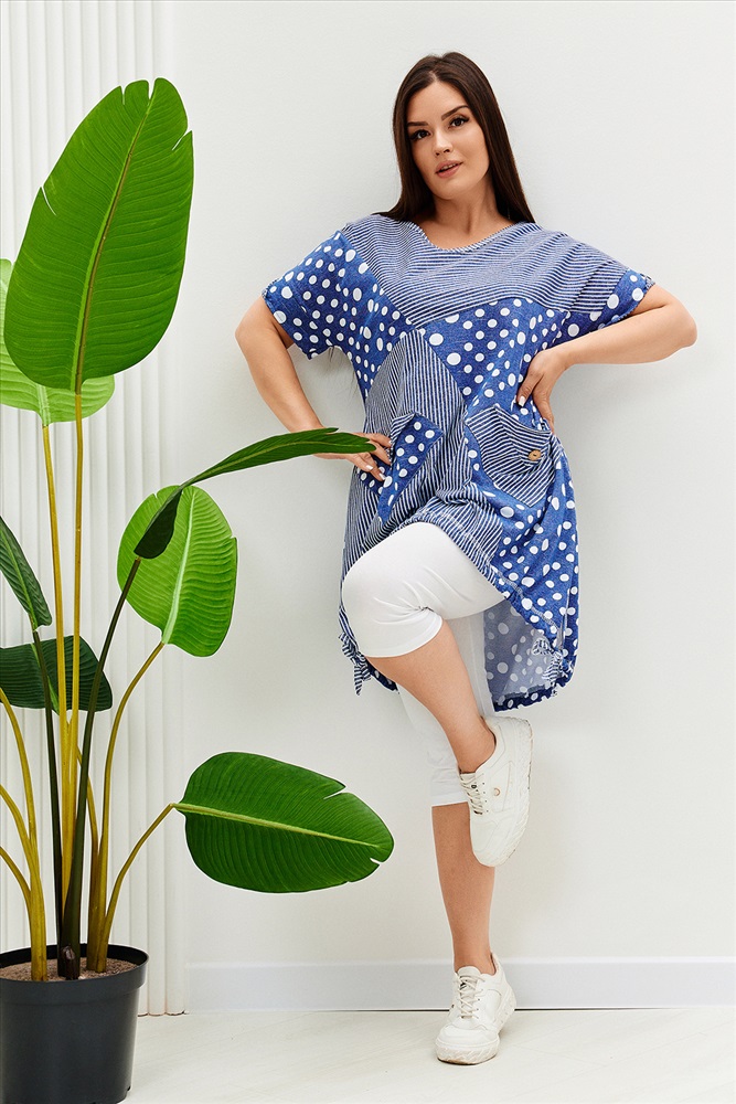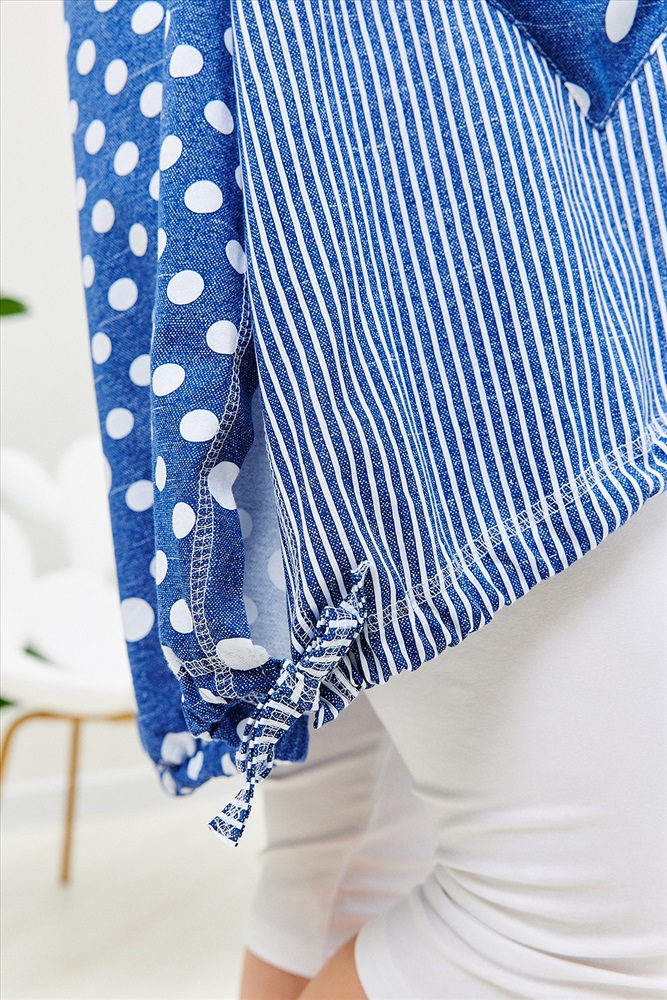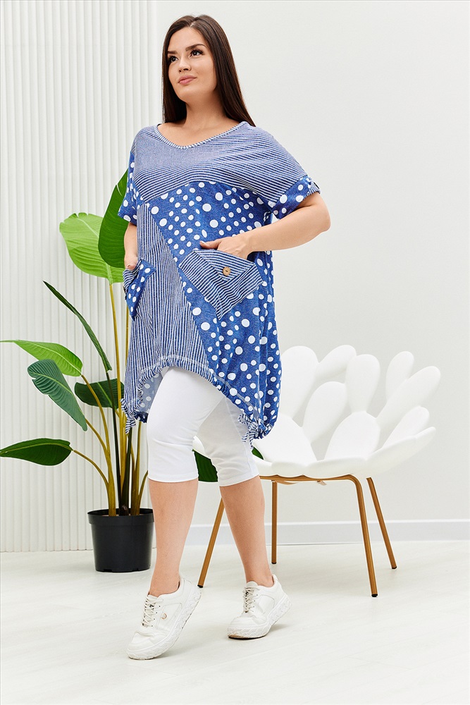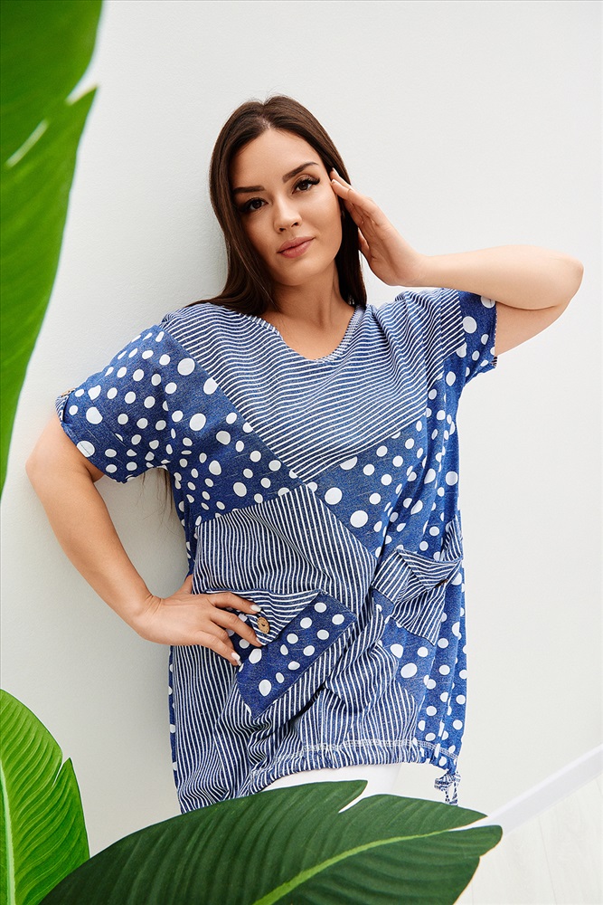 Застежка: без застежки Туника женская, к низу расширенная. Рукав короткий цельнокроенный с манжетой. Горловина Y-образная. Полочка состоит из четырех асимметричных частей, две части по диагонали из ткани в горошек, две другие - из мелкой полоски. Низ фигурный, фиксируется утяжками. По боковым швам разрезы. На полочках два накладных кармана, форма карманов квадраты, расположенные по диагонали, верхние уголки карманов зафиксированы декоративными пуговицами кокос. Также пуговицы пришиты на отогнутых уголках манжет. Сочетание тканей горошка и мелкой полосы придают изделию своеобразную особенность.