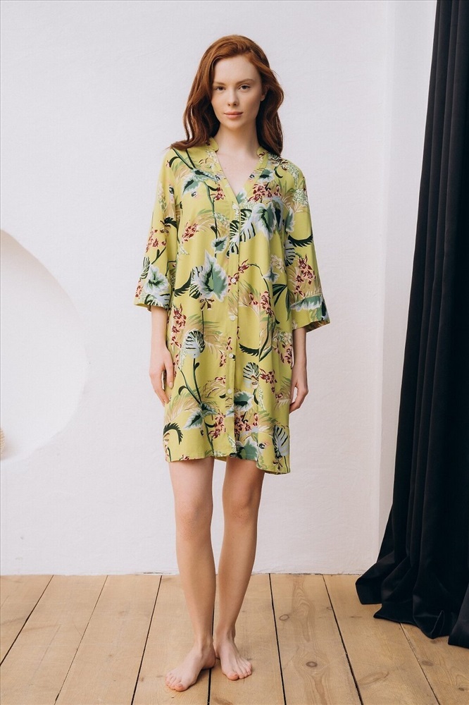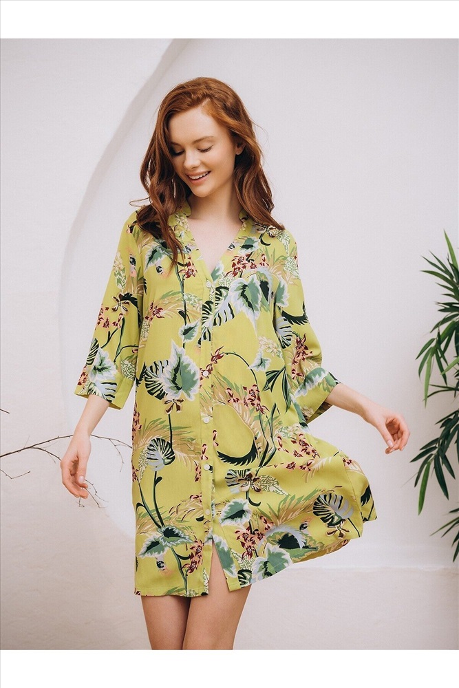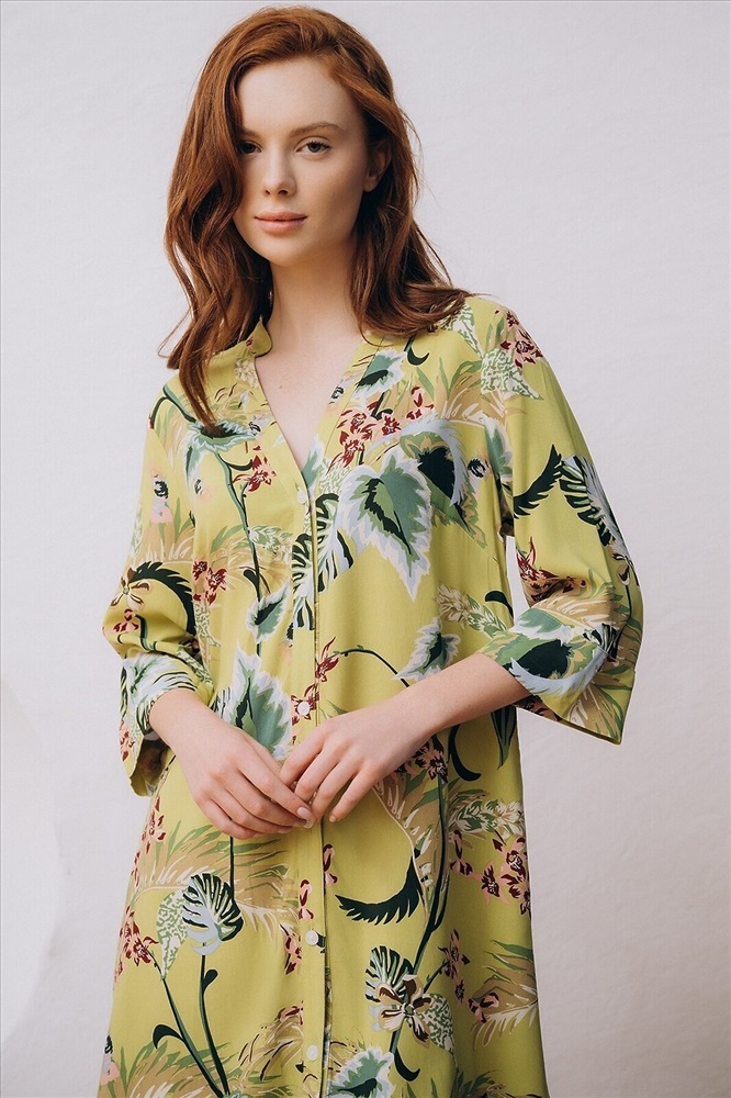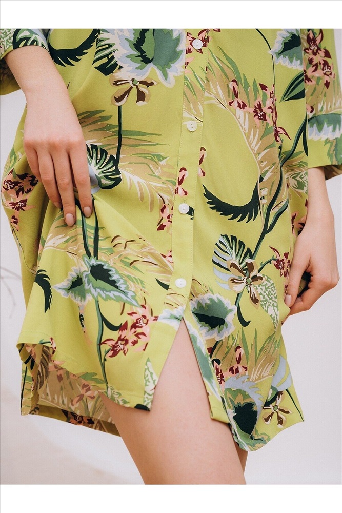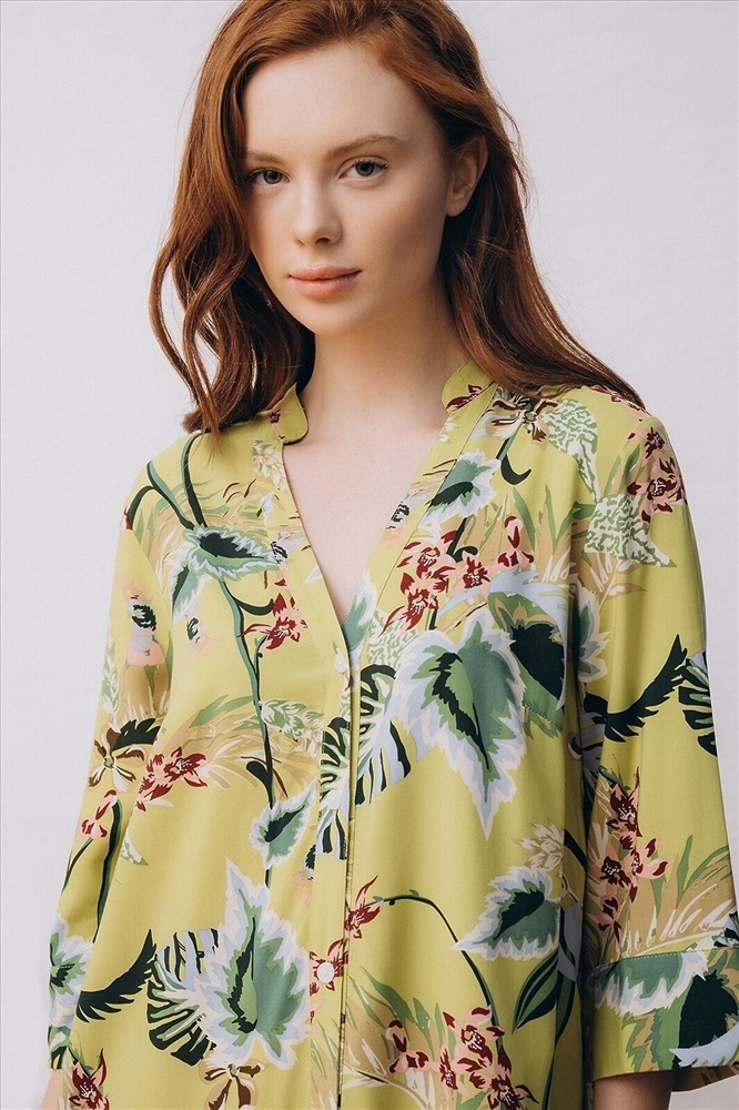 Страна производства: КНР Пляжная туника изготовлена из вискозной ткани. Туника прямого свободного кроя имеет рукава три четверти и застёгивается на пуговицы спереди. По бокам имеются два кармана. Туника выполнена в зелёном цвете, на неё нанесён цветочный принт с изображением растений.