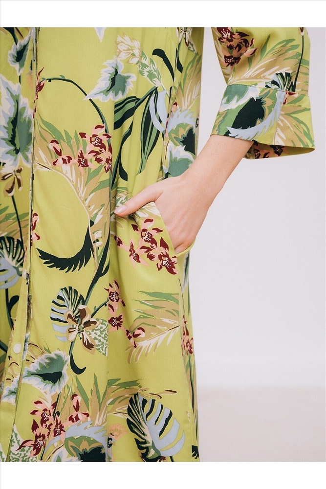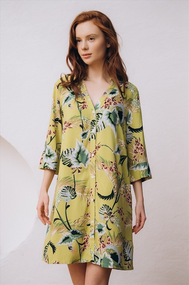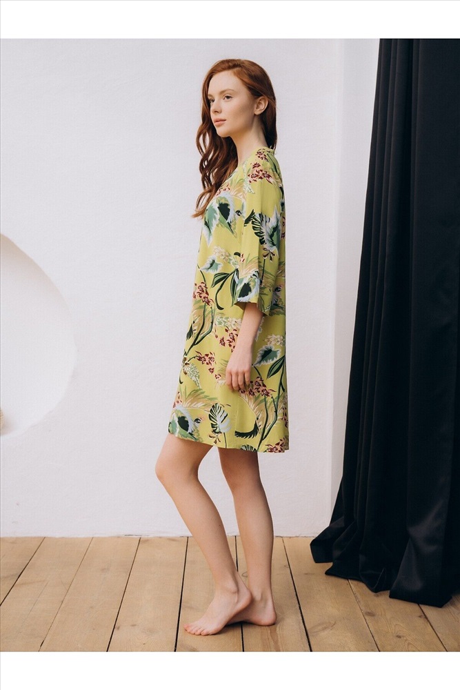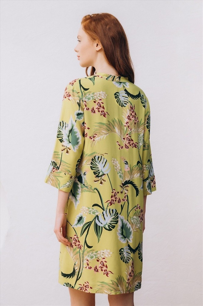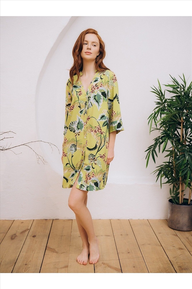Страна производства: КНР Пляжная туника изготовлена из вискозной ткани. Туника прямого свободного кроя имеет рукава три четверти и застёгивается на пуговицы спереди. По бокам имеются два кармана. Туника выполнена в зелёном цвете, на неё нанесён цветочный принт с изображением растений.