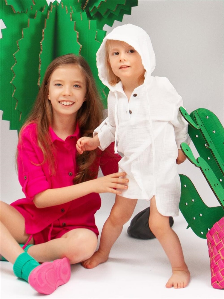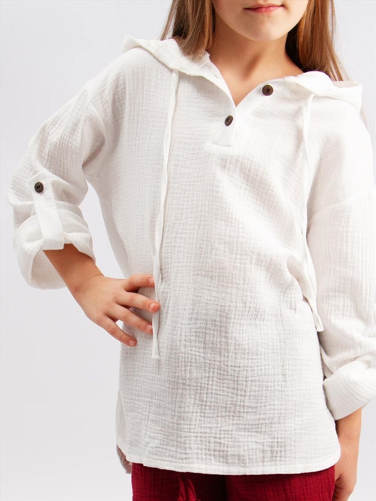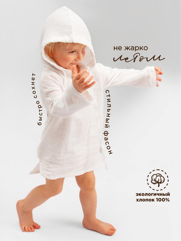 Застежка: пуговицы Модная, детская туника СольПерец свободного кроя, с капюшоном и асимметричной линией низа. На горловине и на рукавах застежки-пуговицы (кокос). Ткань-двухслойный муслин, хорошо пропускает воздух, защищает от солнца, идеально подходит для чувствительной кожи. Отличный выбор для прогулок, на пляж, в детский сад, для дома и на каждый день.