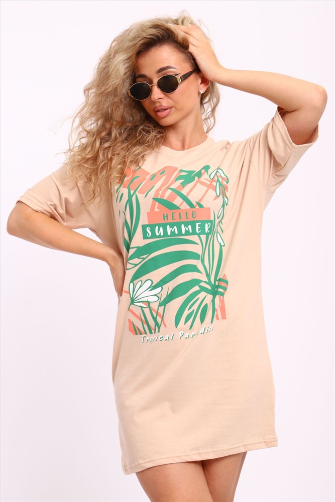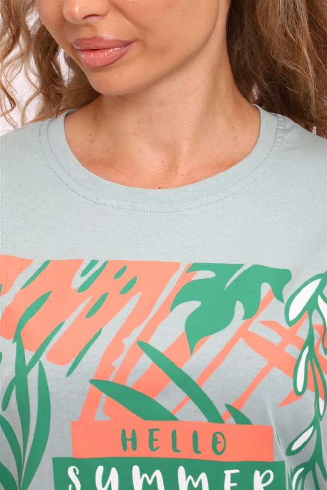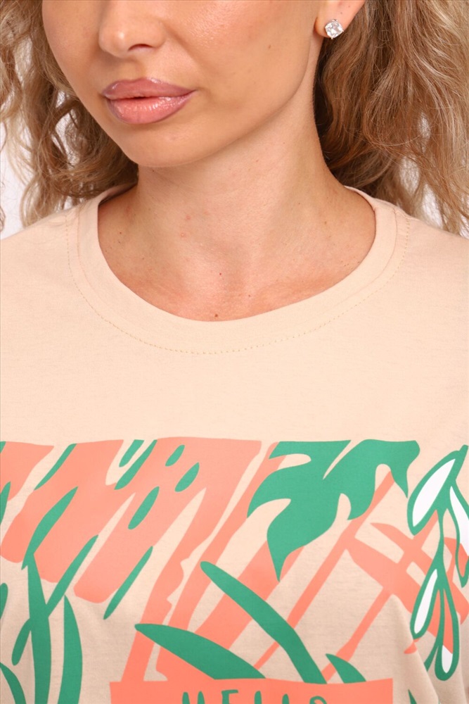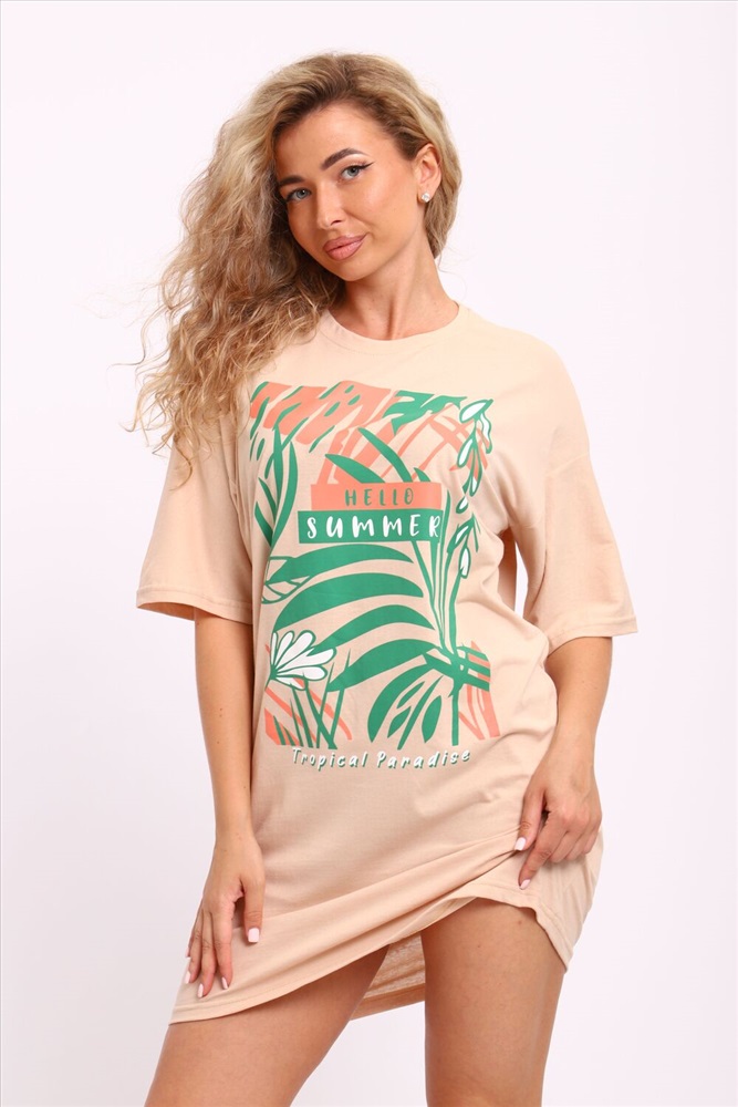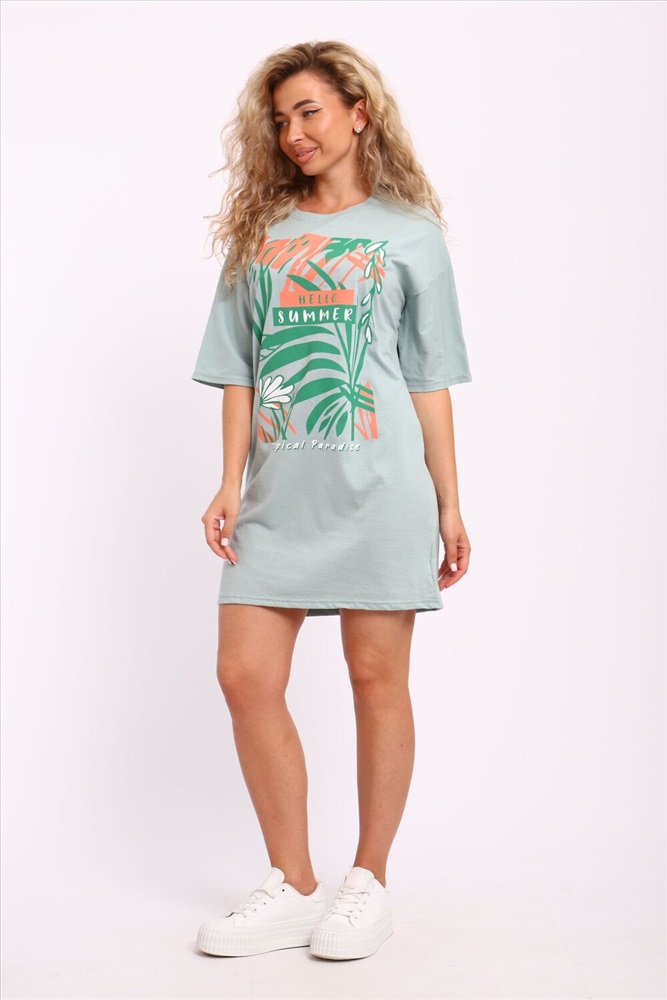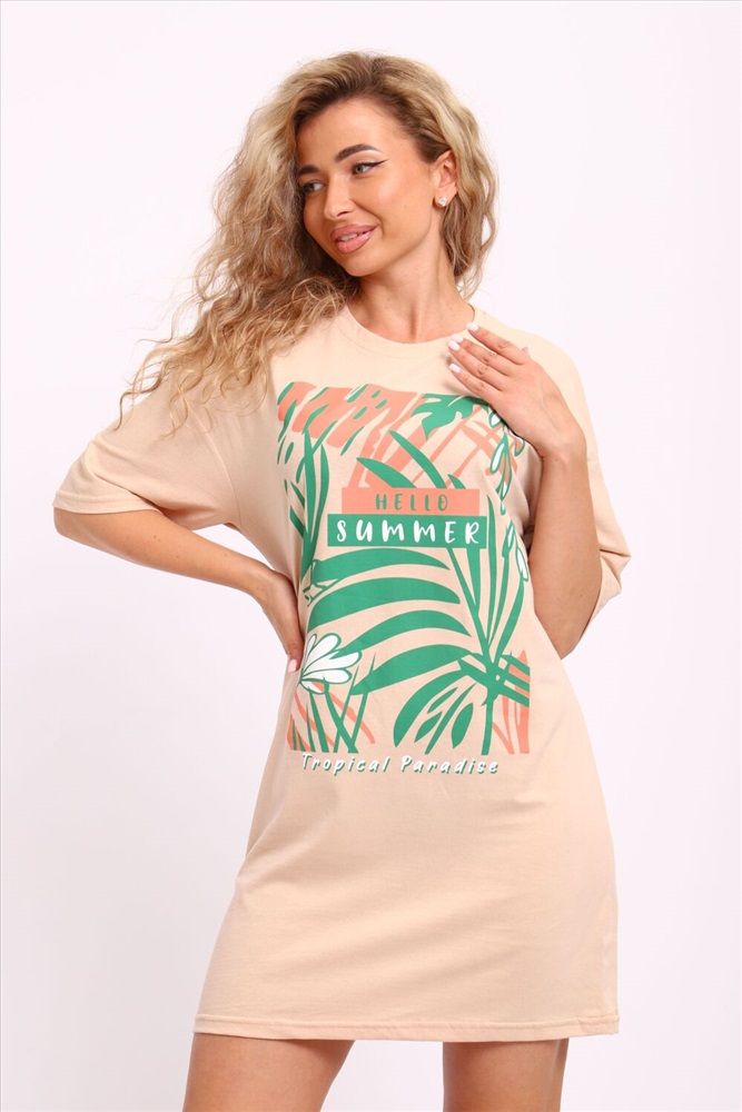 Застежка: без застежки Туника женская горловина обтачка, с коротким рукавом и печатью на передней полочке.