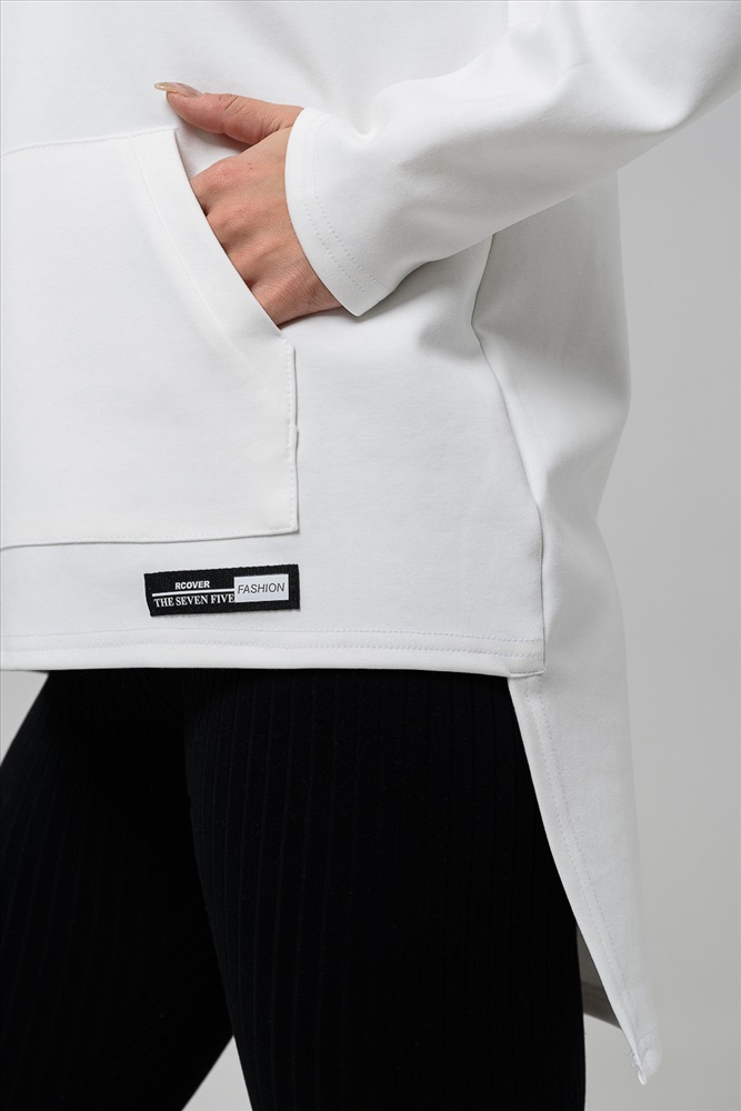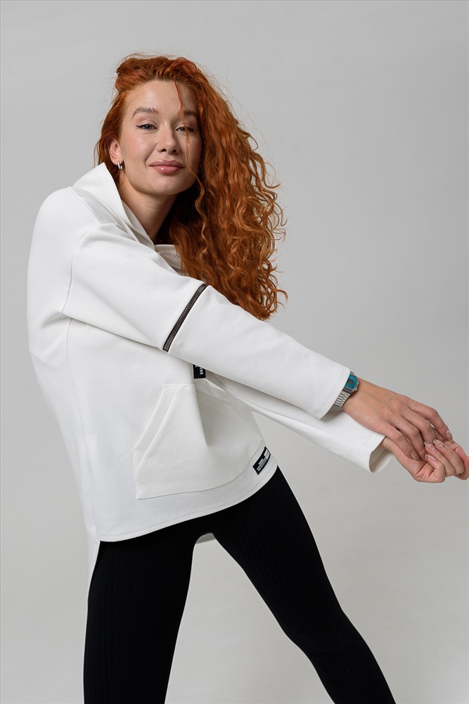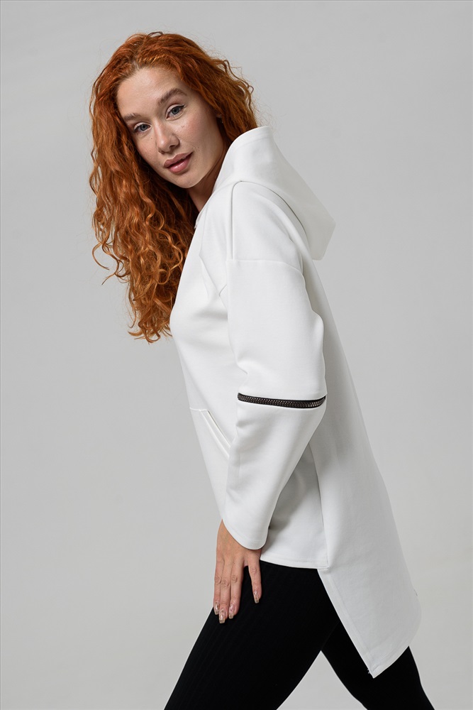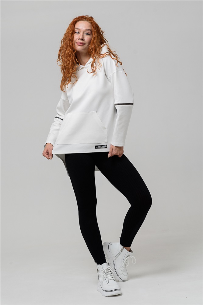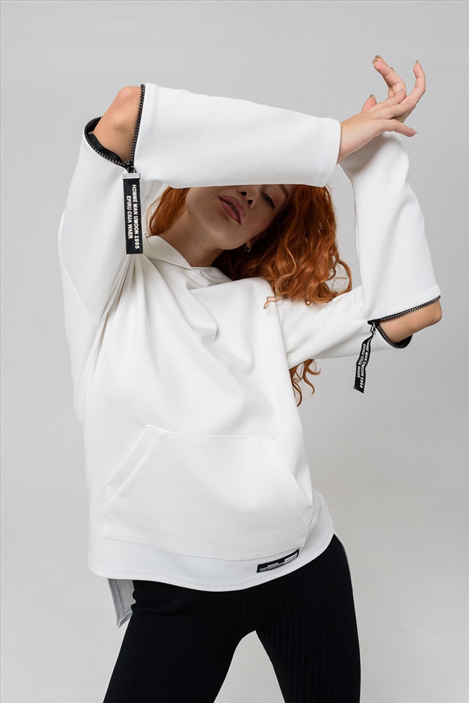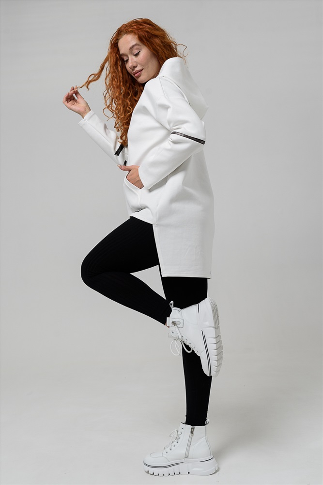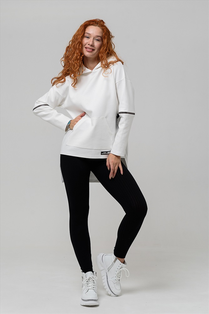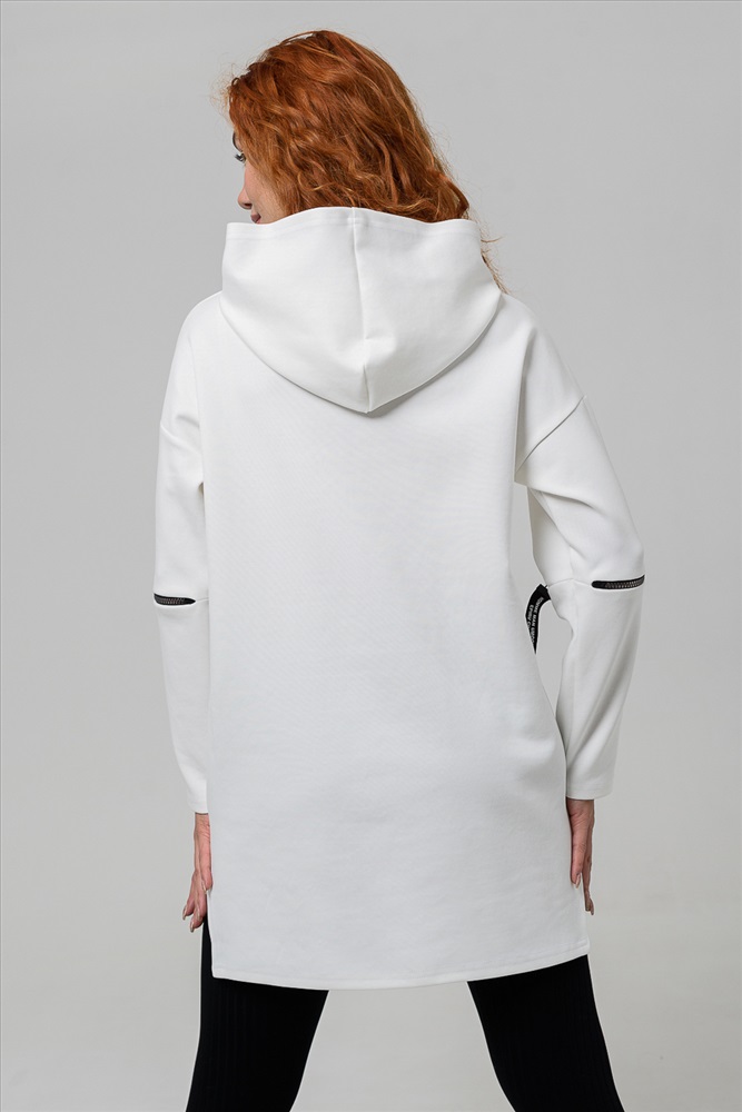 Застежка: без застежки Женская туника выполнена из интерлока. Удлиненная спинка, капюшон. На рукавах в районе локтей выполнены разрезы, которые можно застегнуть на молнию. Имеется карман кенгуру и нашивка внизу толстовки.