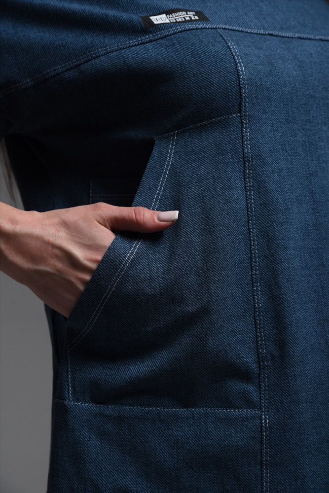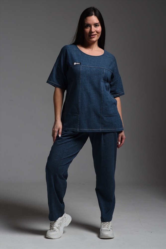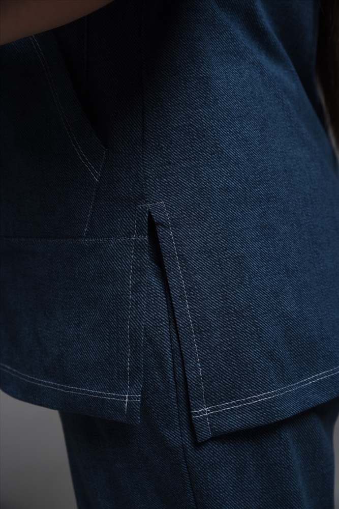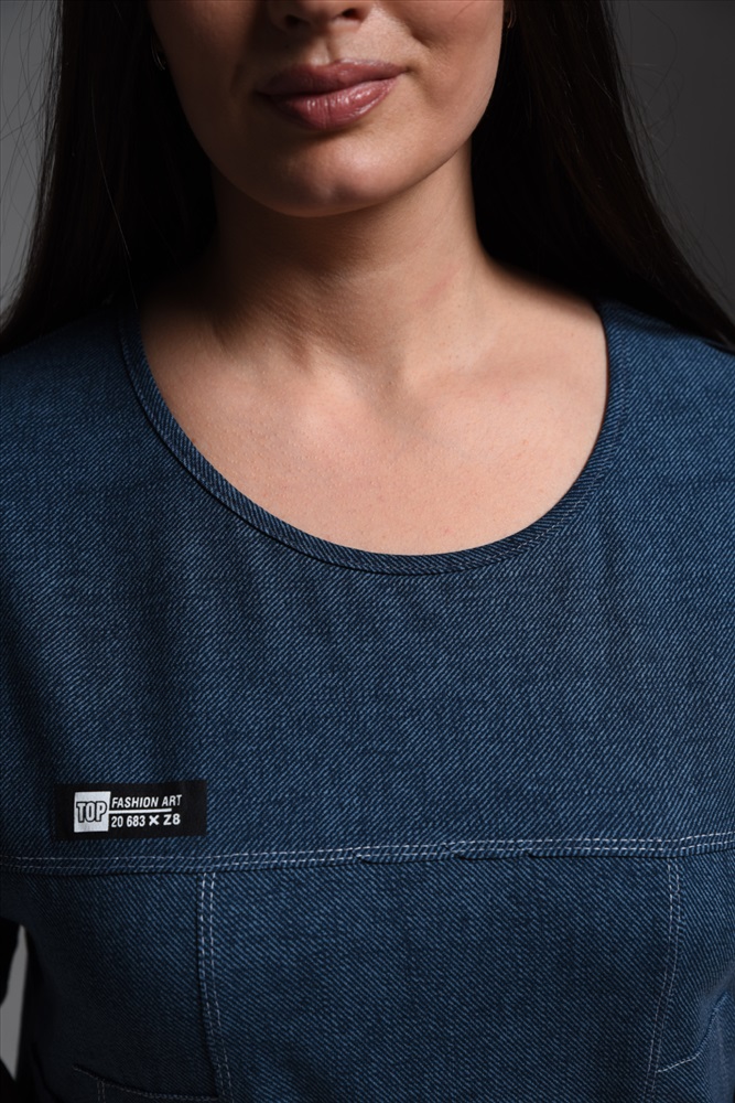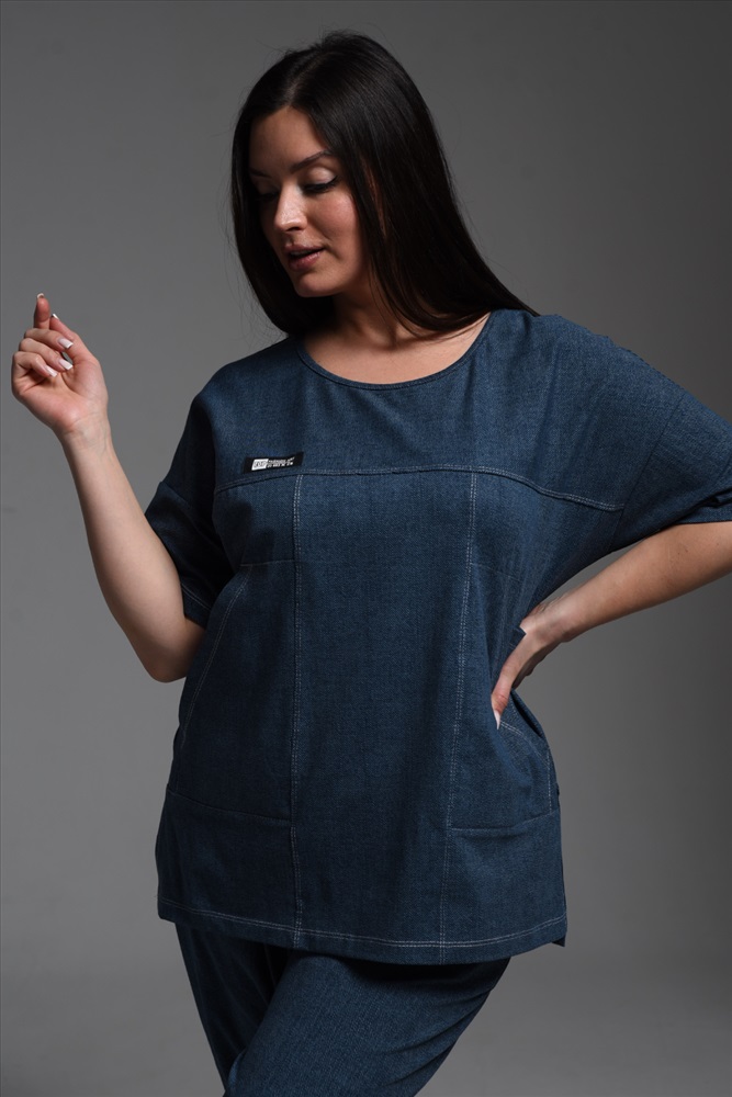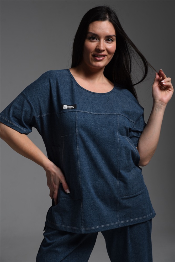 Застежка: без застежки Туника прямого силуэта, с округлой горловиной, с удлиненной спинкой, длиной до середины бедра. На полочке расположены фигурные накладные карманы. Полочка и спинка с кокетками. Рукав короткий. В нижней части боковых швов обработаны разрезы. Горловина обработана бейкой из основного полотна.