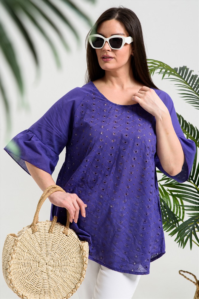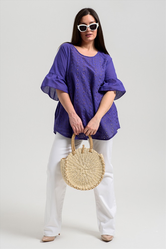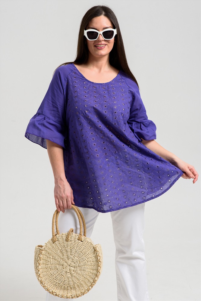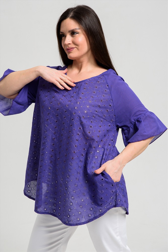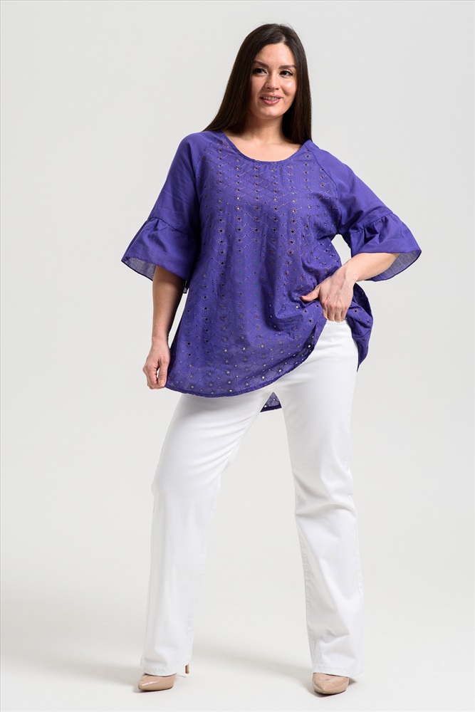 Застежка: без застежки Туника женская, расширенная к низу. Горловина округлая. Рукав реглан, внизу рукава широкая рюша. Низ туники фигурный, в боковых швах внутренние карманы. Свободная, легкая, не стесняющая движений туника незаменима для летнего гардероба любой женщины.