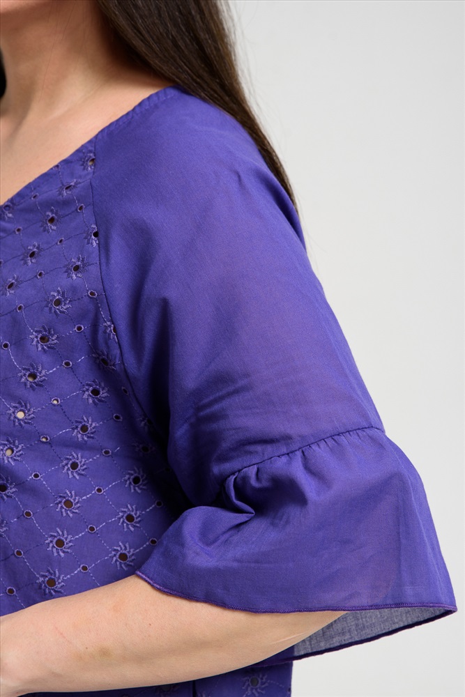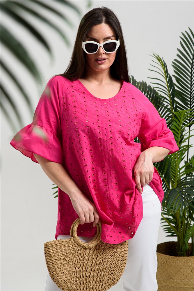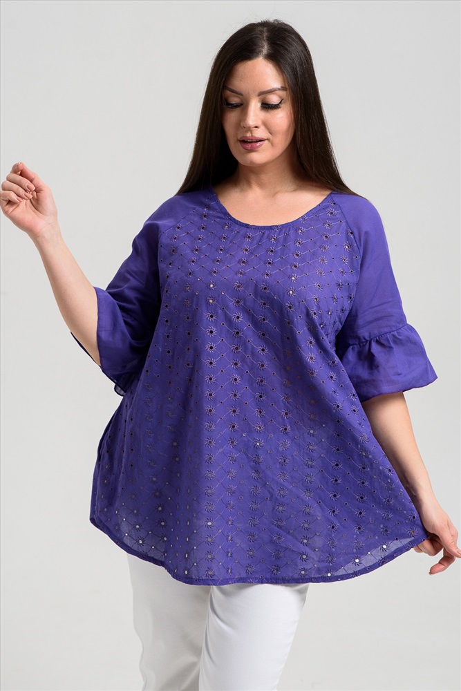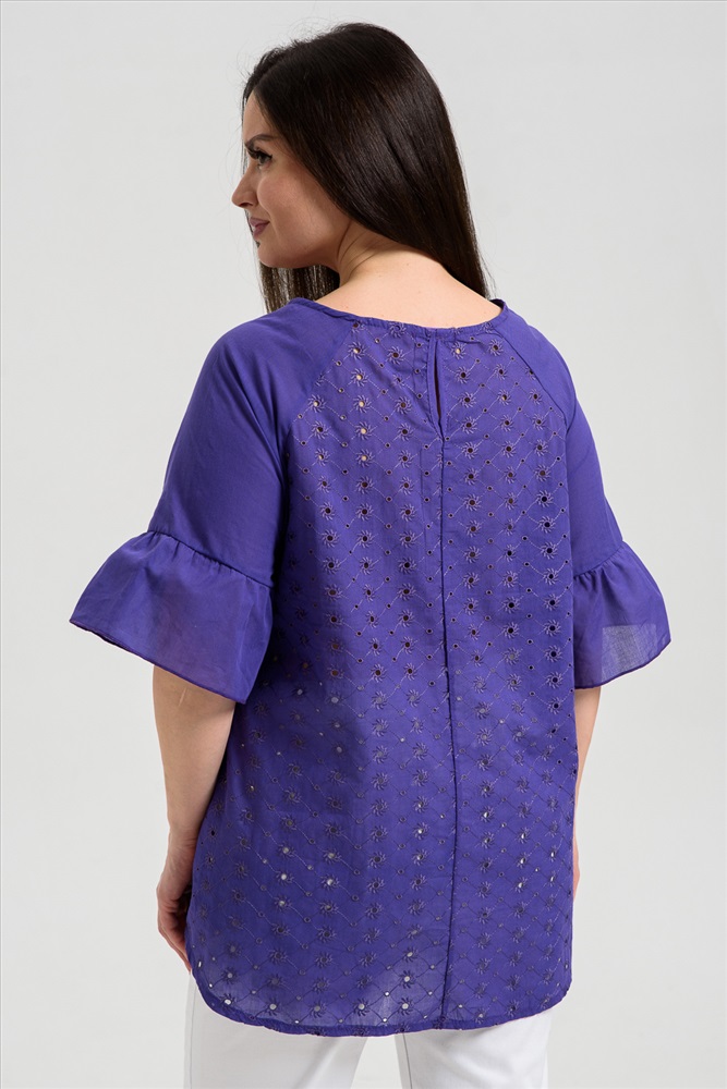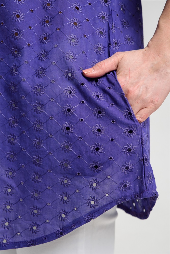Застежка: без застежки Туника женская, расширенная к низу. Горловина округлая. Рукав реглан, внизу рукава широкая рюша. Низ туники фигурный, в боковых швах внутренние карманы. Свободная, легкая, не стесняющая движений туника незаменима для летнего гардероба любой женщины.