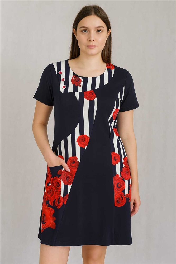 Застежка: без застежки Платье домашнее с ярким принтом. Короткие рукава, боковые карманы, декоративные пуговицы на плече как изысканный акцент. Модель выполнена из 100% хлопка.
