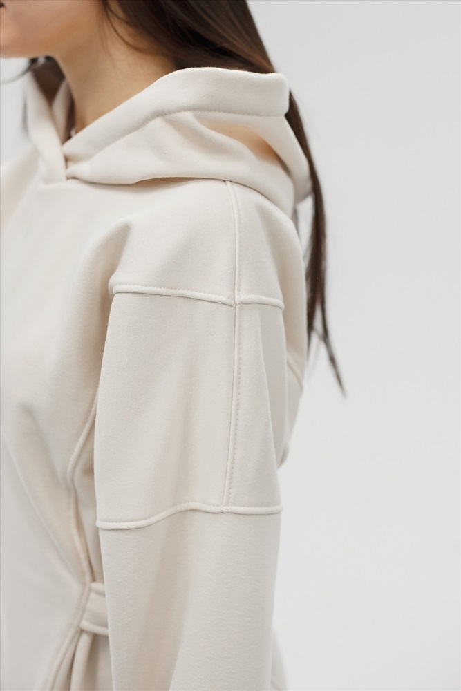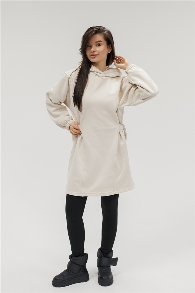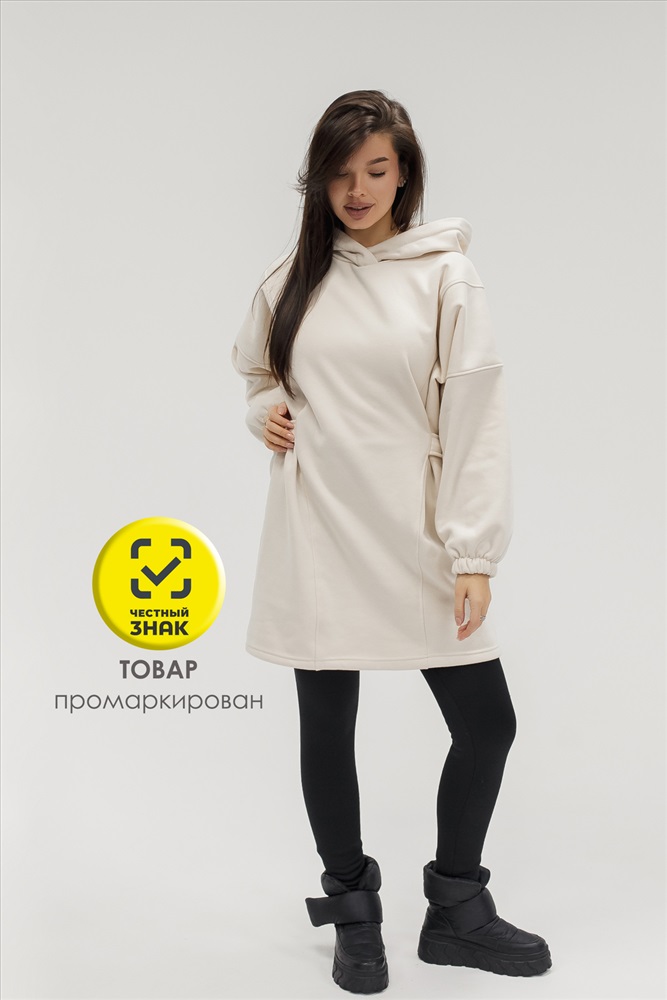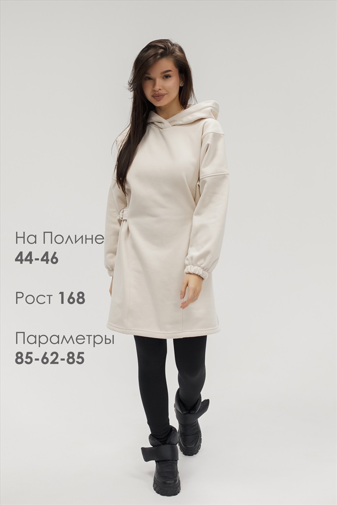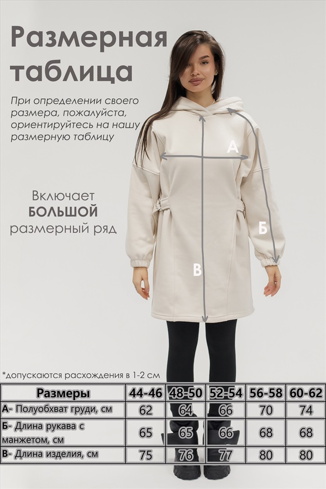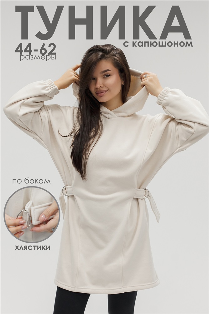 Состав: 80% хлопок и 20% полиэстер Модель: Туника женская теплая с капюшоном и хлястикамии Тип товара: туника Материал: футер на флисе | футер на флисе Бренд: Iv-trik-stail Длина: средняя длина Карман: без карманов Назначение: для дома НДС: 5% Особенности: с начесом Отделка: с манжетами | с поясом Рисунок: однотонные Рукав: длинный рукав Сезонность: осень | весна | зима Силуэт: свободный Стиль: домашний | повседневный Воротник: с капюшоном Застежка: без застежки Эта удлинённая женская туника с капюшоном выполнена из мягкого футера с тёплым начёсом и создана для максимального комфорта в холодное время года. Плотный, но лёгкий материал отлично сохраняет тепло, приятно ощущается на коже и не стесняет движений. 80% хлопок и 20% полиэстер обеспечивает комфорт, хорошую воздухопроницаемость и долгий срок службы изделия. Начес не линяет и не образует каташки, что сохраняет презентабельный вид даже после многократных стирок и активной носки. По бокам расположены функциональные хлястики, которые позволяют аккуратно подчеркнуть талию или, при желании, ослабить и завязать как удобно, адаптируя посадку под растущий живот, поэтому модель отлично подходит для беременных. Свободный, удлинённый силуэт делает тунику универсальной. Носите её с джинсами, леггинсами или теплами штанами, а капюшон добавляет практичности и дополнительного уюта в прохладную погоду. Кофта представлена в большом размерном ряде с 44 по 62, продумана под любые и нестандартные фигуры посадка мягкая, линия плеч естественная, а хлястики дают возможность подчеркнуть форму без дискомфорта. Туника проста в уходе: рекомендуется стирка на деликатном режиме при 30C, без отбеливателей. Ткань быстро сохнет и долго сохраняет структуру ворса при бережной сушке в расправленном виде. Это практичная и стильная вещь для повседневного гардероба, которая сочетает в себе тепло флиса, удобство капюшона и гибкую регулировку талии, оставаясь комфортной и элегантной на всех этапах жизни, включая период беременности. Таблица размеров и веса