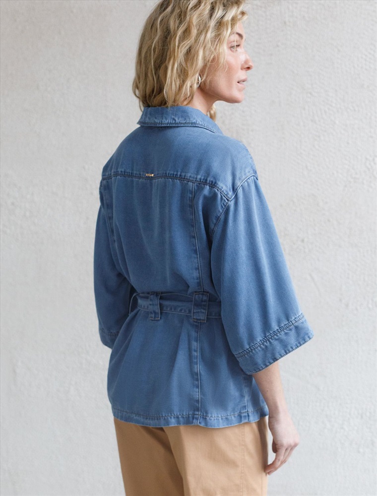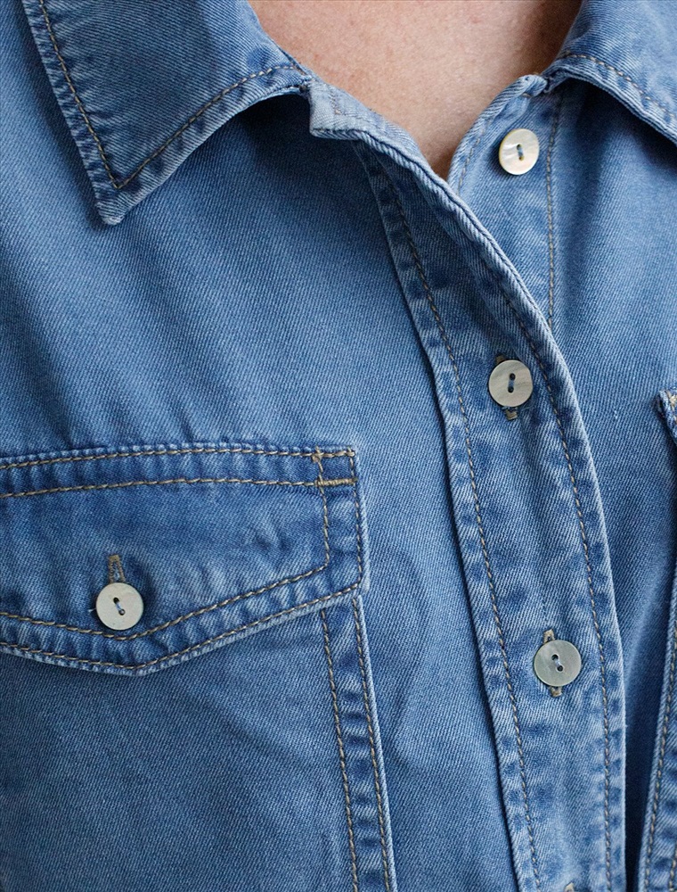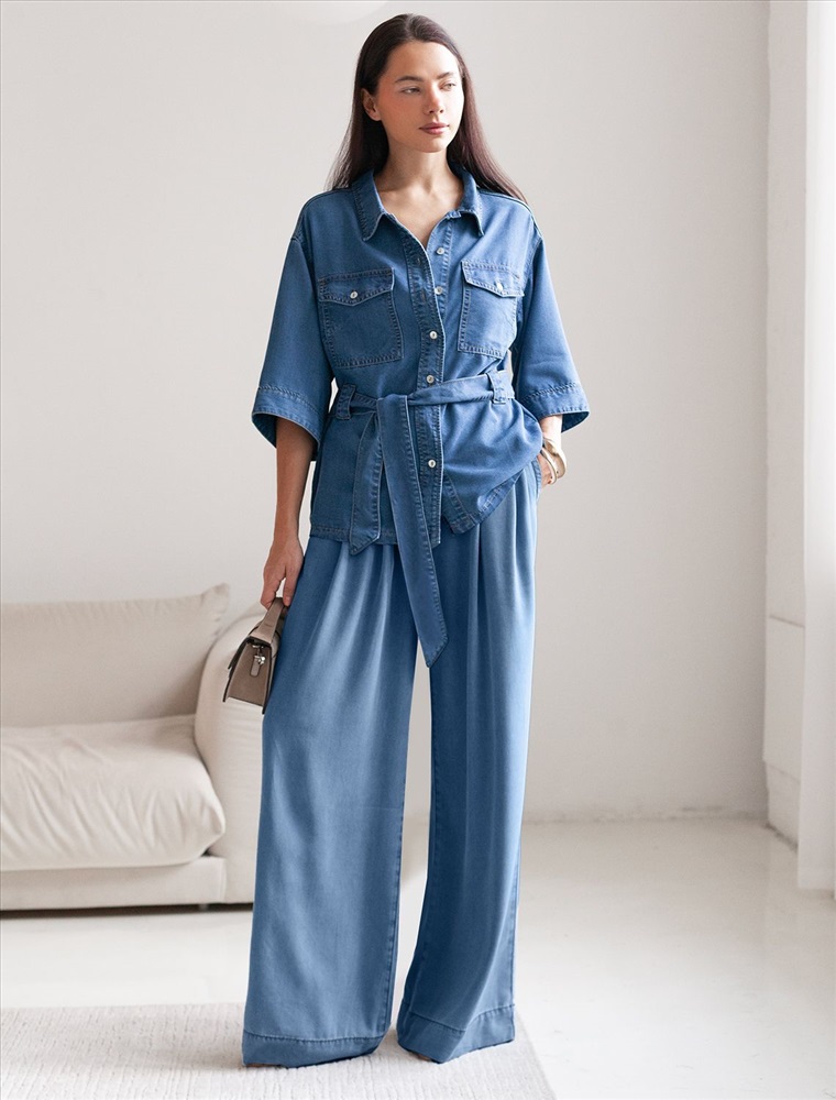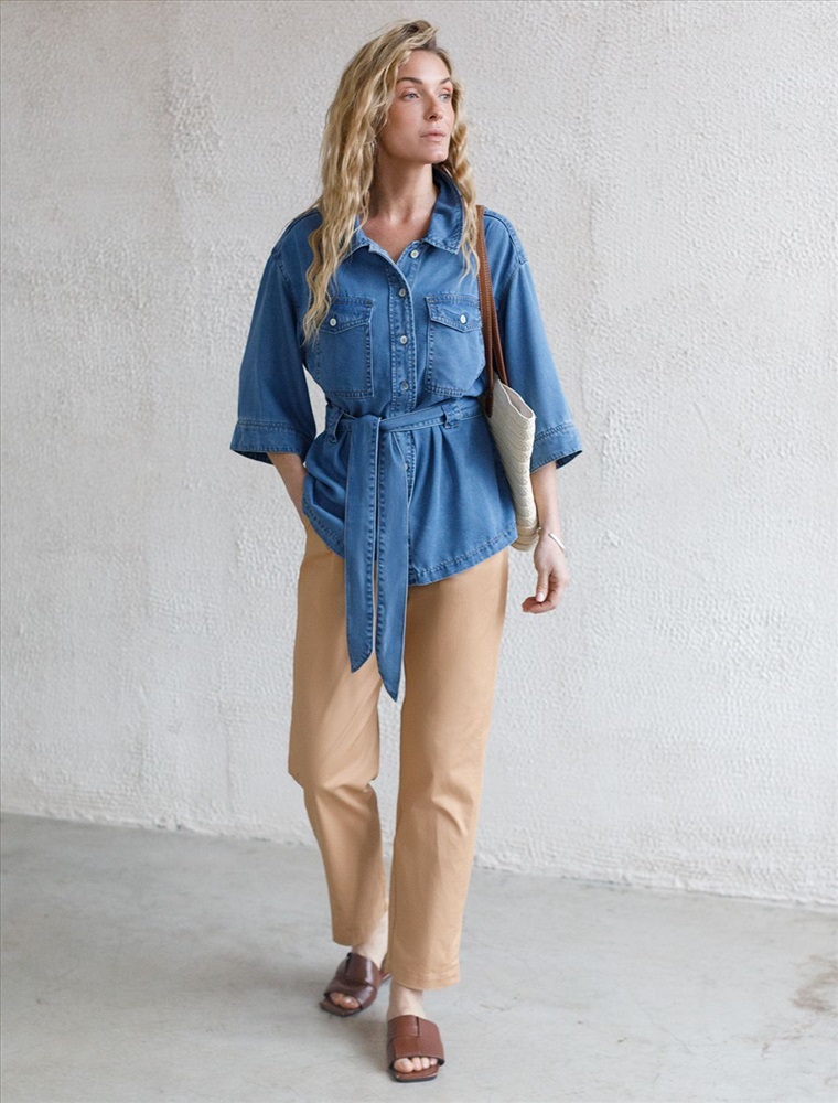 Эффектная удлиненная блузка светло-синего цвета с поясом выполнена из джинсового лиоцелла плотностью 7,8 OZ.. Универсальная модель идеально подходит для повседневной носки, пояс подчеркивает талию и скрывает небольшие недостатки фигуры, сохраняя при этом стильный вид. Отложной воротник создает аккуратный внешний образ, придавая классической рубашке элегантность. На груди расположены карманы, которые добавляют практичности. Ткань сочетает прочность и мягкость лиоцелла с вискозой, что делает её невероятно комфортной, дышащей, устойчивой к сминанию и идеально подходящей для чувствительной кожи. Благодаря нежным тактильным ощущениям, будто шелк, от которого ощущается приятная прохлада, рубашка отлично подходит для создания легких летних образов или стильных ансамблей на каждый день засчет своей универсальности. Широкий рукав средней длины гарантирует свободу движений и удобство на весь день. Джинсовую блузку можно сочетать в стиле кэжуал, а также создавать монохромные образы или добавлять яркие акценты с помощью аксессуаров. Эта джинсовая рубашка на пуговицах станет базовым элементом гардероба для тех, кто ценит сочетание классики, моды и удобства.