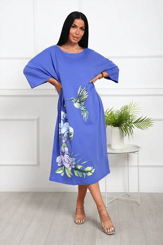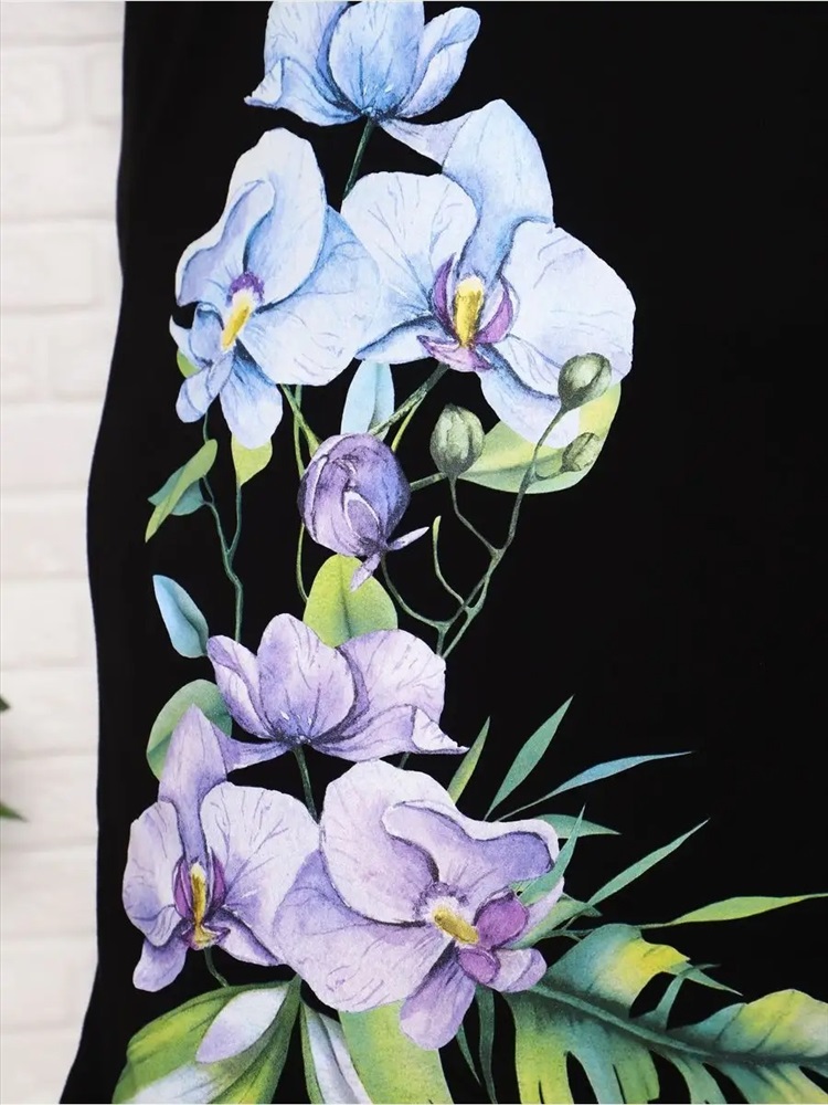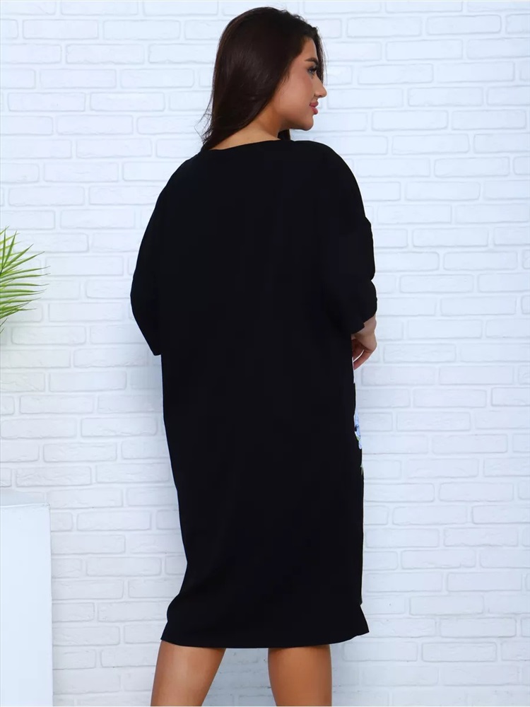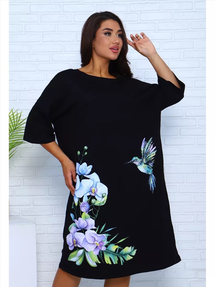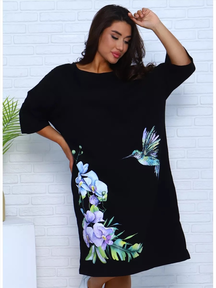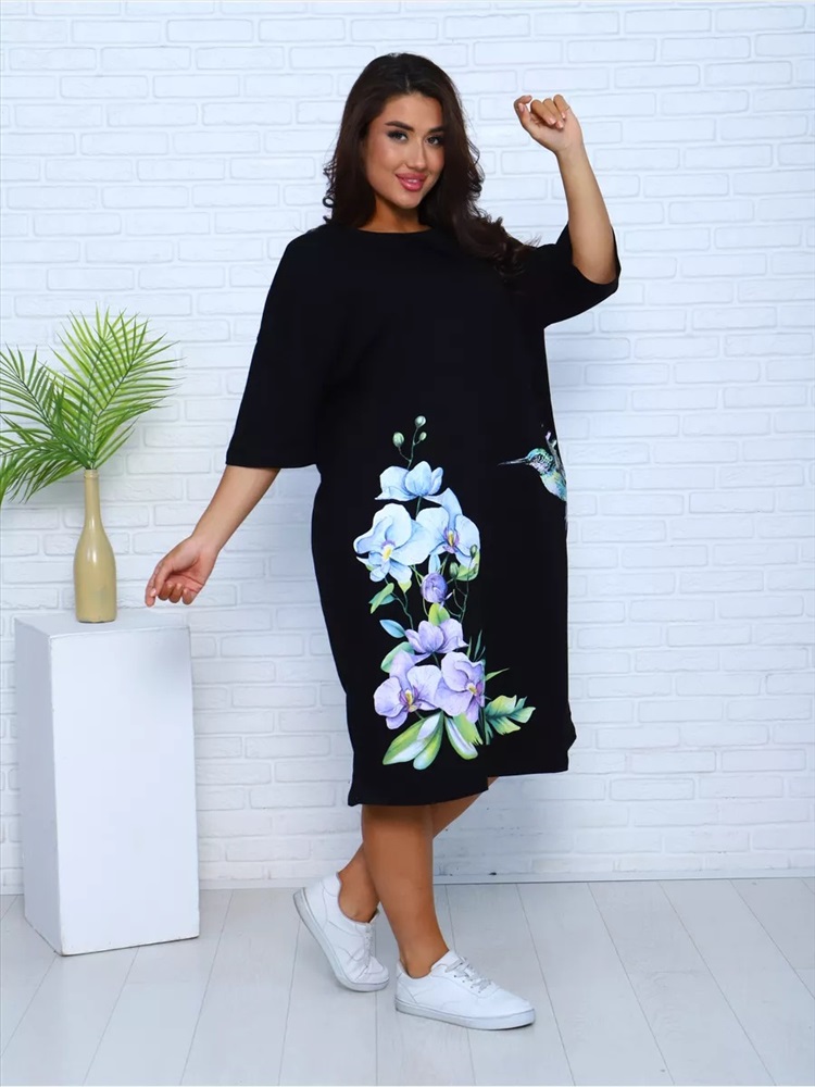 Застежка: без застежки Платье - футболка для дома больших размеров из 100% хлопка. Приятная к телу дышащая ткань из которой сшиты наши туники в форме удлиненной футболки свободного кроя - идеальная версия домашней одежды. Большой рисунок с цветами и яркой колибри не смоется и не выгорит на солнце, не потускнеет от многократных стирок. Платье черного цвета выглядит наиболее выигрышно, а рисунок на нем смотрится особенно ярко и насыщенно. На средний рост длина платья будет ниже колена, на высоких девушках оно сядет чуть короче.