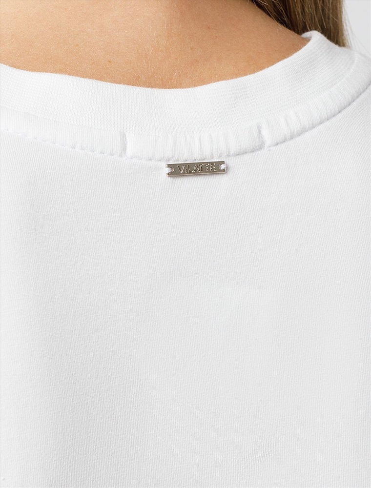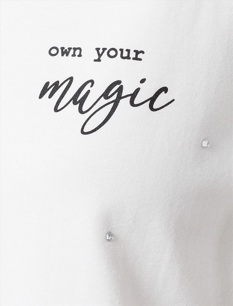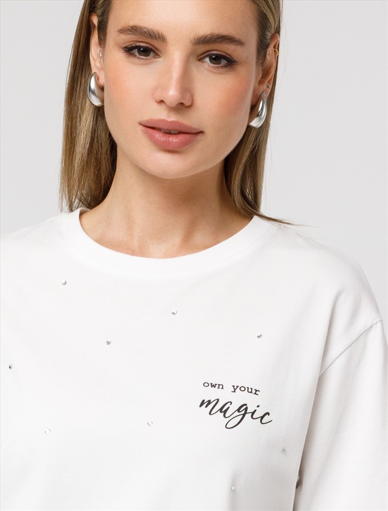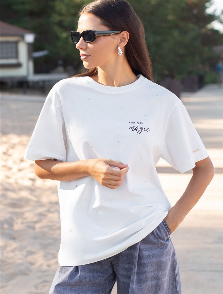 Плотность: 170 Г/м2 Параметры модели на первом фото: Рост 170, бюст 89, талия 63, бедра 92 Футболка свободного кроя выполнена из премиального хлопка. Лаконичный принт нанесен красками с устойчивым покрытием и россыпью сияющих страз. Перевод: «Own your magic - Твори свою магию» Наличие эластана в составе гарантирует абсолютный комфорт и долговечность изделия. Модель дополнена металлическим логотипом бренда. Комментарии к товару