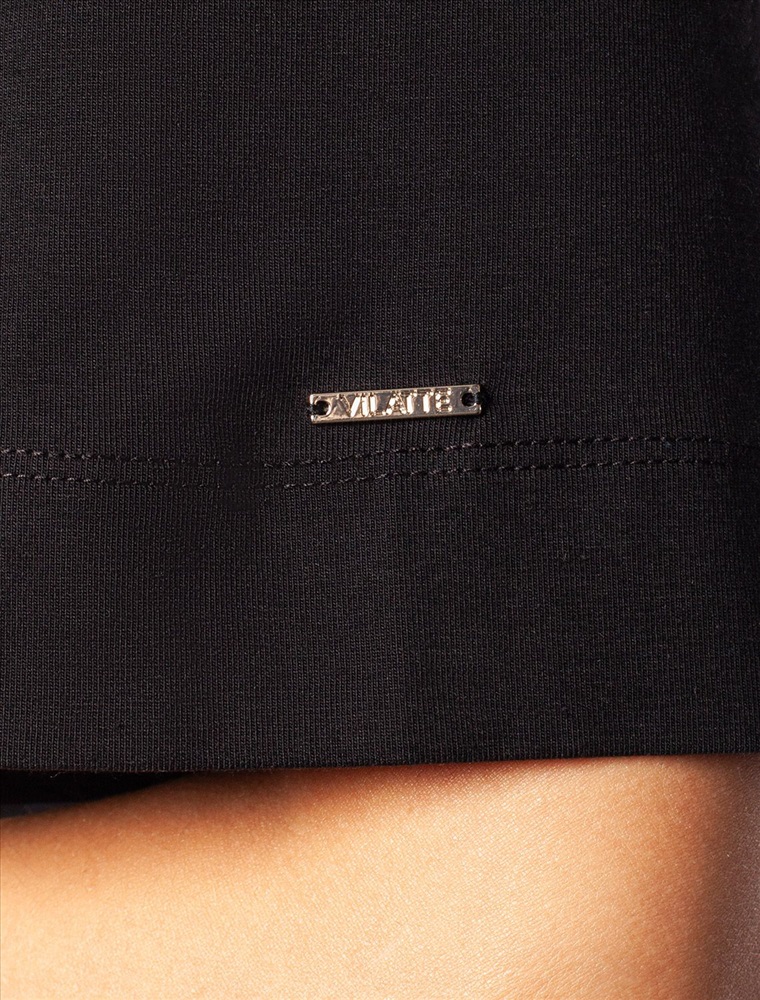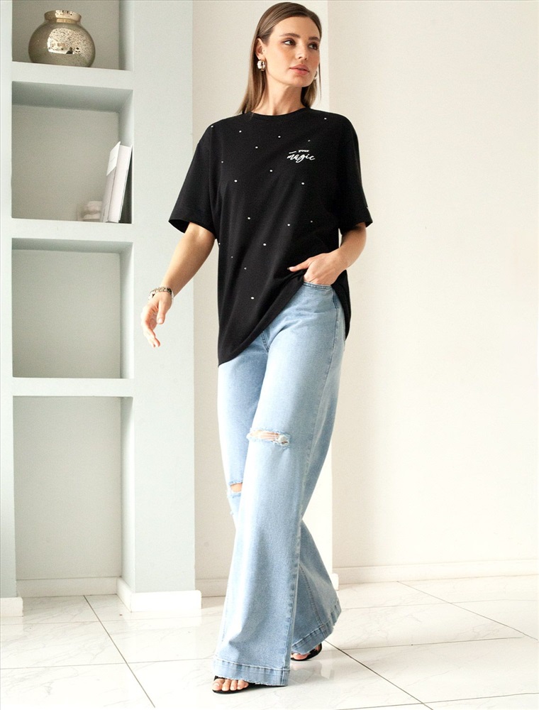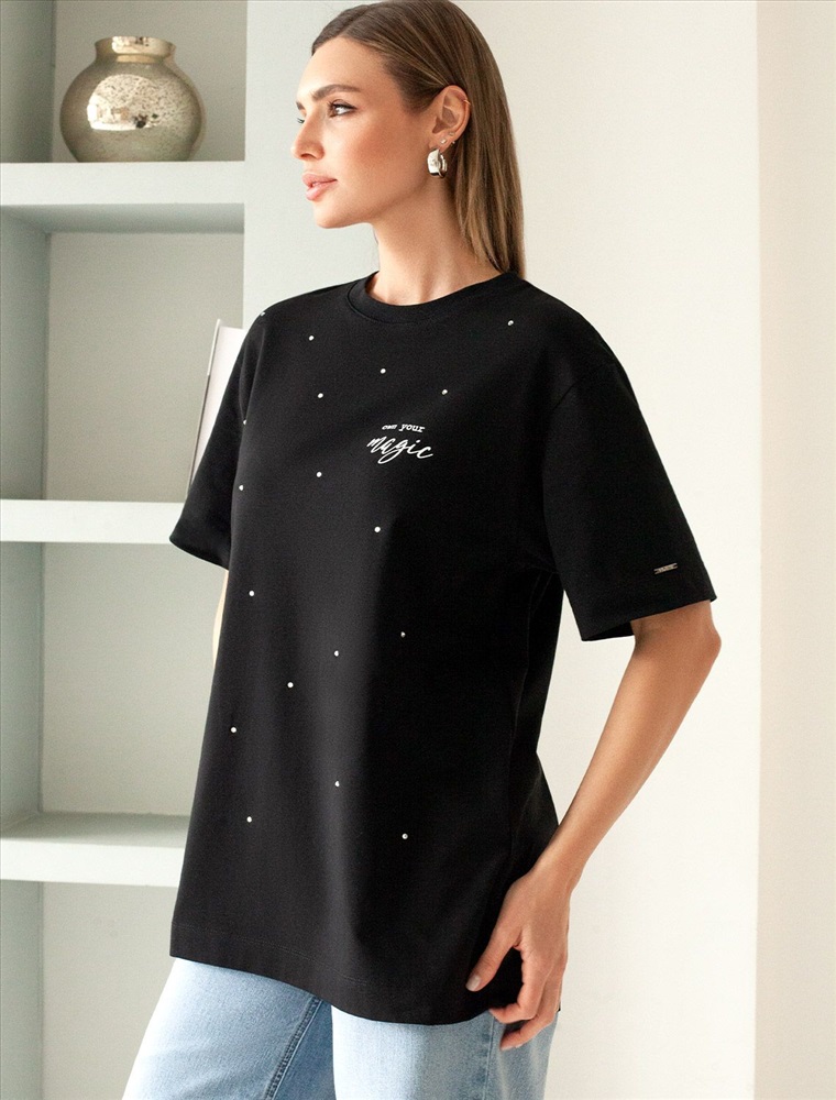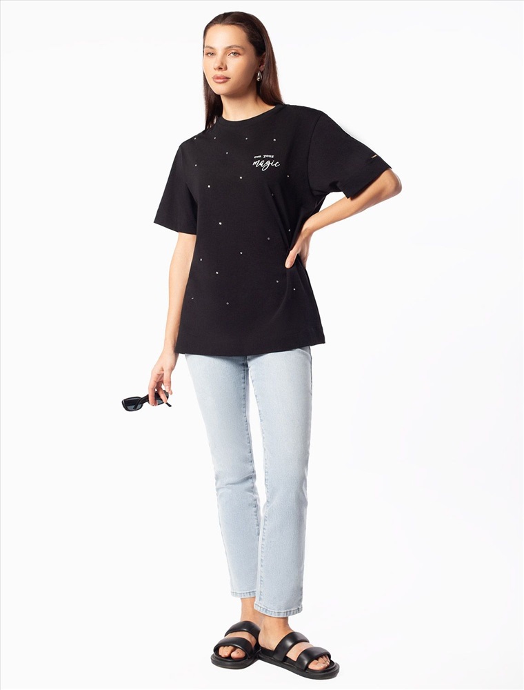 Футболка свободного кроя выполнена из премиального хлопка. Лаконичный принт нанесен красками с устойчивым покрытием и россыпью сияющих страз. Перевод: «Own your magic - Твори свою магию» Наличие эластана в составе гарантирует абсолютный комфорт и долговечность изделия. Модель дополнена металлическим логотипом бренда.