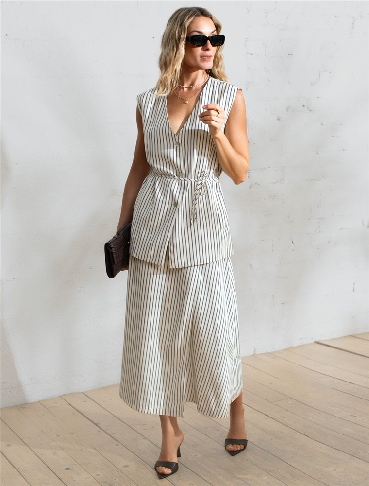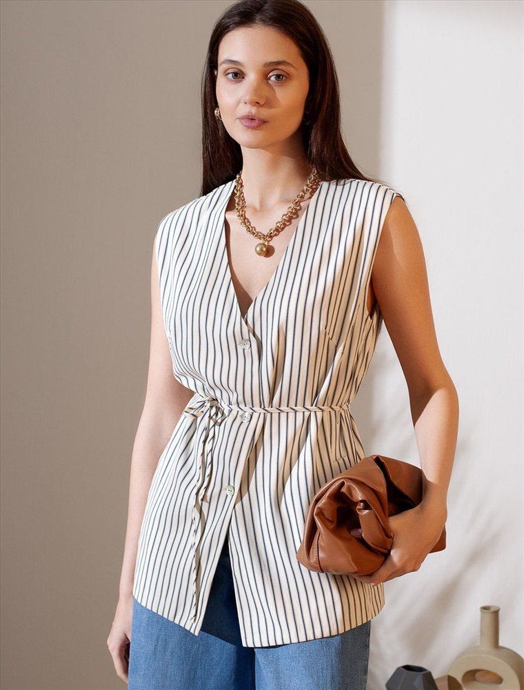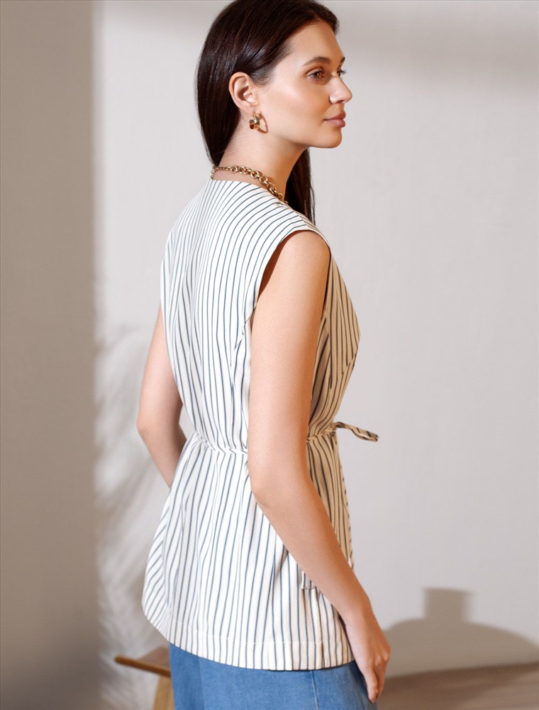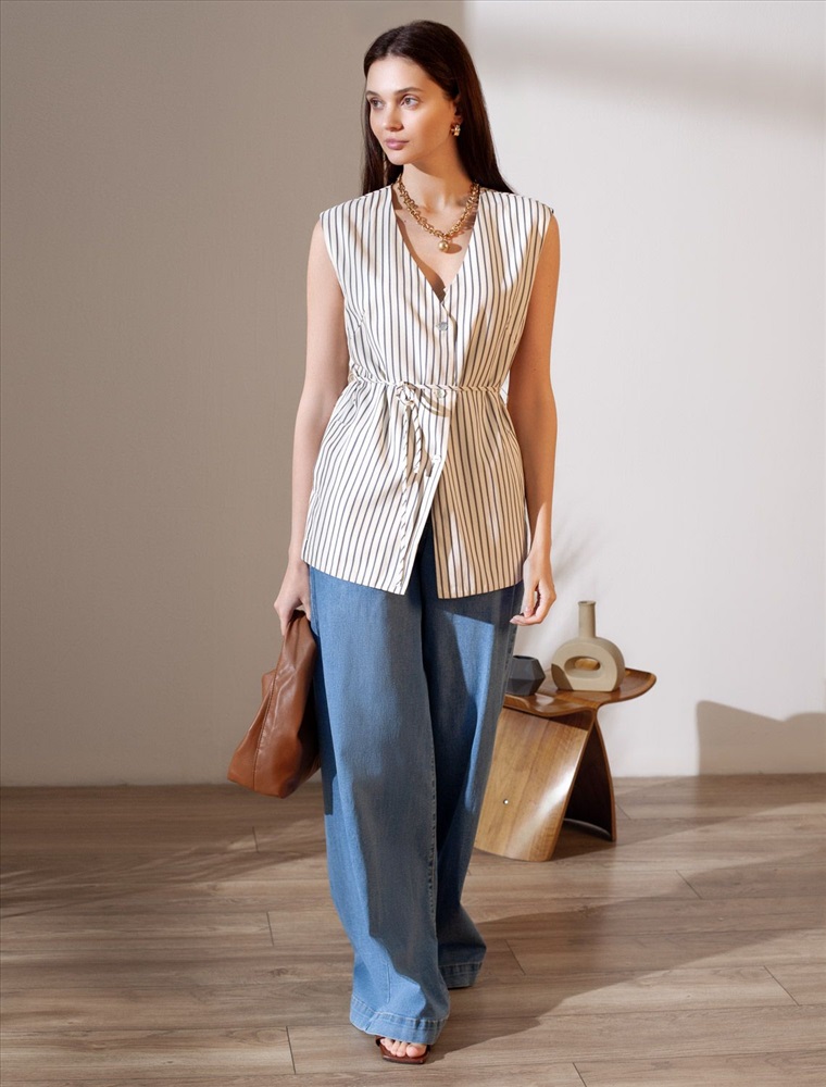 Плотность: 112 Г/м2 Эффектный удлиненный жилет молочно-синего цвета в полоску выполнен из легкого хлопкового поплина плотностью 112 Г/м2. Стильный фасон и легкий материал делают эту жилетку идеальным вариантом для лета и межсезонья. Пояс мягко акцентирует талию, красиво подчеркивая силуэт и корректирует пропорции. Вертикальная полоска визуально вытягивает фигуру и скрывает недостатки, а крой плавно повторяет контуры тела, сохраняя свободу движения. Благодаря продуманному крою она сидит идеально на разных фигурах, в том числе и на больших размерах. Натуральный состав ткани обладает высокой воздухопроницаемостью, а также способностью поглощать и отдавать влагу. В жилетке будет очень комфортно, благодаря правильной регуляции температуры тела.Такой жилет помогает создать актуальный и функциональный летний гардероб: он превосходно сочетается с разными низами, мгновенно преображая любой аутфит. Рекомендуем сочетать с артикулами: D24.298, D26.207 Комментарии к товару