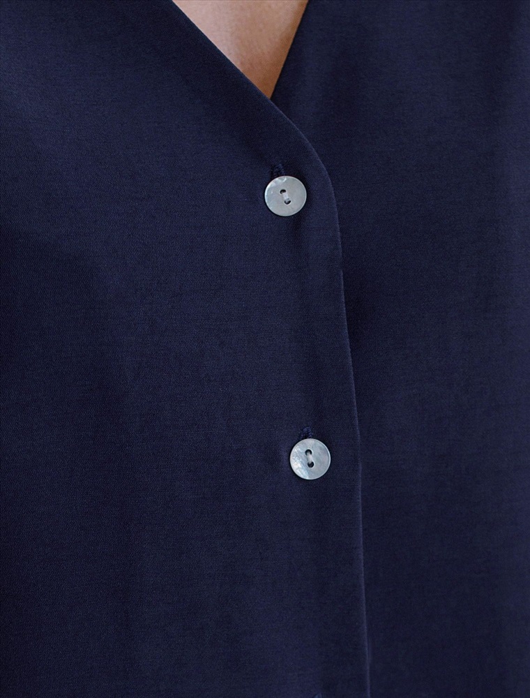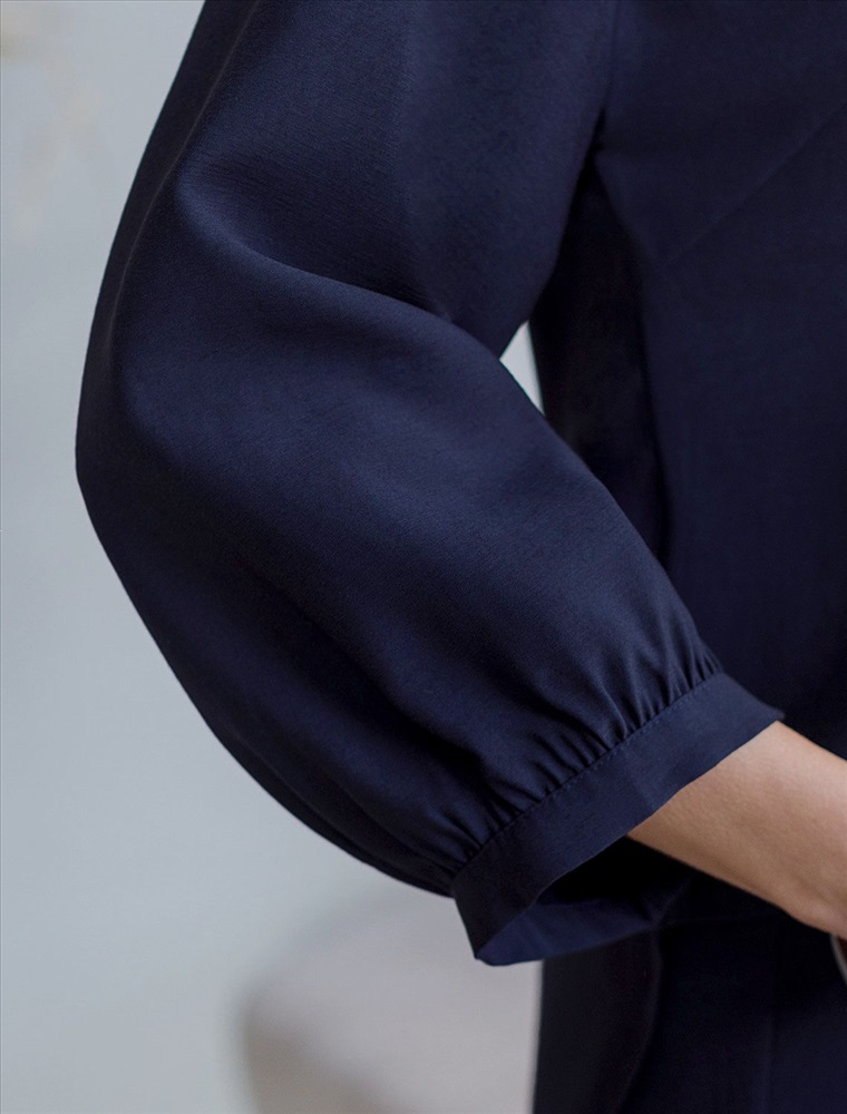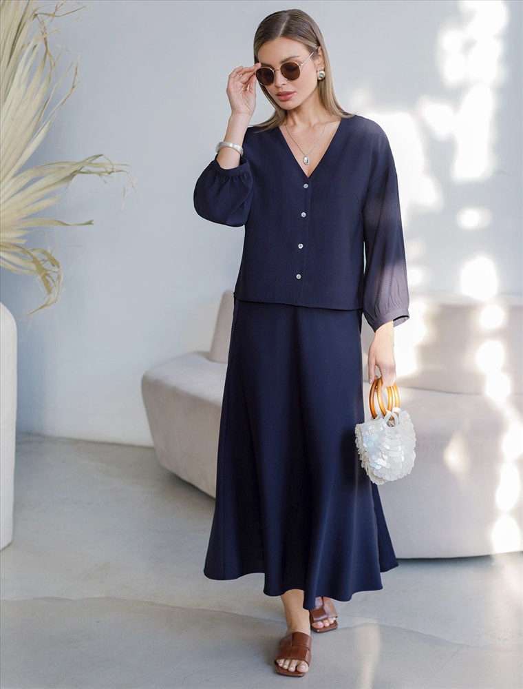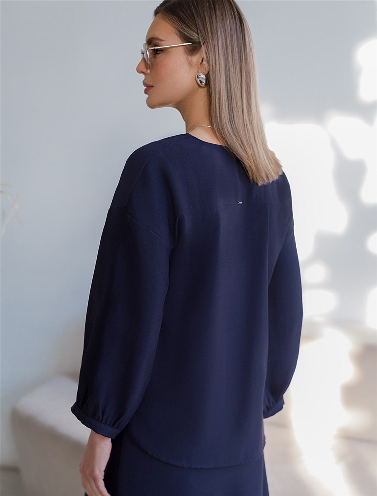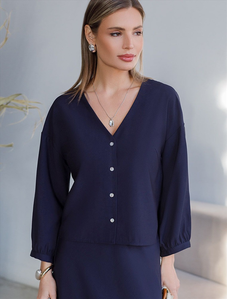 Плотность: 180 Г/м2 Элегантная укороченная блузка темно-синего цвета выполнена из плотного лиоцелла. Лиоцелл это более дорогой и экологичный вариант вискозы, очень прочный и шелковистый. Ткань отличается от регулярной коллекции из лиоцелла - она содержит еще больше лиоцелла (92%), благодаря чему имеет более нежную шелковистую фактуру. Модель дополнена объемными рукавами длиной 7/8, создающими модный акцент. Укороченная передняя часть блузки выгодно подчеркивает линию талии, а удлиненная спинка обеспечивает комфорт. Этот асимметричный фасон придает образу динамичности, а V вырез визуально вытягивает силуэт. Свободный крой романтиной блузки не сковывает движений и отлично садится по фигуре даже на большие размеры, скрывая возможные недостатки. Эта легкая блузка с застежкой на пуговицы идеальный выборо для комфорта и стиля в теплое время года, она идеально адаптируется под любой повод. Комплект из лиоцелла подчеркнет ваш вкус и статус. Это идеальный выбор для особенных моментов. Такой образ будет уместен на торжественных мероприятиях и приемах, выпускных вечерах, семейных праздниках и свадьбах. Реомендуем сочетать с артикулами: D26.208, D24.313
