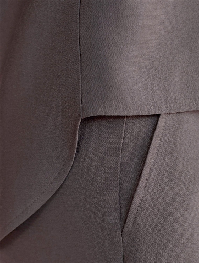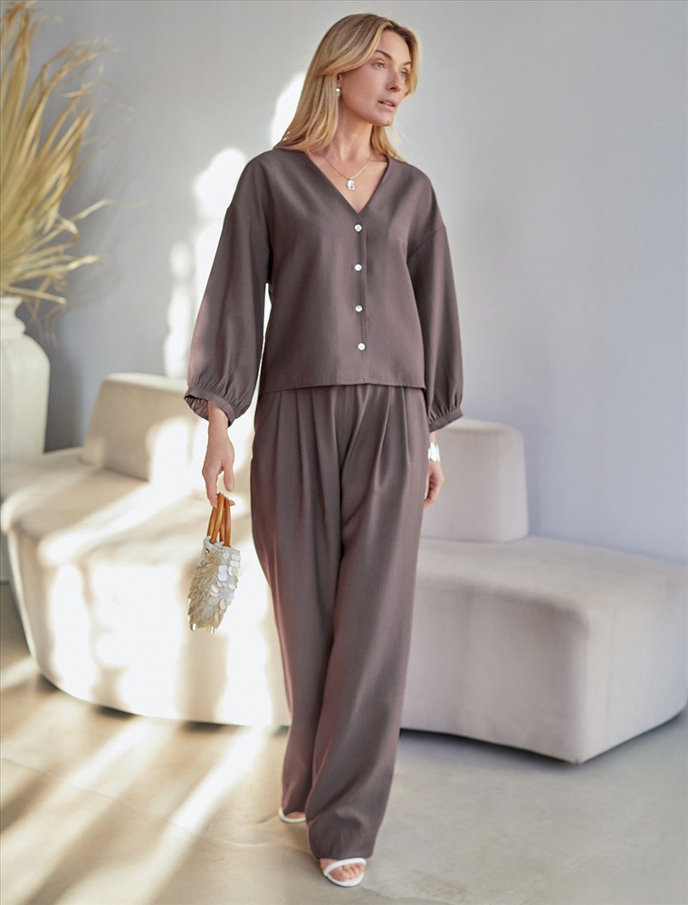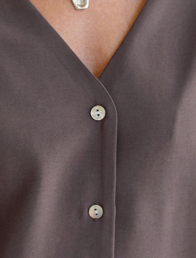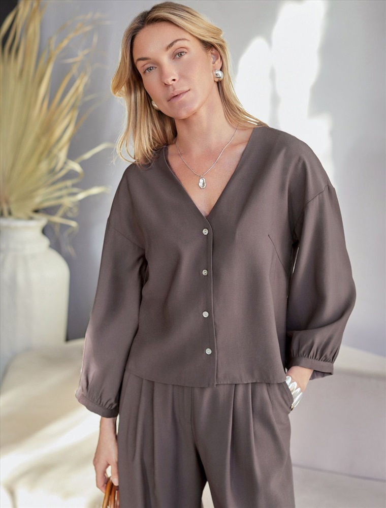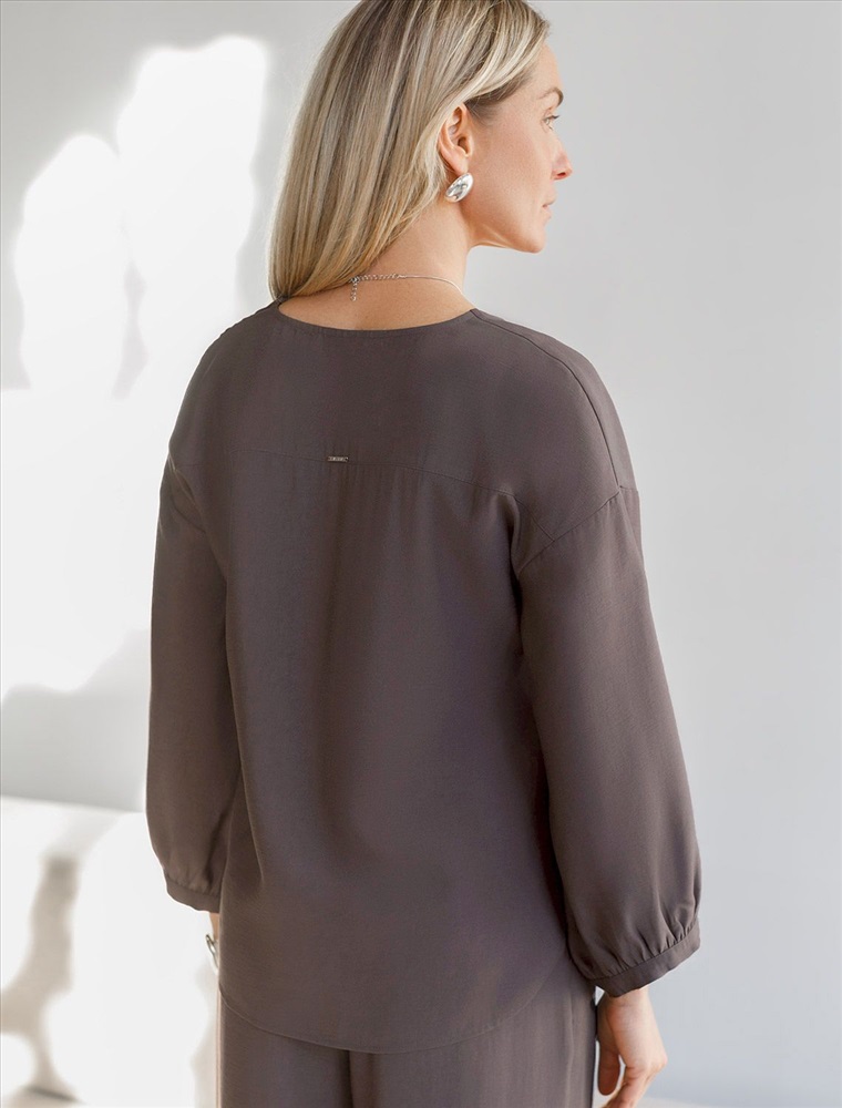 Элегантная укороченная блузка кофейного цвета выполнена из плотного лиоцелла. Лиоцелл это более дорогой и экологичный вариант вискозы, очень прочный и шелковистый. Ткань отличается от регулярной коллекции из лиоцелла - она содержит еще больше лиоцелла (92%), благодаря чему имеет более нежную шелковистую фактуру. Модель дополнена объемными рукавами длиной 7/8, создающими модный акцент. Укороченная передняя часть блузки выгодно подчеркивает линию талии, а удлиненная спинка обеспечивает комфорт. Этот асимметричный фасон придает образу динамичности, а V вырез визуально вытягивает силуэт. Свободный крой романтиной блузки не сковывает движений и отлично садится по фигуре даже на большие размеры, скрывая возможные недостатки. Эта легкая блузка с застежкой на пуговицы идеальный выборо для комфорта и стиля в теплое время года, она идеально адаптируется под любой повод. Комплект из лиоцелла подчеркнет ваш вкус и статус. Это идеальный выбор для особенных моментов. Такой образ будет уместен на торжественных мероприятиях и приемах, выпускных вечерах, семейных праздниках и свадьбах.