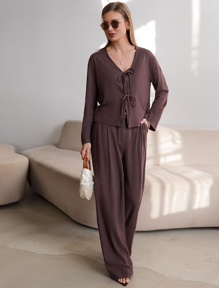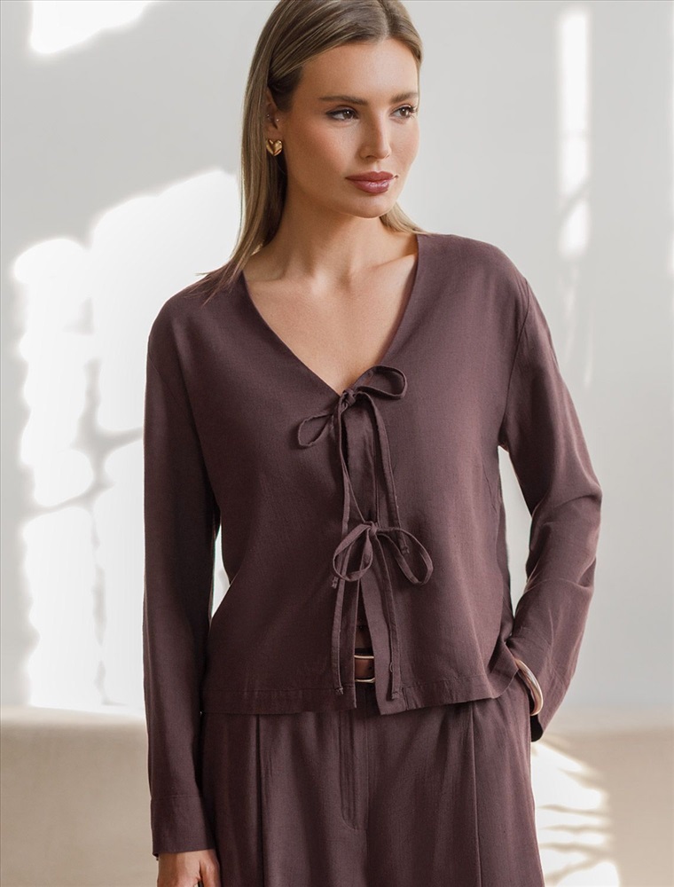 Плотность: 200 Г/м2 Свободная блузка коричневого цвета с завязками изо льна с вискозой, плотностью 200 Г/м2 - идеальный вариант для весны и лета. Сочетание льна и вискозы обеспечивает комфорт и прохладу в жаркие дни. Материал хорошо драпируется и мягко прилегает к фигуре, создавая струящиеся складки. Эта эффектная блузка сочетает в себе современный крой, удобство и стиль. V-вырез визуально вытягивает силуэт, спущенная линия плеча придает модный и расслабленный акцент, а широкий рукав создает красивый и воздушный силуэт. Завязки делают льняную блузку особенно практичной, вы можете носить ее растегнутой, в качестве верхнего слоя. Эта легкая романтичная блузка подходит для повседневного гардероба, смотрится красиво и стильно, обеспечивая максимальный комфорт, подойдет и на большие размеры. Рекомендуем сочетать с артикулом: D24.308 Комментарии к товару