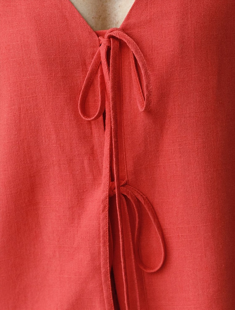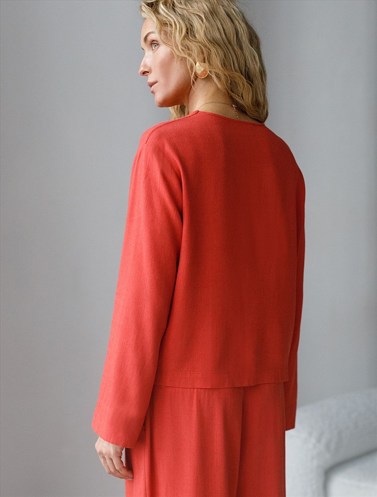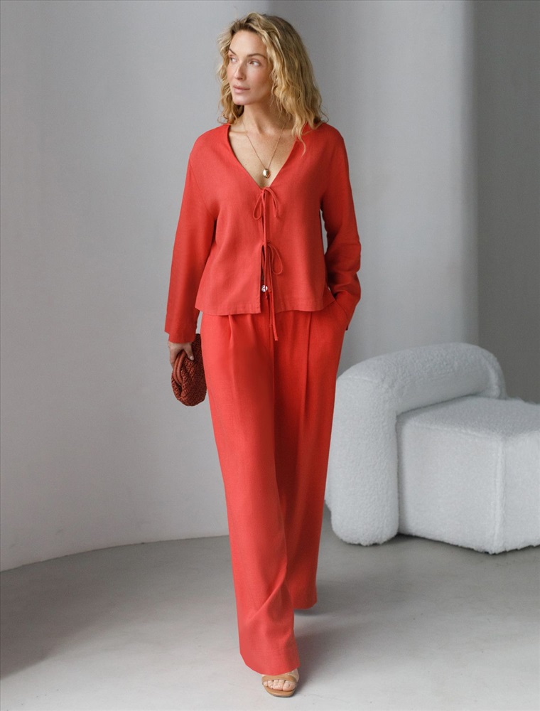 Плотность: 200 Г/м2 Свободная блузка кораллового цвета с завязками изо льна с вискозой, плотностью 200 Г/м2 - идеальный вариант для весны и лета. Сочетание льна и вискозы обеспечивает комфорт и прохладу в жаркие дни. Материал хорошо драпируется и мягко прилегает к фигуре, создавая струящиеся складки. Эта эффектная блузка сочетает в себе современный крой, удобство и стиль. V-вырез визуально вытягивает силуэт, спущенная линия плеча придает модный и расслабленный акцент, а широкий рукав создает красивый и воздушный силуэт. Завязки делают льняную блузку особенно практичной, вы можете носить ее растегнутой, в качестве верхнего слоя. Эта легкая романтичная блузка подходит для повседневного гардероба, смотрится красиво и стильно, обеспечивая максимальный комфорт, подойдет и на большие размеры. Рекомендуем сочетать с артикулом: D24.308 Комментарии к товару