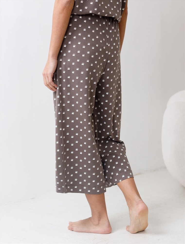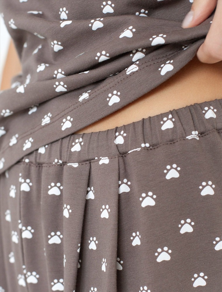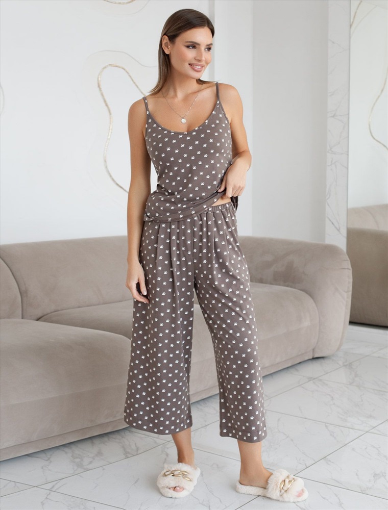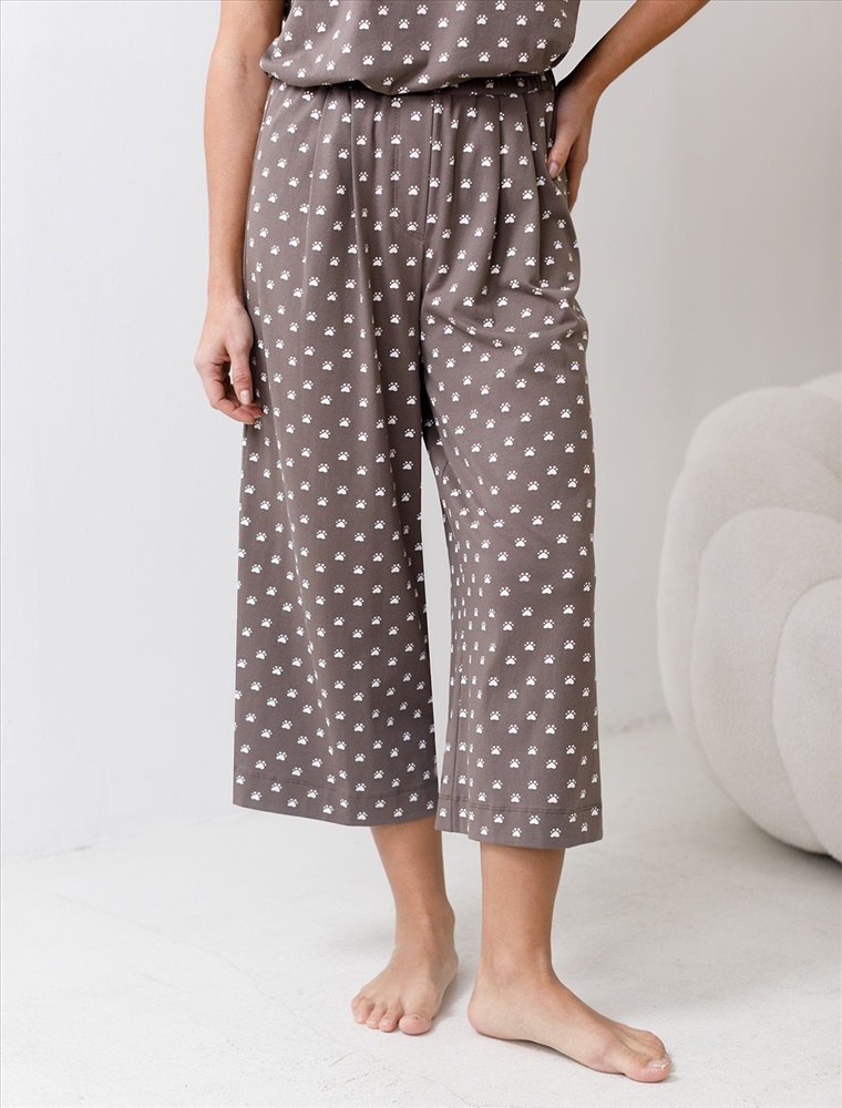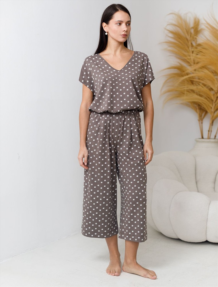 Плотность: 140 Г/м2 Комфортные укороченные широкие брюки кофейно-белого цвета на тонкой резинке выполнены из 100% хлопка плотностью 140 Г/м2. Главная особенность этого изделия — тонкое кулирное полотно, которое легче и воздушнее стандартного трикотажа. Благодаря своей деликатной текстуре модель идеально подходит для домашних образов и пижамных комплектов. Ткань отлично «дышит», обеспечивая максимальный уют во время сна и отдыха. Эти свободные брюки обеспечивают максимальную свободу движений благодаря широкому крою. Эластичная резинка в области талии гарантирует удобную посадку и индивидуальное прилегание по фигуре. Защипы добавляют выразительность образу и помогают сформировать актуальный силуэт, подчеркивая современные тенденции. Повседневные брюки с принтом в виде лапок подходят для больших размеров, мягко скроют возможные недостатки фигуры, подчеркивая комфорт и стиль. Домашние брюки кюлоты отлично сочетаются с разными вариантами верхней одежды, поэтому их можно носить не только дома, но и на прогулках. Удобные брюки созданы для тех, кто ценит комфорт и практичность без лишних деталей. Рекомендуем сочетать с артикулами: D43.233, D43.234, D49.150, D49.151, D49.152, D49.153, D49.154, D49.157, D49.158, D49.159 Комментарии к товару