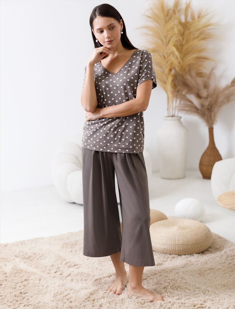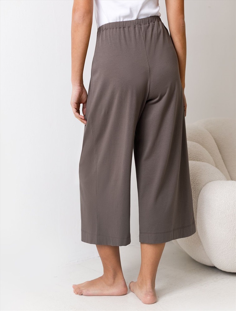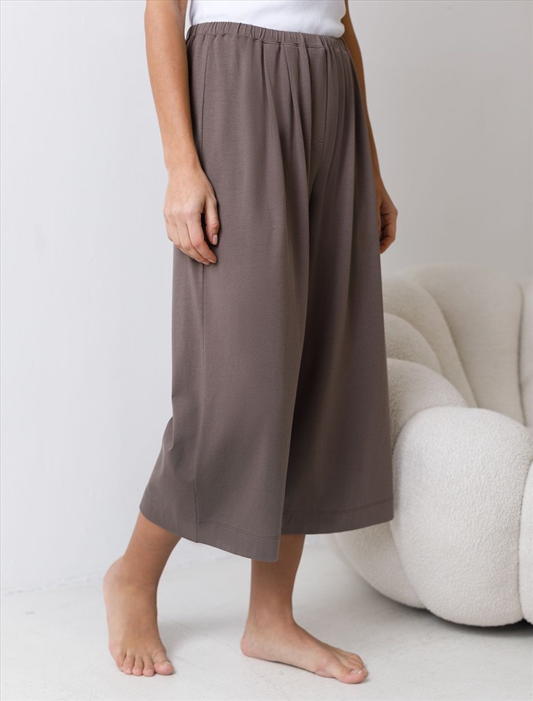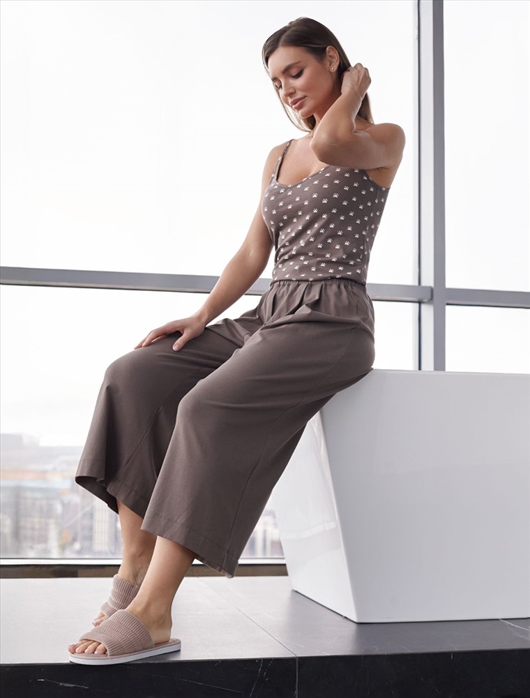 Плотность: 140 Г/м2 Комфортные укороченные широкие брюки кофейного цвета на тонкой резинке выполнены из 100% хлопка плотностью 140 Г/м2. Главная особенность этого изделия — тонкое кулирное полотно, которое легче и воздушнее стандартного трикотажа. Благодаря своей деликатной текстуре модель идеально подходит для домашних образов и пижамных комплектов. Ткань отлично «дышит», обеспечивая максимальный уют во время сна и отдыха. Эти свободные брюки обеспечивают максимальную свободу движений благодаря широкому крою. Эластичная резинка в области талии гарантирует удобную посадку и индивидуальное прилегание по фигуре. Защипы добавляют выразительность образу и помогают сформировать актуальный силуэт, подчеркивая современные тенденции. Повседневные брюки подходят для больших размеров, мягко скроют возможные недостатки фигуры, подчеркивая комфорт и стиль. Домашние брюки кюлоты отлично сочетаются с разными вариантами верхней одежды, поэтому их можно носить не только дома, но и на прогулках. Удобные брюки созданы для тех, кто ценит комфорт и практичность без лишних деталей. Рекомендуем сочетать с артикулами: D43.233, D43.234, D49.150, D49.151, D49.152, D49.153, D49.154, D49.157, D49.158, D49.159 Комментарии к товару