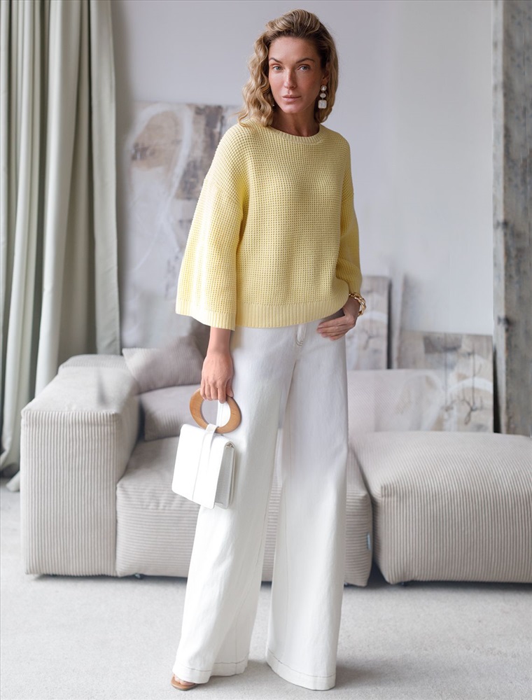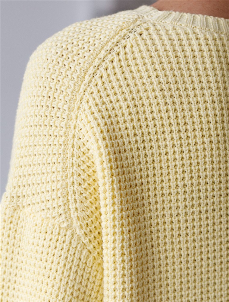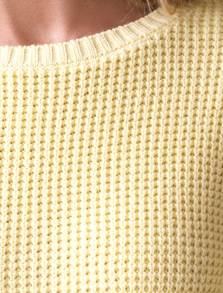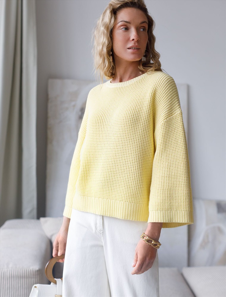 Стильный укороченный джемпер светло-желтого цвета создан для тех, кто ценит современный образ и комфорт. Свободный крой подчеркивает легкость и позволяет чувствовать себя уютно в любой ситуации. Рельефная вязка в виде оригинального узора "шашечки" добавляет джемперу выразительности. Благодаря натуральному хлопку повседневный джемпер обеспечивает комфорт даже в жаркие дни: хлопок позволяет коже дышать и поддерживает оптимальный микроклимат. А акрил в составе придает мягкость, отличную цветостойкость, а также гипоаллергенность и устойчивость к деформации, что делает джемпер легким в уходе. Круглый ворот и спущенная линия плеча добавляют образу аккуратности и расслабленности. Широкие рукава создают воздушность и делают силуэт особенно женственным. Такой джемпер легко сочетать с широкими и узкими низами для создания повседневного или более нарядного ансамбля. Джемпер отлично подойдет для прохладных весенних и летних дней благодаря плотности материала, а также станет удачным решением для многослойных луков. Вязка подчеркивает индивидуальность вещи и привлекает внимание к деталям вашего стиля.