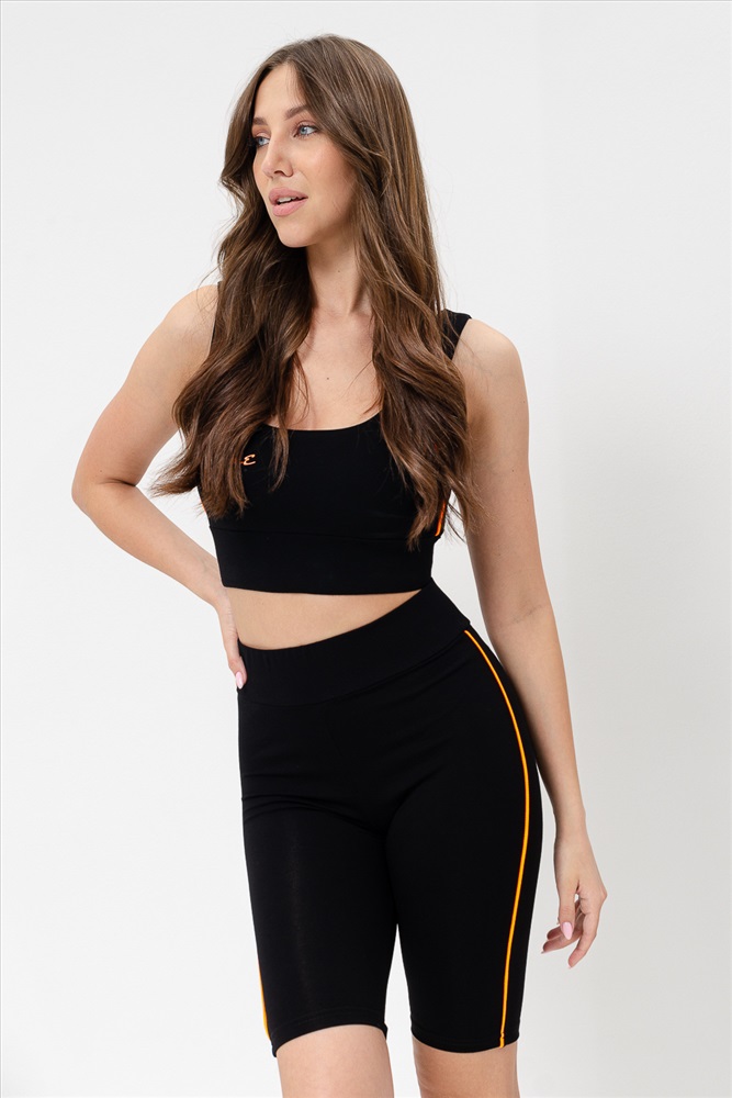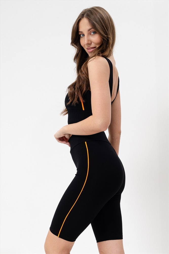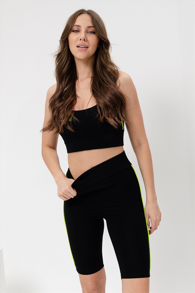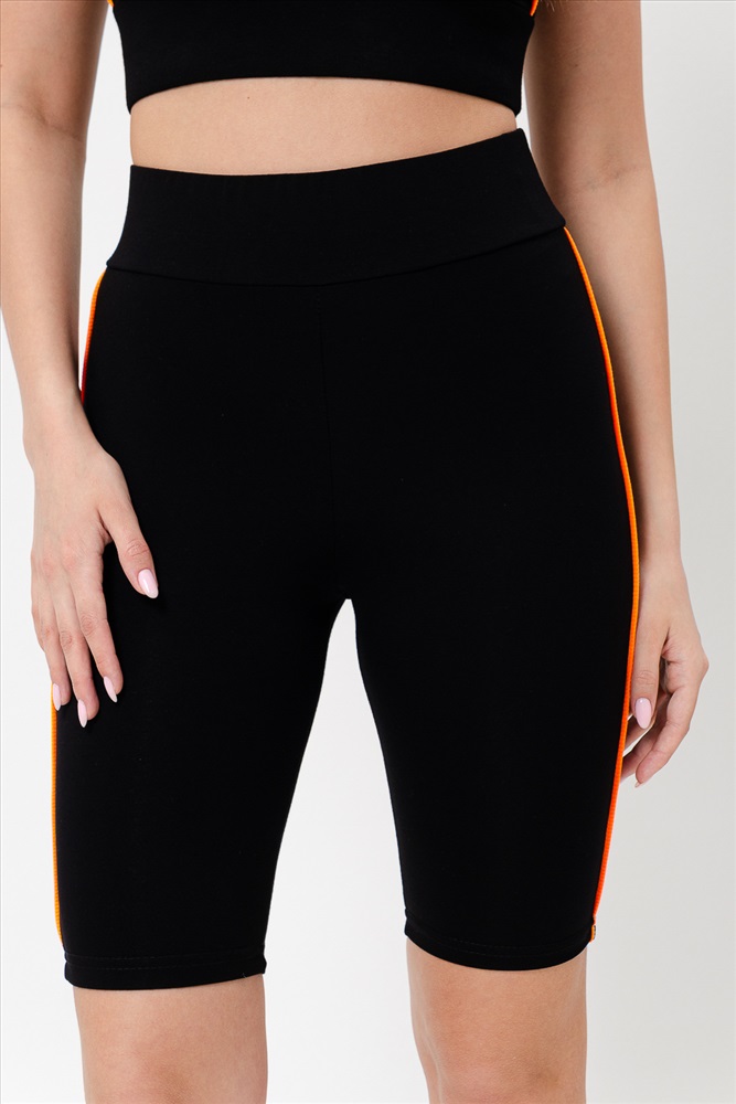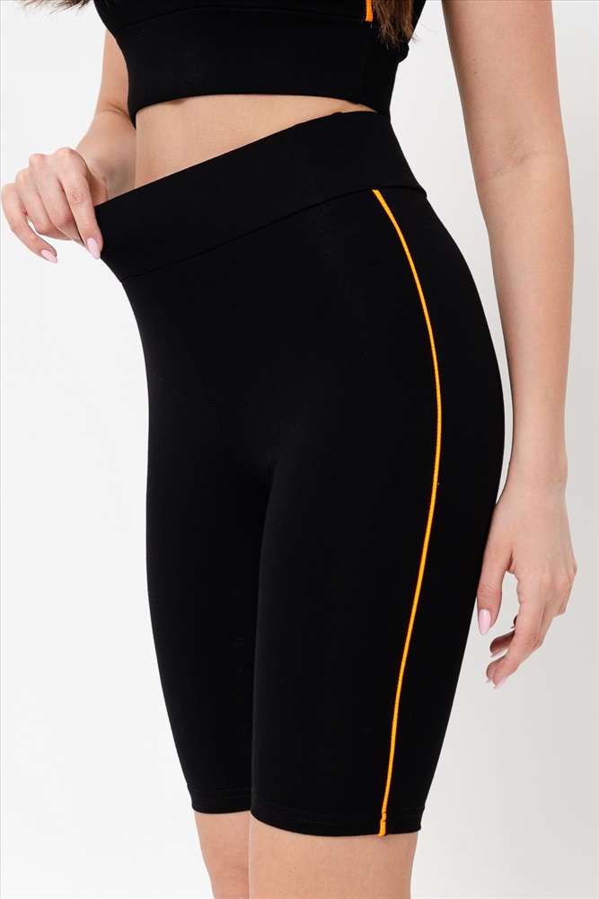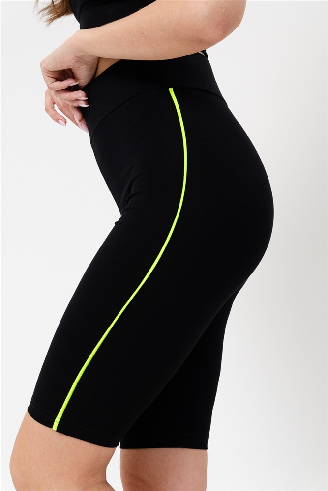 Застежка: без застежки Велосипедки женские, спортивные, с ярким кантом в боковых швах, на широком эластичном поясе.
