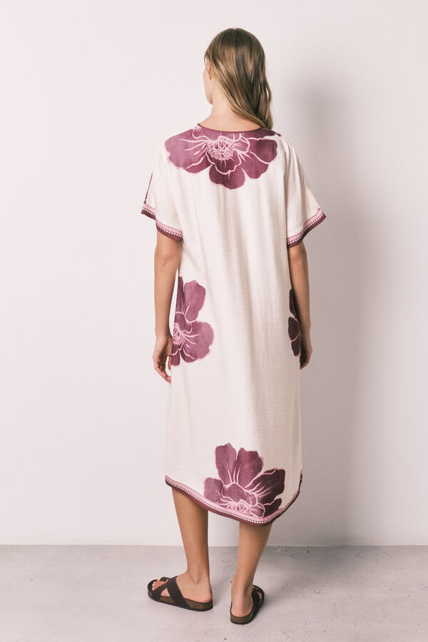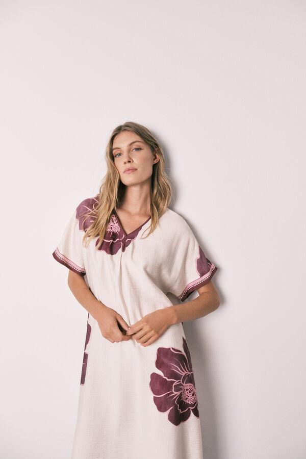 Vestido largo estampado, confeccionado en tejido entrelazado con acabado suavizado, con escote de pico envivado con frunces, y detalle de cenefa en las mangas y el bajo. Ideal para tus looks de calle, playa o piscina. Perfecto In&Out.