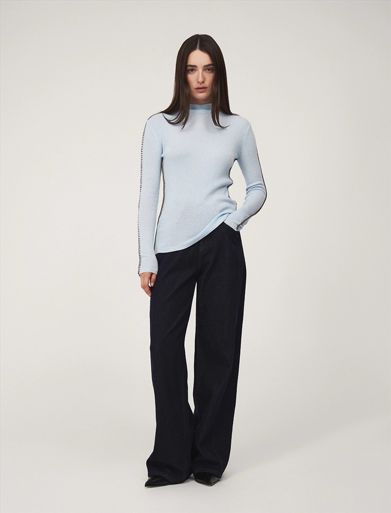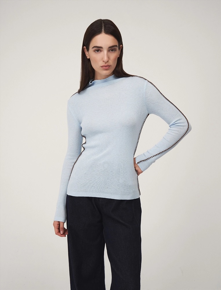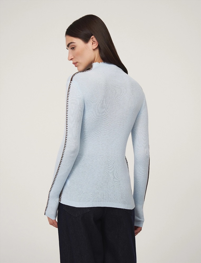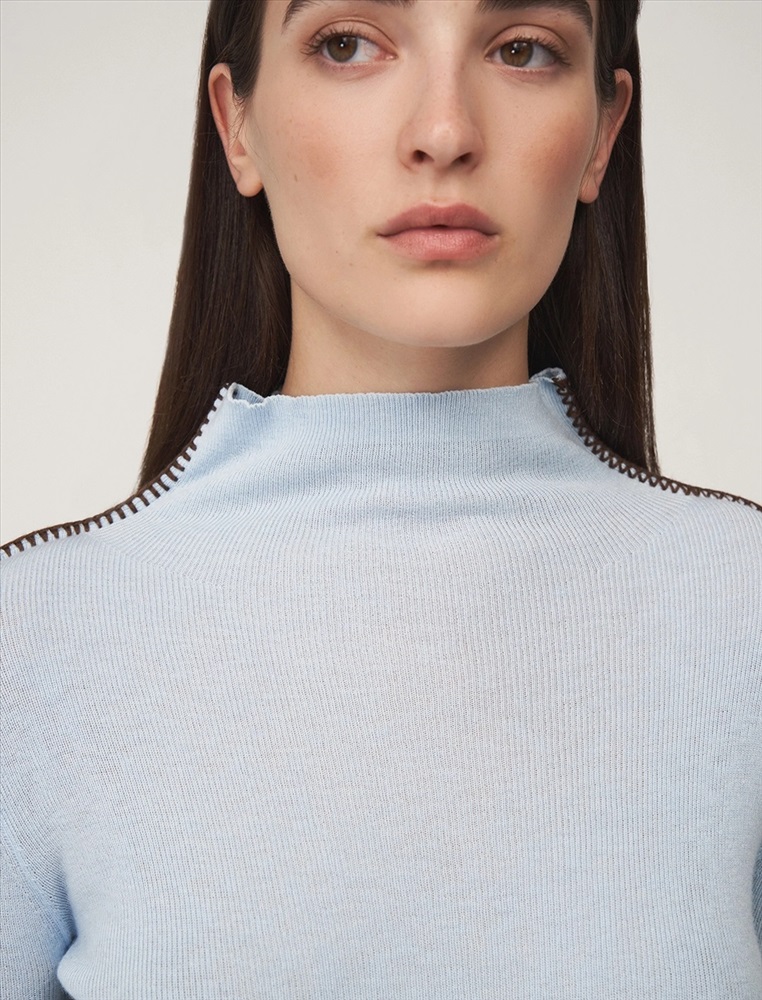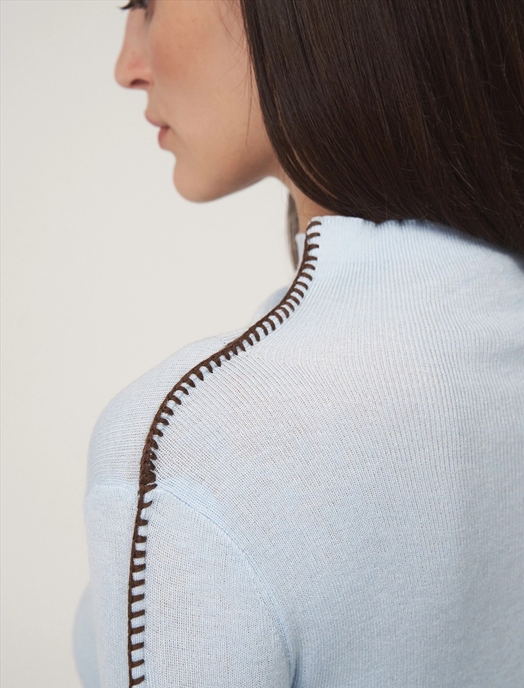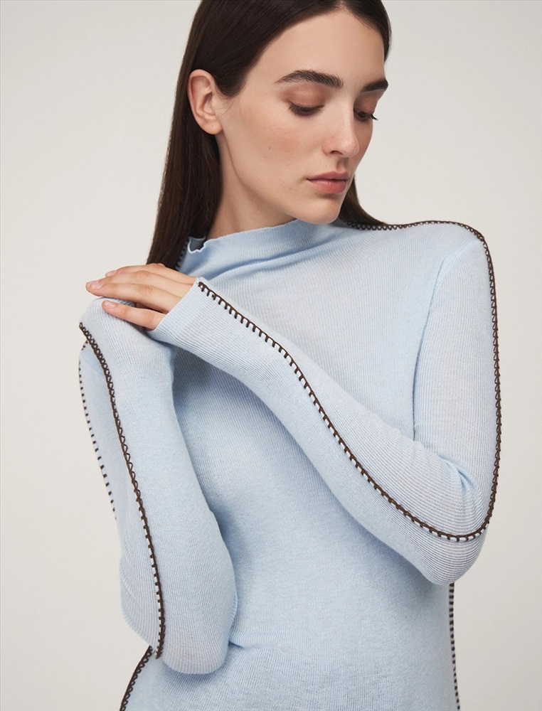 Вязаная водолазка прилегающего силуэта с длинным рукавом и воротником-стойкой. По боковым и внешним швам рукавов – декоративная обработка, визуально напоминающая сметанные вручную нити. Выполнен из хлопка и акрила с добавлением кашемира и шелка, что обеспечивает комфорт и тепло. Представлен в коричневом, голубом и бежевом оттенке.