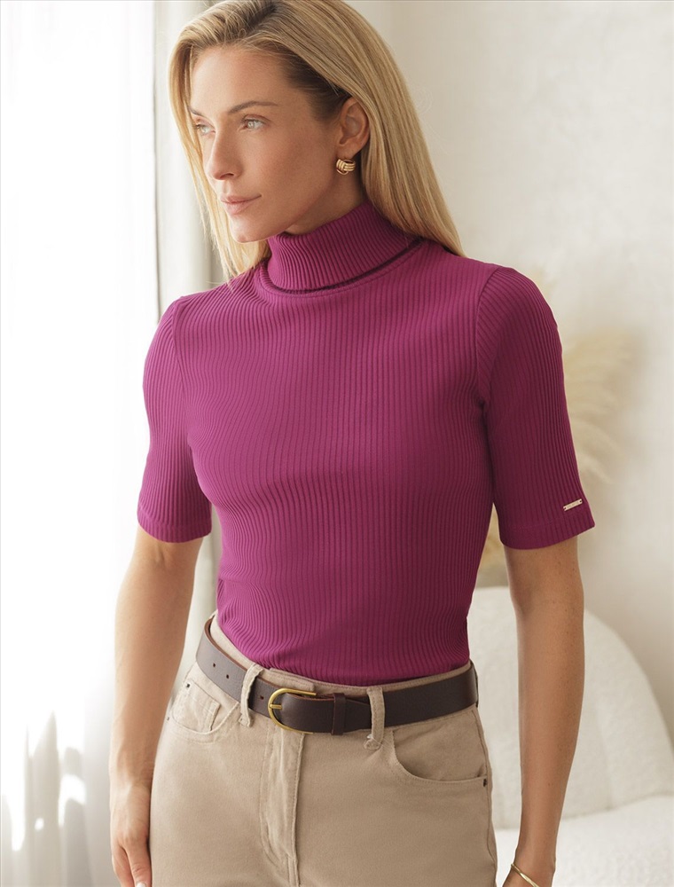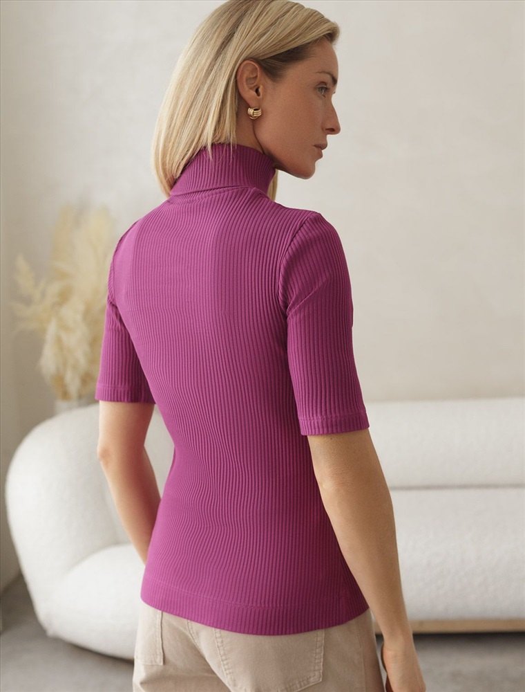 Водолазка с коротким рукавом выполнена из фактурного трикотажа в рубчик. Модель идеально сидит по фигуре не сковывая движения. Хлопковый трикотаж поддерживает оптимальную температуру тела, поэтому в изделии будет комфортно в течении всего дня. Наличие эластана в составе гарантирует формоустойчивости. Водолазка отлично впишется в деловой дресс-код и подойдет для повседневного аутфита.