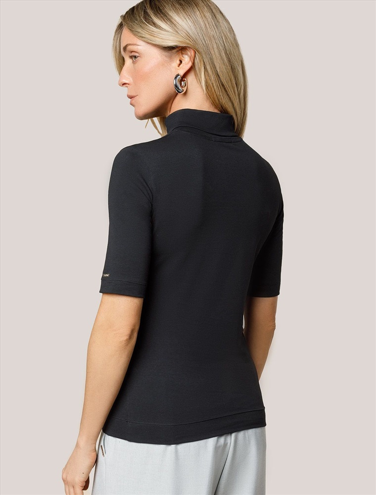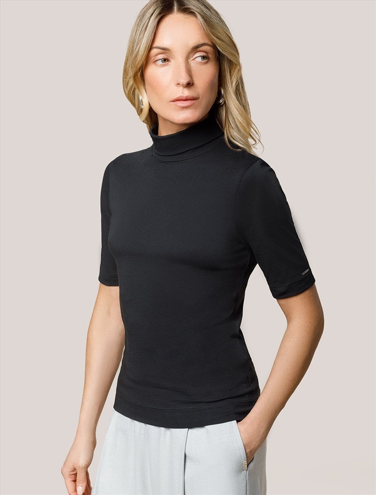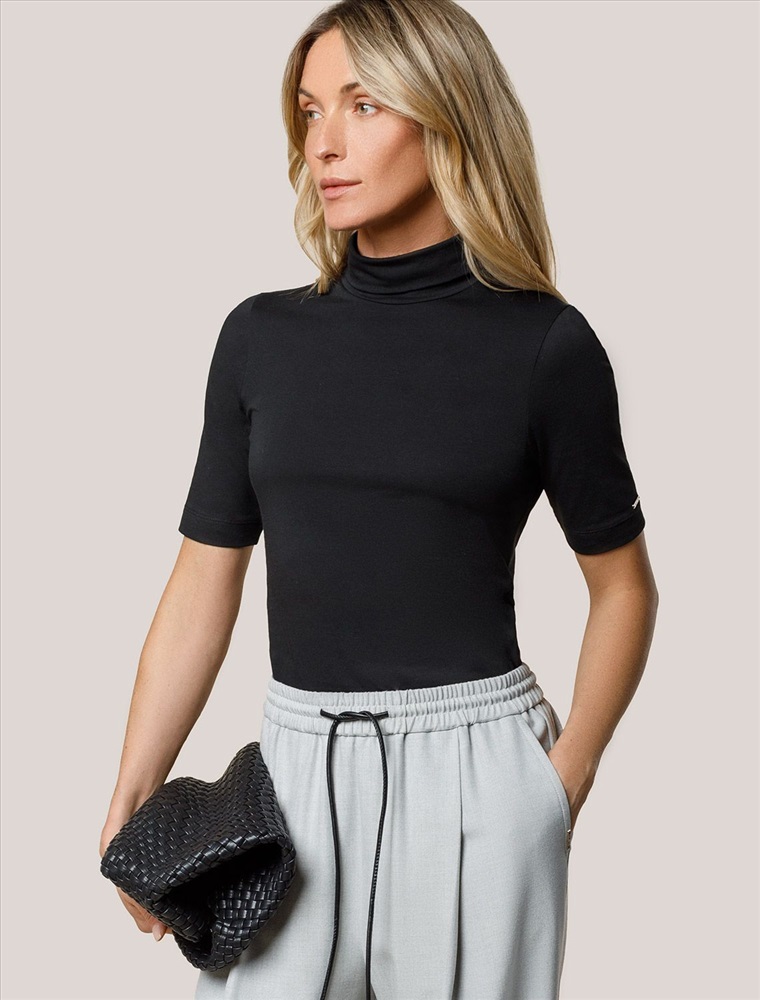 Водолазка с коротким рукавом выполнена из премиального хлопка с добавлением эластана. Гладкий трикотаж обеспечит гарантированный комфорт и удобство в использовании. Внизу изделия металлическая нашивка с логотипом бренда. Совет стилиста: водолазка может заменить рубашку в нестрогом офисном образе или подружиться с джинсами-трубами, жилетом и кедами в расслабленном повседневном наряде.