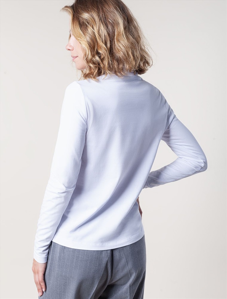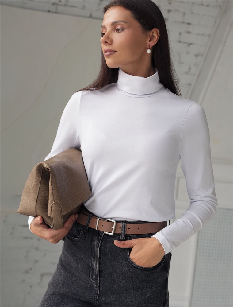 Параметры модели на первом фото: Рост 168, бюст 80, талия 60, бедра 90 Водолазка сшита из премиального мягкого хлопка. Эластичный приятный на ощупь материал делает модель комфортной и не ограничивающей свободу движений. Из декора — небольшой металлический логотип бренда, внизу изделия. Комментарии к товару