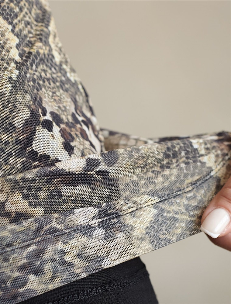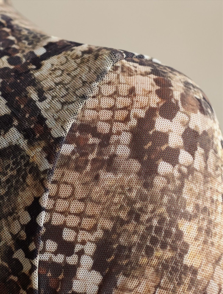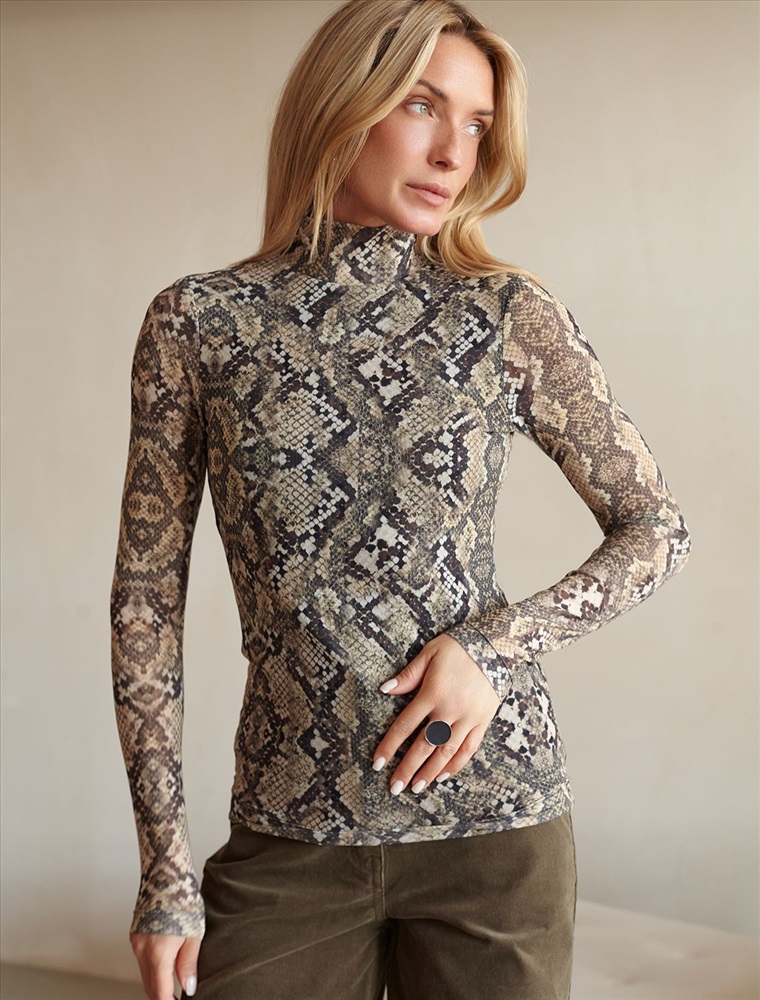 Трендовая модель - водолазка с эффектом змеиной кожи! Вискозное тело с рельефным змеиным принтом сочетается с воздушными сетчатыми рукавами, создавая эффектный контраст. Двойной воротник с отворотом повторяет экзотический узор, позволяя варьировать образ от сдержанного до дерзкого. Практичная вискоза с модным принтом – идеальное решение для тех, кто ценит стиль и комфорт. Змеиный узор делает эту модель особенно актуальной, превращая базовый предмет гардероба в модный акцент!