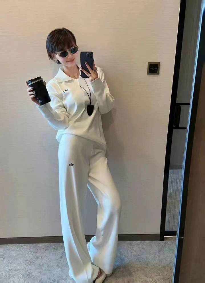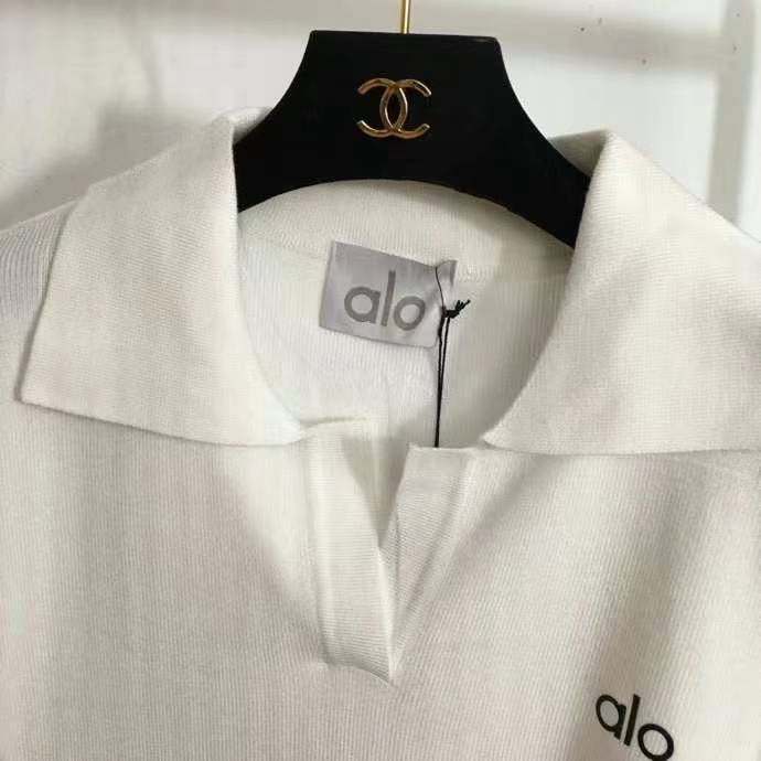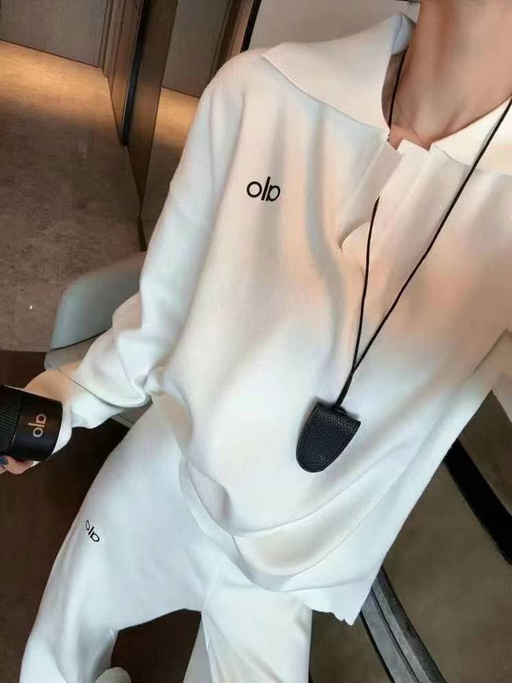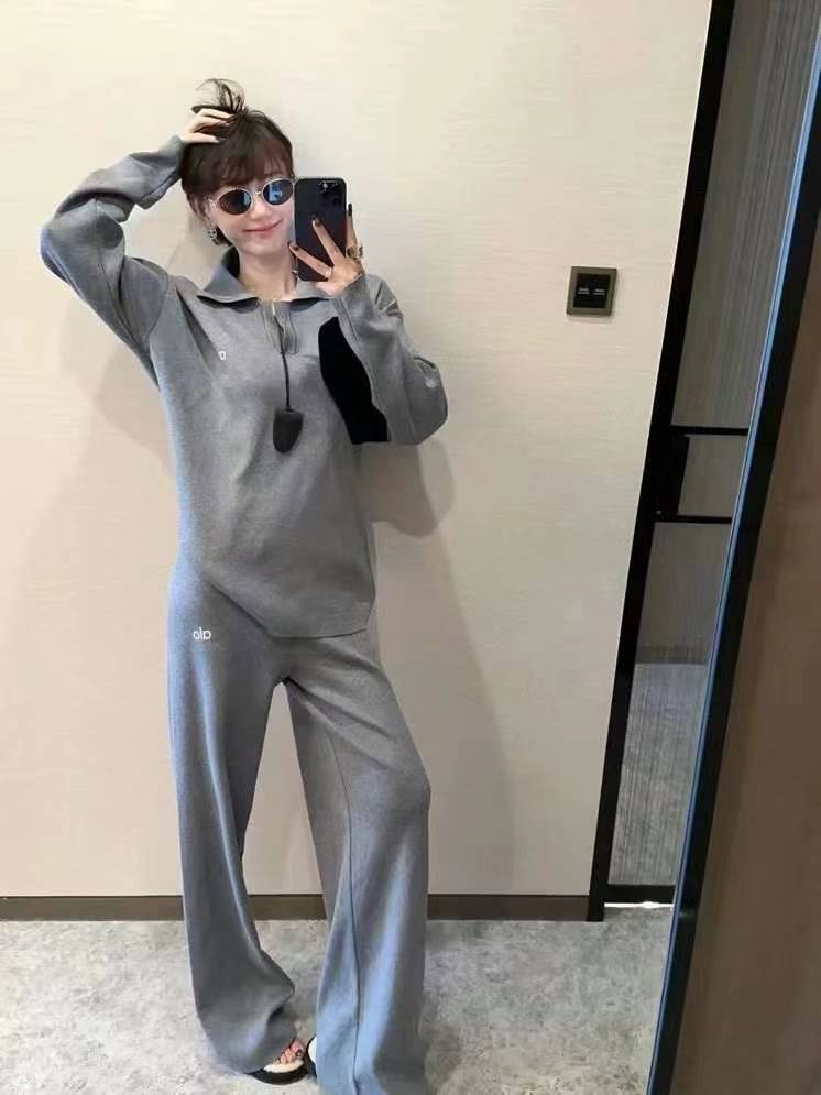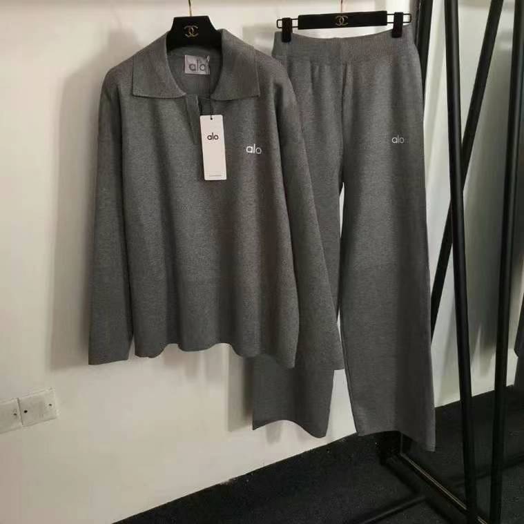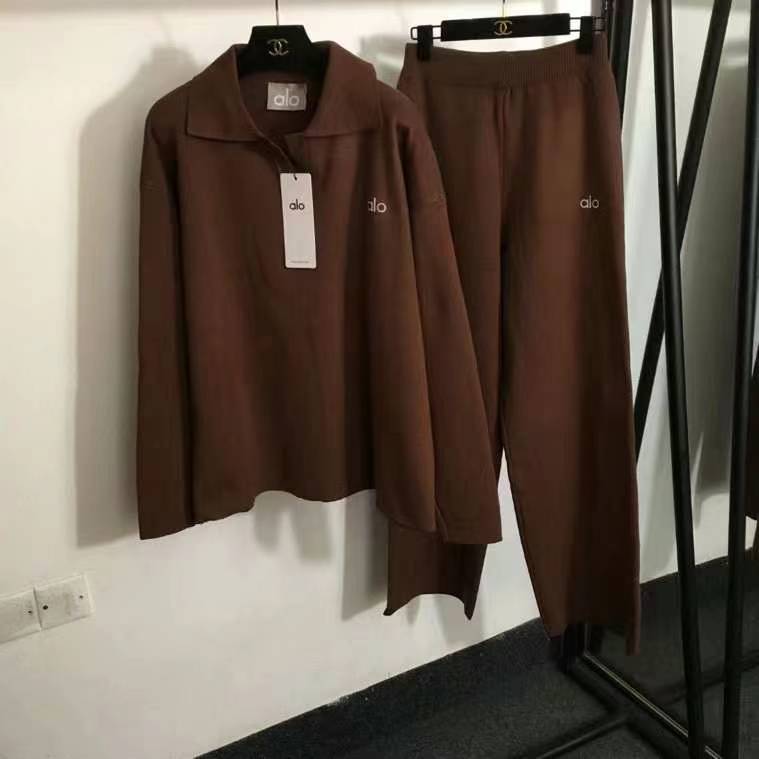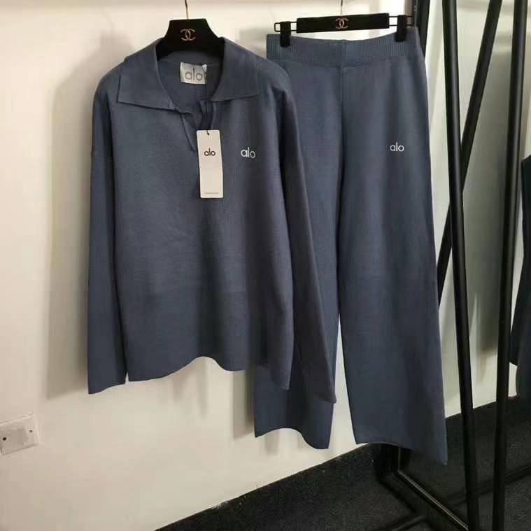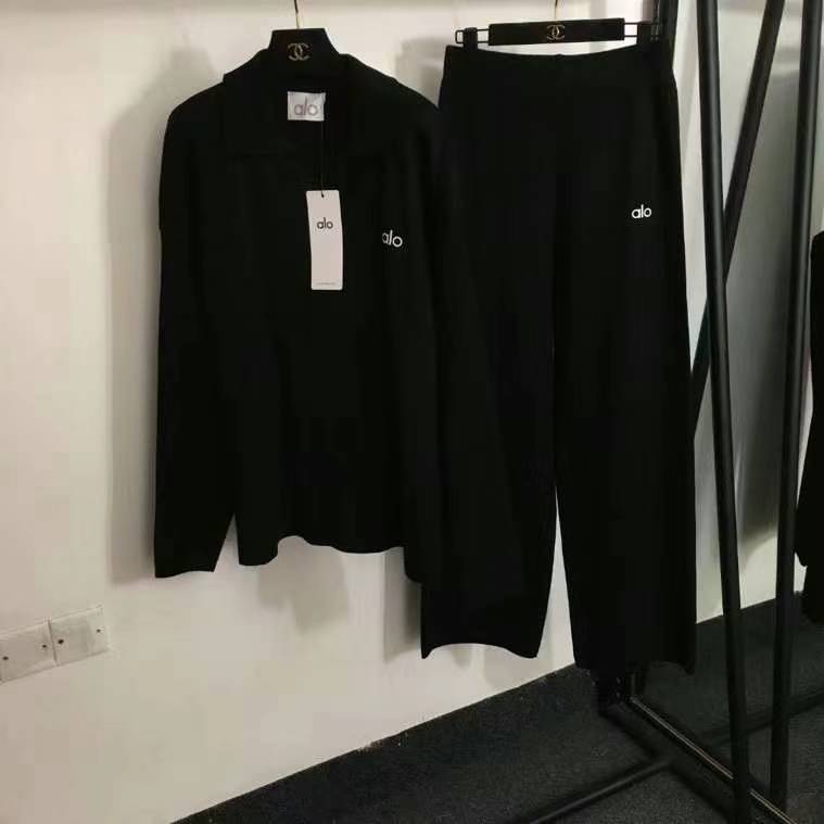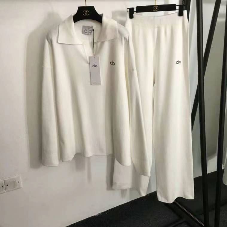 вязаный костюм Alo, пуловер с длинными рукавами и отворотом с логотипом на груди + широкие брюки с высокой талией, черный, белый, синий, серый, кофейный, хаки, 6 цветов, SML, [размер М ] Ширина плеч 63, обхват груди 126, длина рукава 54, длина платья 67, резинка на талии 62, длина 111]