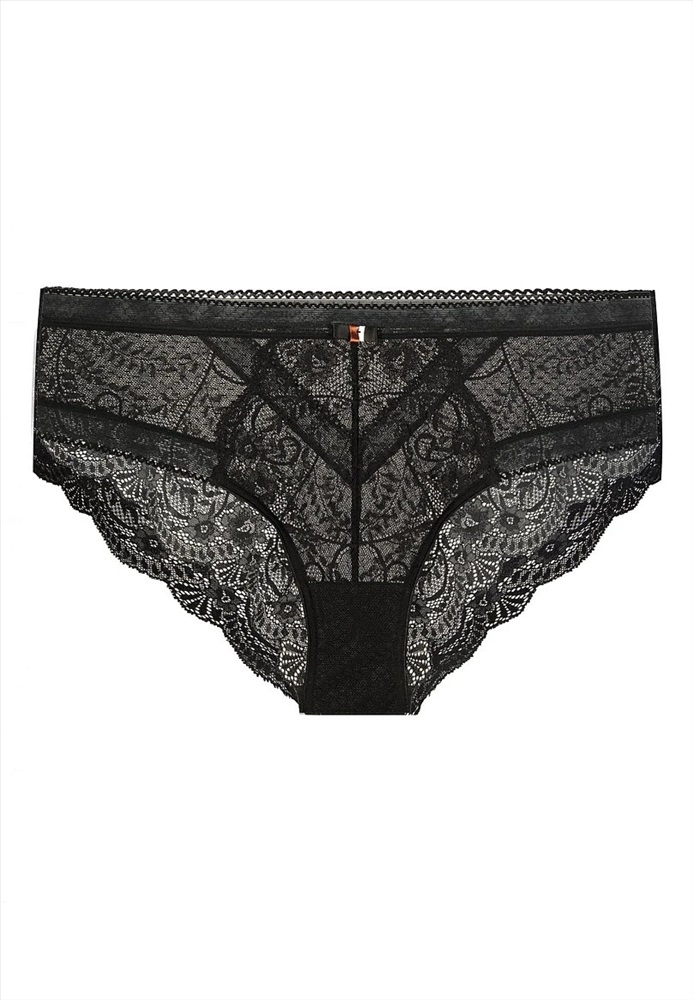 Трусы-бразилиана со средней линией талии. Мягкая эластичная тесьма по верхнему краю. Передняя деталь из кружева. На задней детали кружевные вставки с ажурными краями.