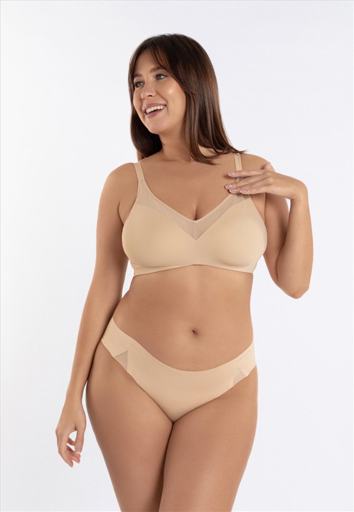 Бескаркасный тонкий бюстгальтер-минимайзер. Формованные мягкие чашки «Spacer», верх чашек выполнен из эластичной
