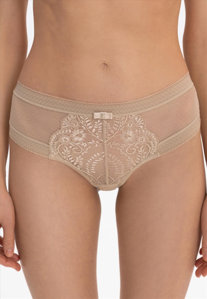 Трусы-бразилиана со средней линией талии. Мягкая эластичная тесьма по верхнему краю. Передняя деталь из кружева. На задней детали кружевные вставки с ажурными краями.