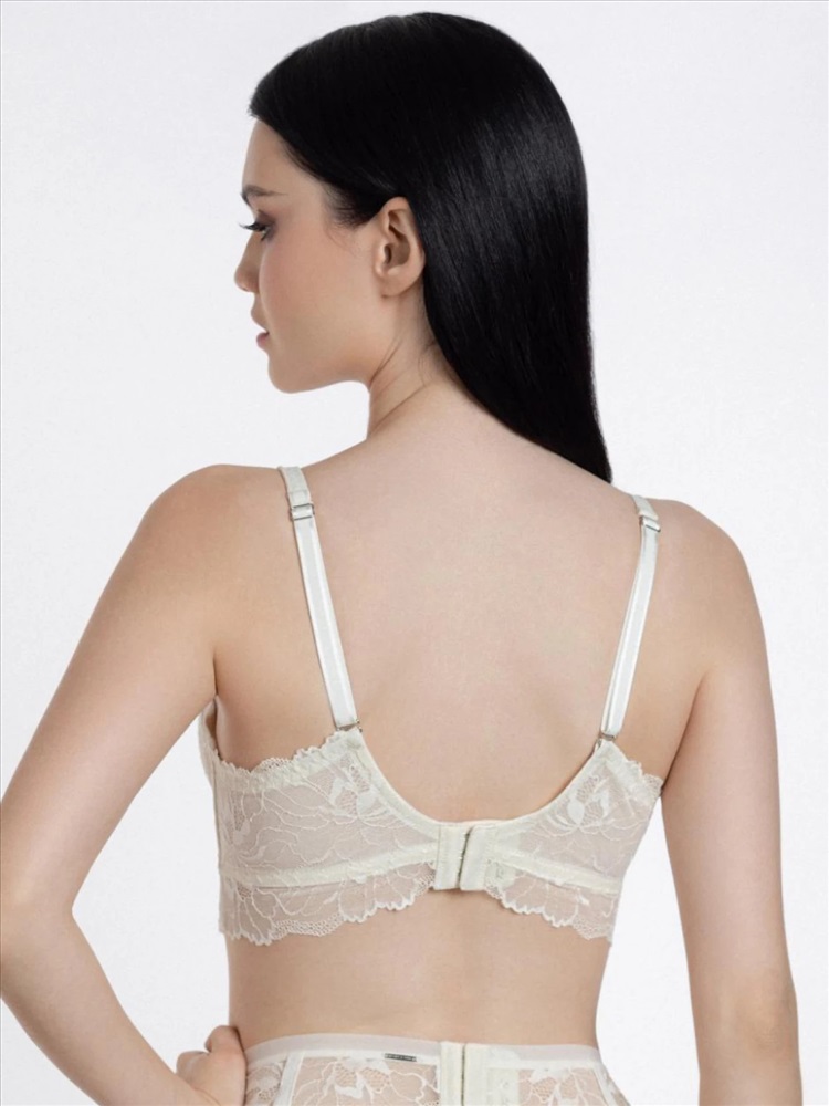 Бюстгальтер с мягкой чашкой на каркасной поддержке. Внутренняя поверхность чашки и широкий стан дублированы эластичной сеткой. Боковые поддерживающие косточки. Бретели на спине отстегиваются. Круглая спинка.