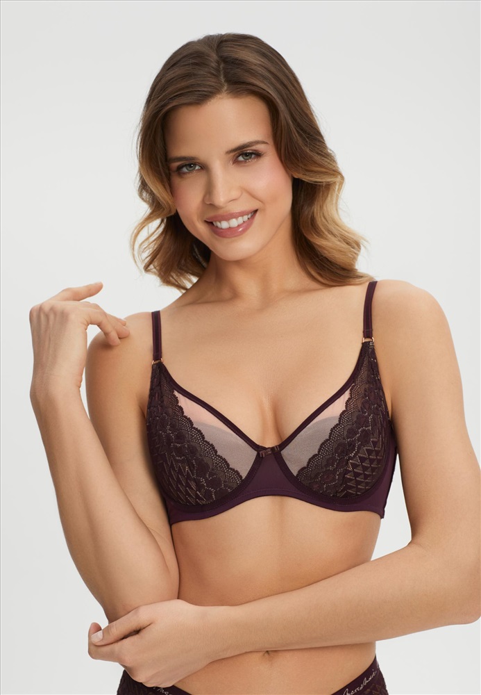 Бюстгальтер с полудублированной поролоновой чашкой на каркасной поддержке. Чашка декорирована эластичным кружевом, с внутренней стороны дублирована хлопком. Стан выполнен из кружева на подкладке из сетки. Боковые косточки.