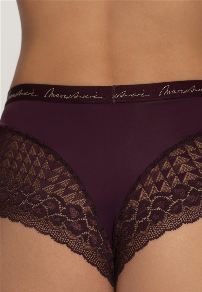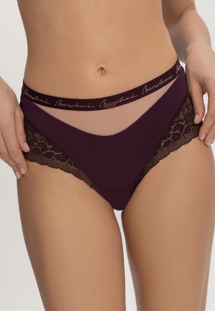 Трусы-бразилиана с завышенной линией талии. Передняя деталь из микрофибры на подкладе из сетки. Задняя деталь – сочетание микрофибры и кружева с ажурными краями. Пояс из эластичной тесьмы с надписью Marc & André.
