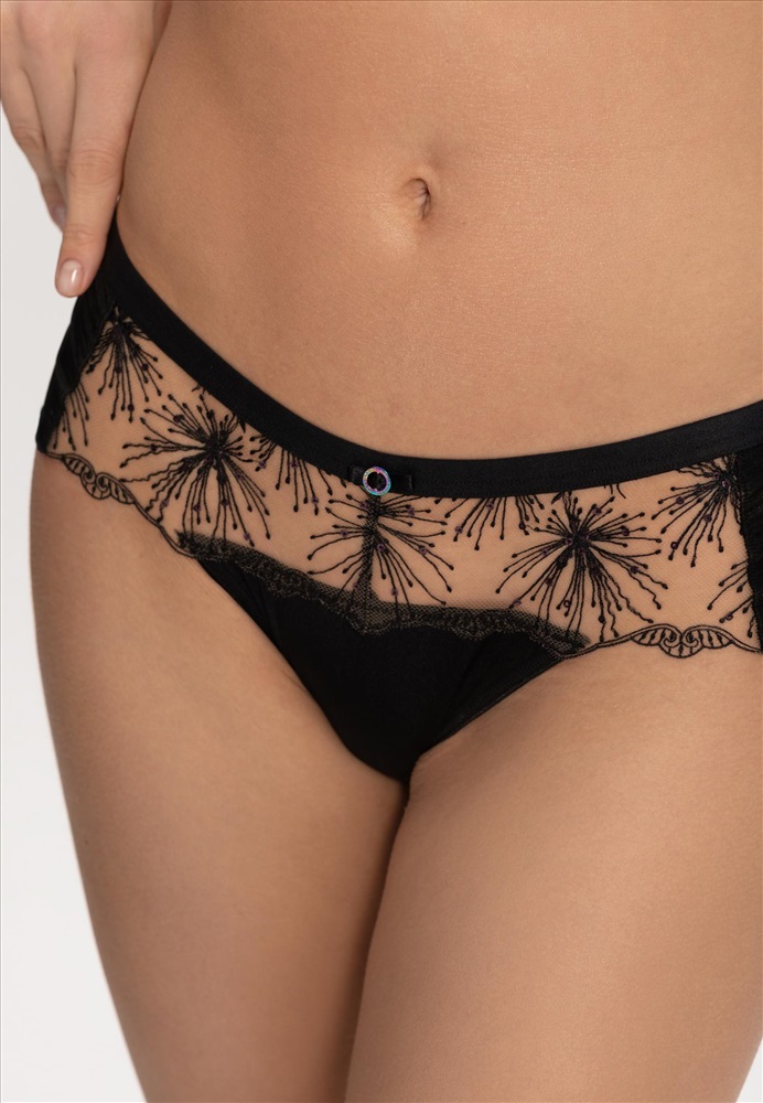 Трусы-бразилиана со средней линией талии. Передняя деталь из вышивки на сетке и микрофибры. Задняя деталь из микрофибры с чистым краем.