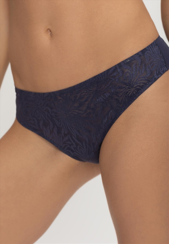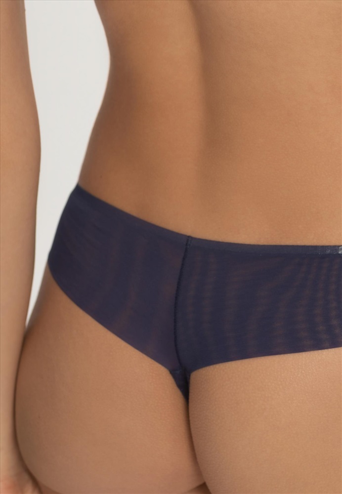Бесшовные трусы-стринги с заниженной линией талии. Передняя деталь из кружева. Задняя деталь из эластичной сетки.
