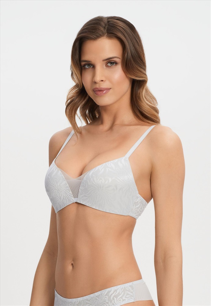 Бескаркасный бесшовный бюстгальтер с формованной чашкой и встроенным «пуш-ап». В конструкции используется ультрагибкий пластик с 3D-технологией, обеспечивающий поддерживающий эффект. Между чашками декоративная вставка из эластичной сетки. Симметричные вставки из сетки на спинке. Сзади на бретелях дополнительный аксессуар с крючком для различных вариантов фиксации бретелей.