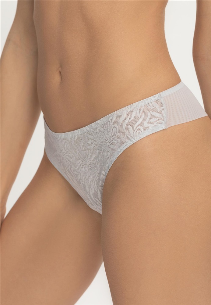 Бесшовные трусы-стринги с заниженной линией талии. Передняя деталь из кружева. Задняя деталь из эластичной сетки. Технология «Sewfree».