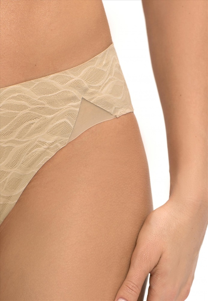 Бесшовные трусы-бразилиана со средней линией талии из кружевного полотна. По бокам декоративные вставки из